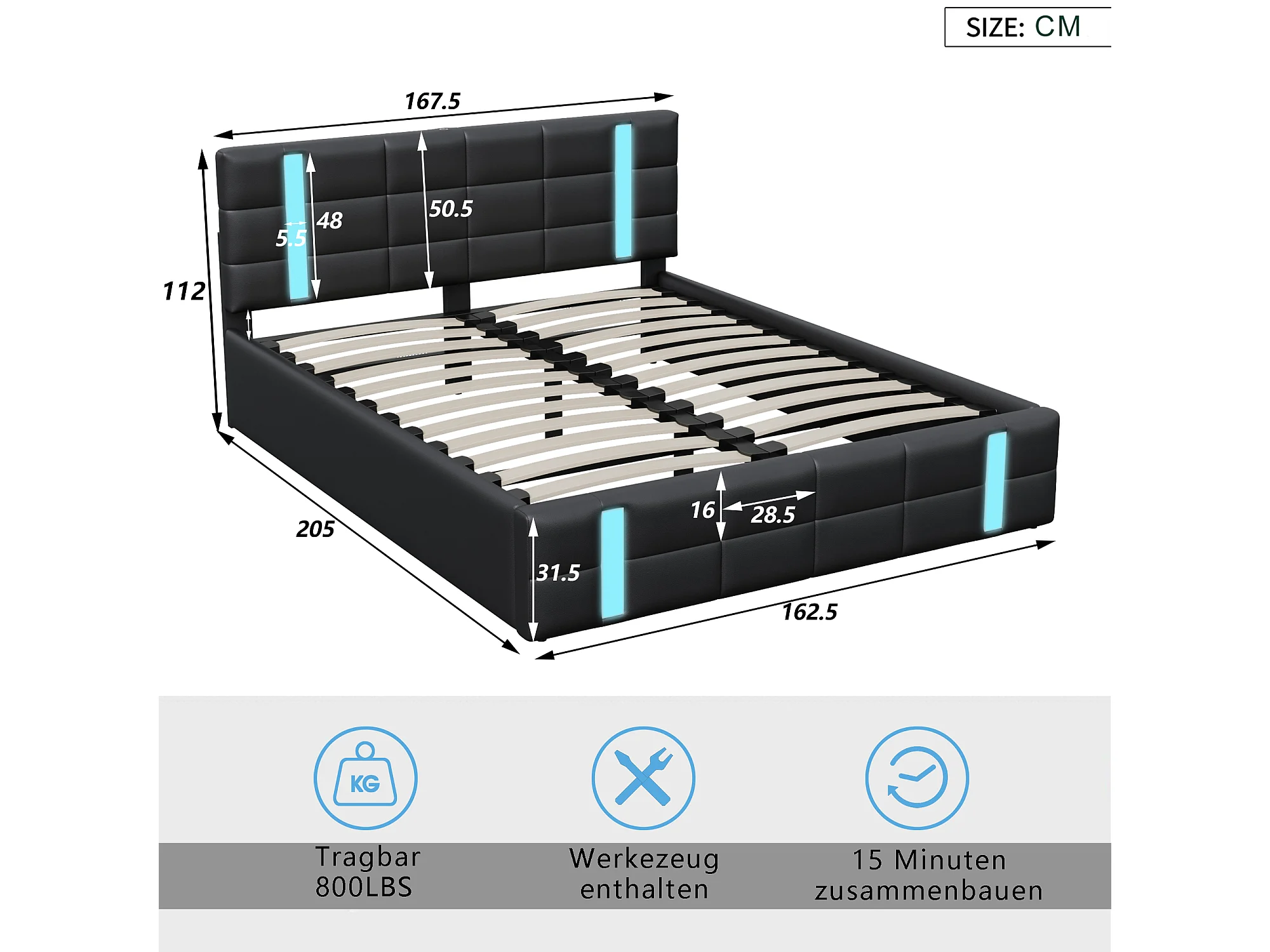 Lit Coffre 160x200 Avec USB Et Type C, Lit Capitonné Avec Sommier à Lattes, Lit Double, Noir