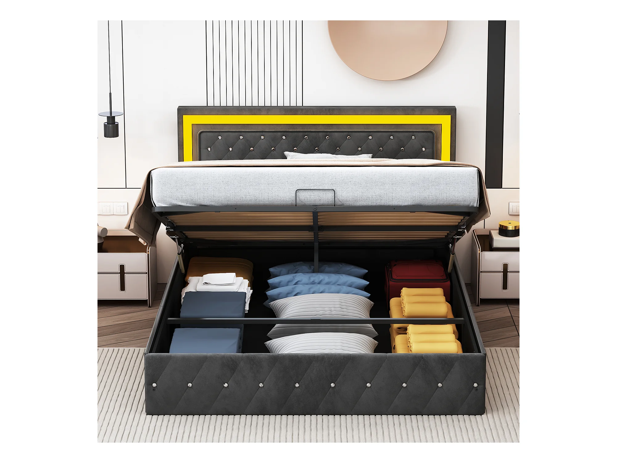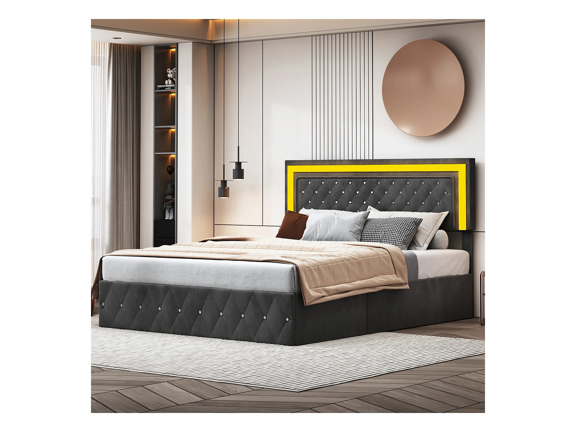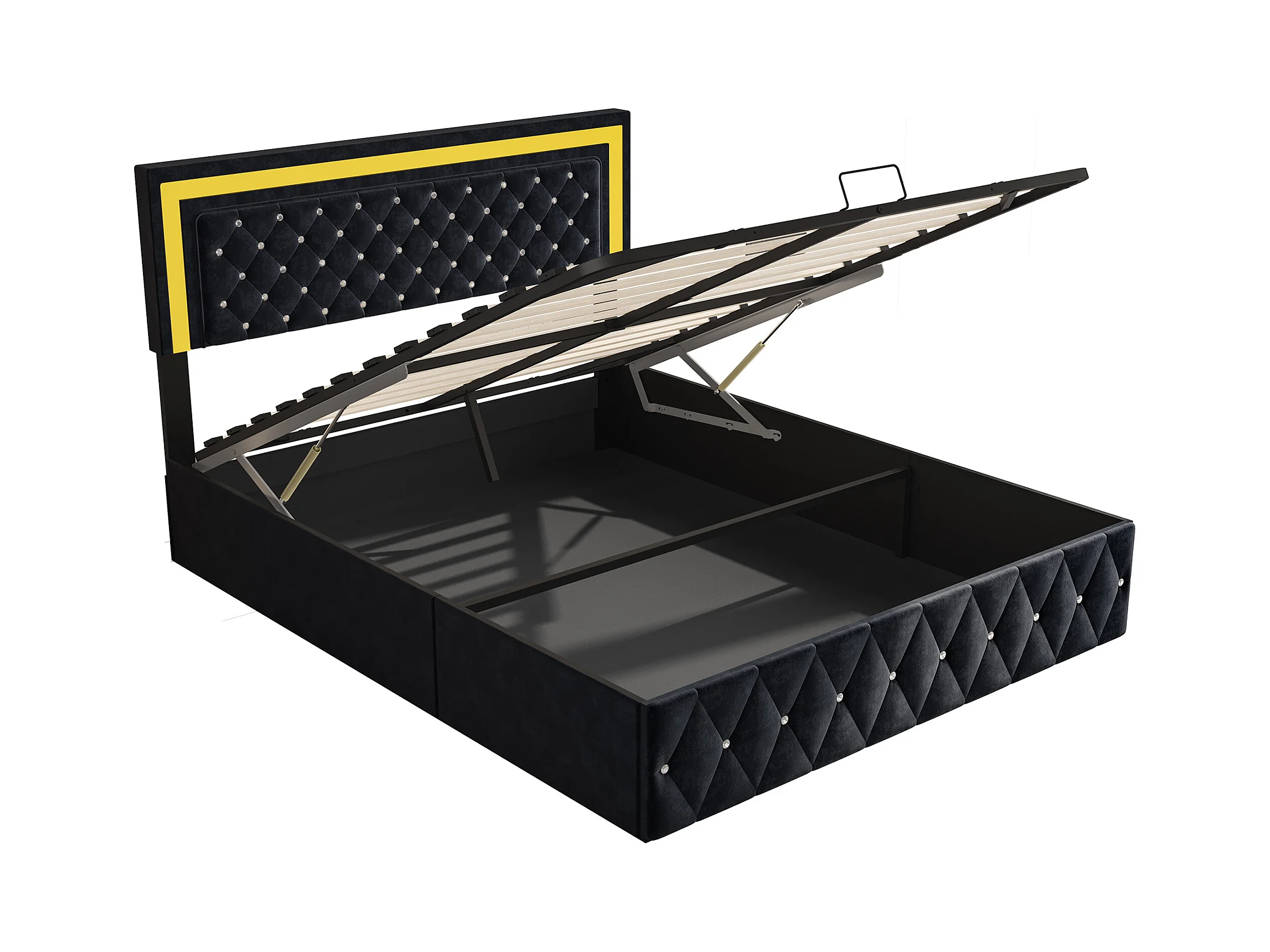 Lit coffre 160x200 cm en velours - avec LED et sommier à lattes - Lit double de rangement - Noir