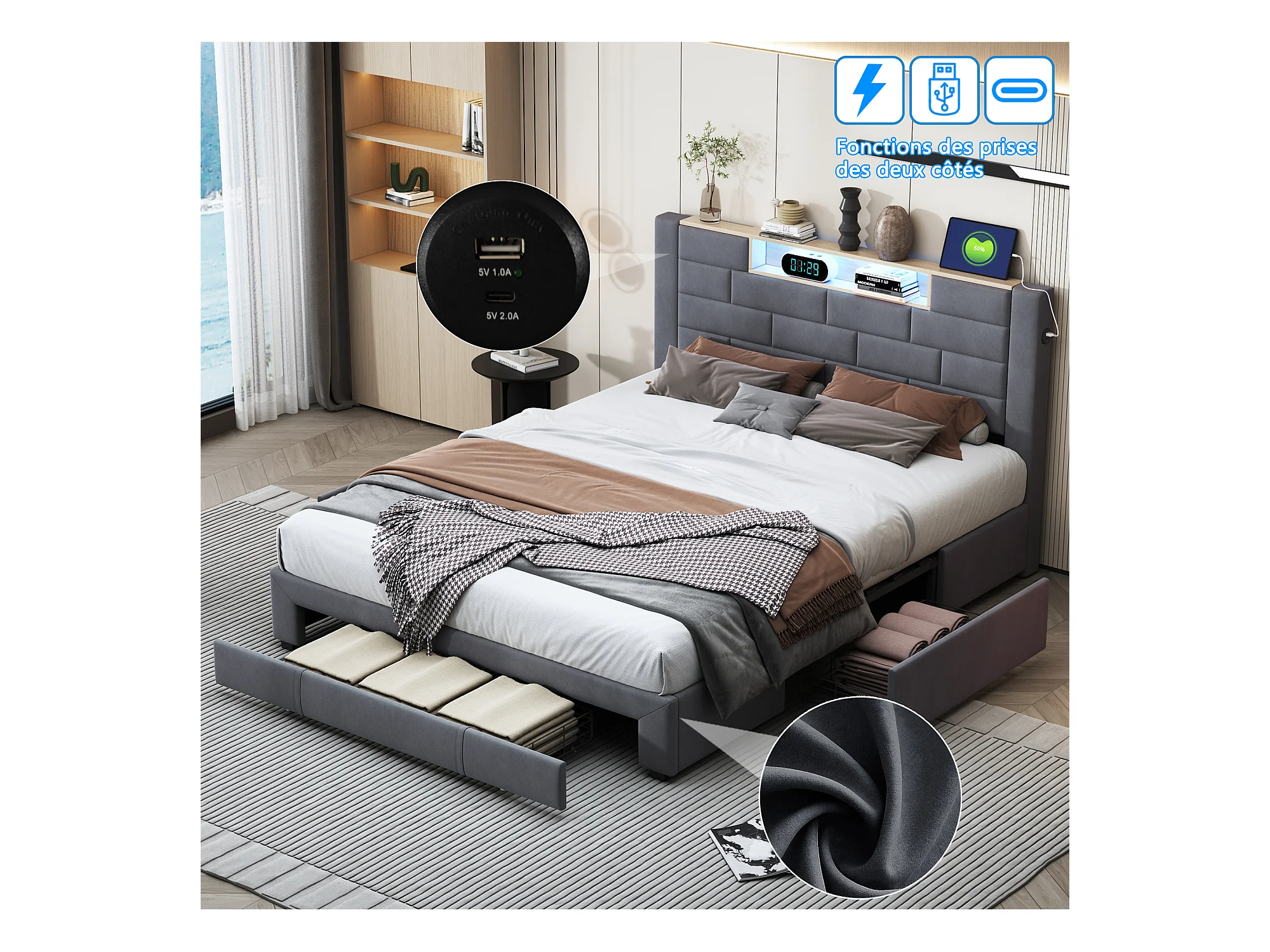 Lit coffre 160x200 cm en velours gris avec vérins hydrauliques, tête de lit LED 7 couleurs, ports USB & Type-C intégrés et tiroirs de rangement