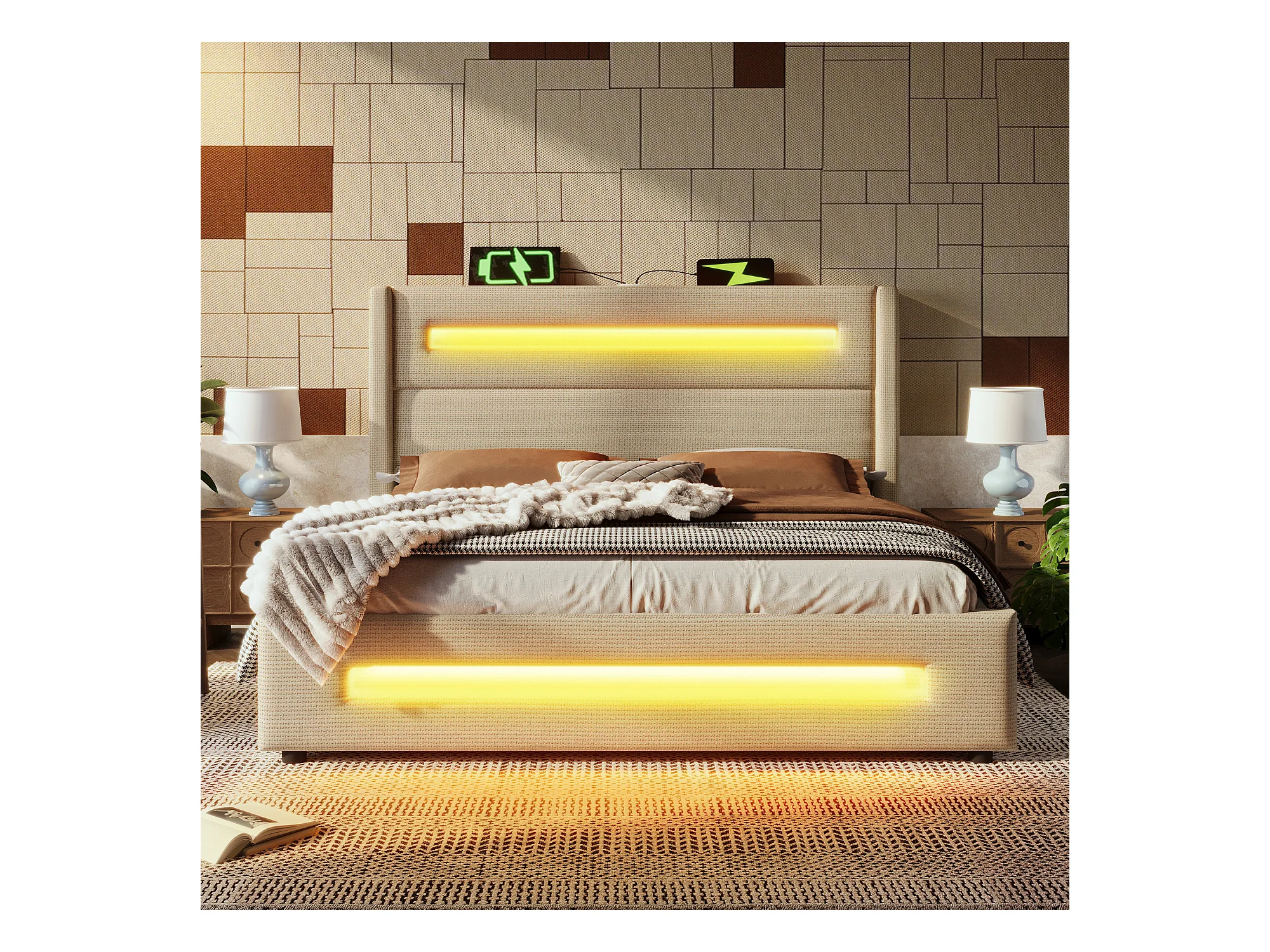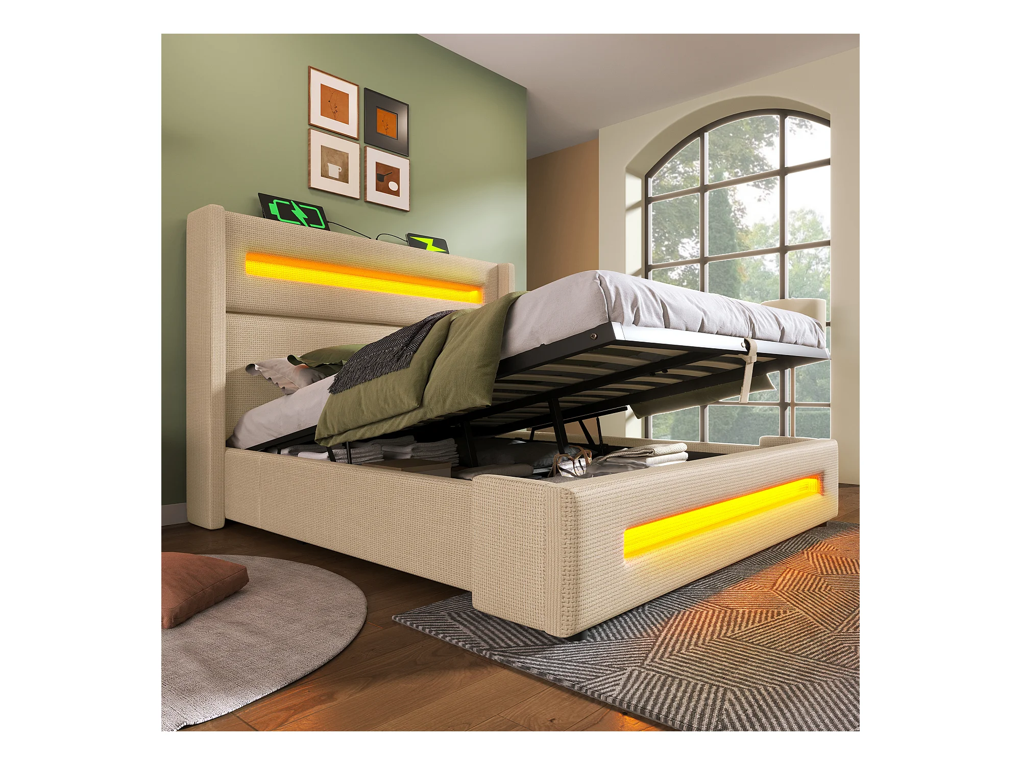 Lit coffre 160x200 cm - Lit adulte avec chargement USB et éclairage LED - lin beige - sans matelas