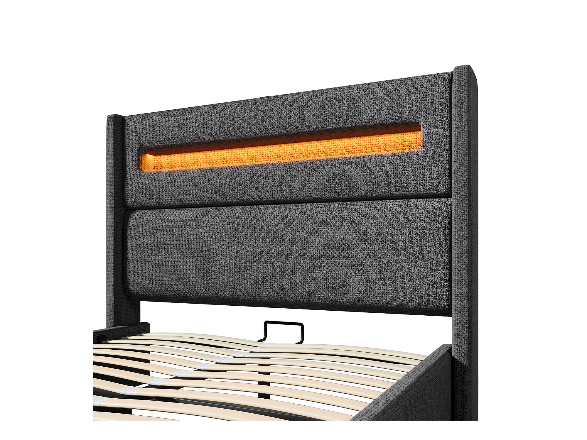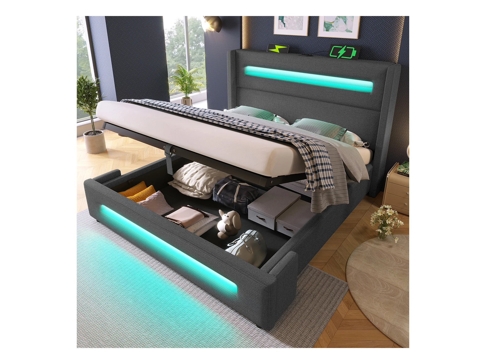 Lit coffre 160x200 cm - Lit adulte avec chargement USB et éclairage LED - lin gris - sans matelas