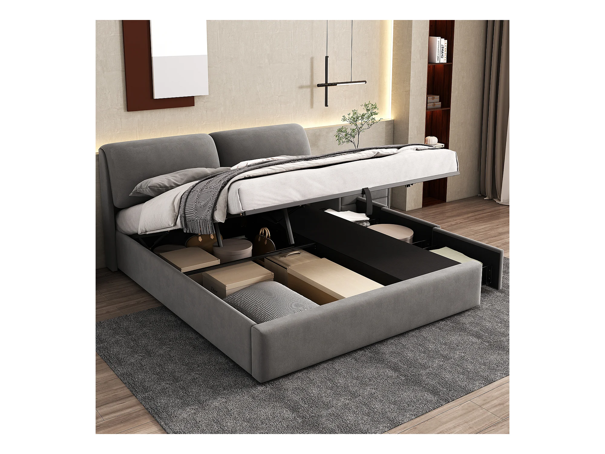 Lit coffre 160x200 cm - Lit adulte avec 3 tiroirs, coffres de rangement et tête de lit - Velours - Gris