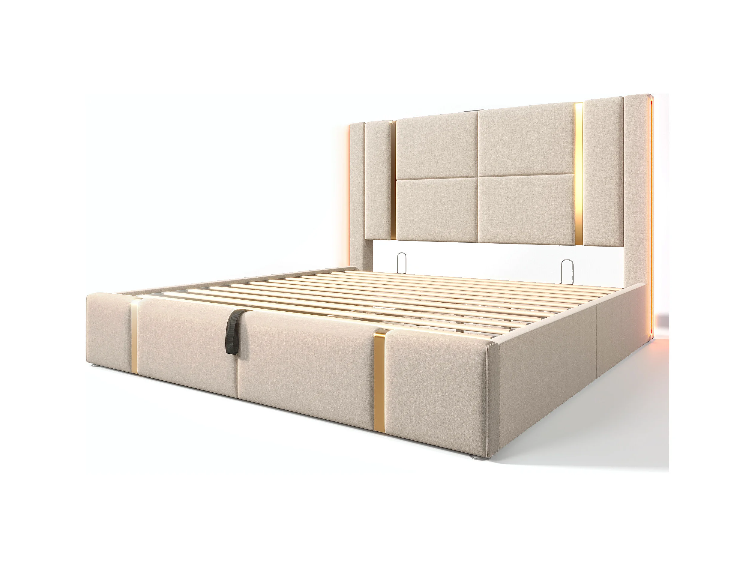 Lit coffre 160x200 cm - lit adulte avec chargement USB Type C et LED - lin - beige - sans matelas