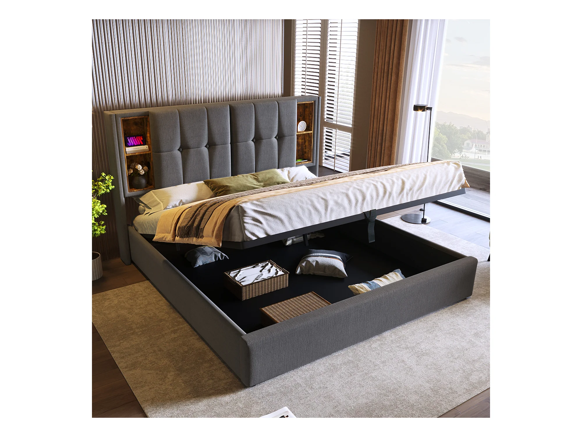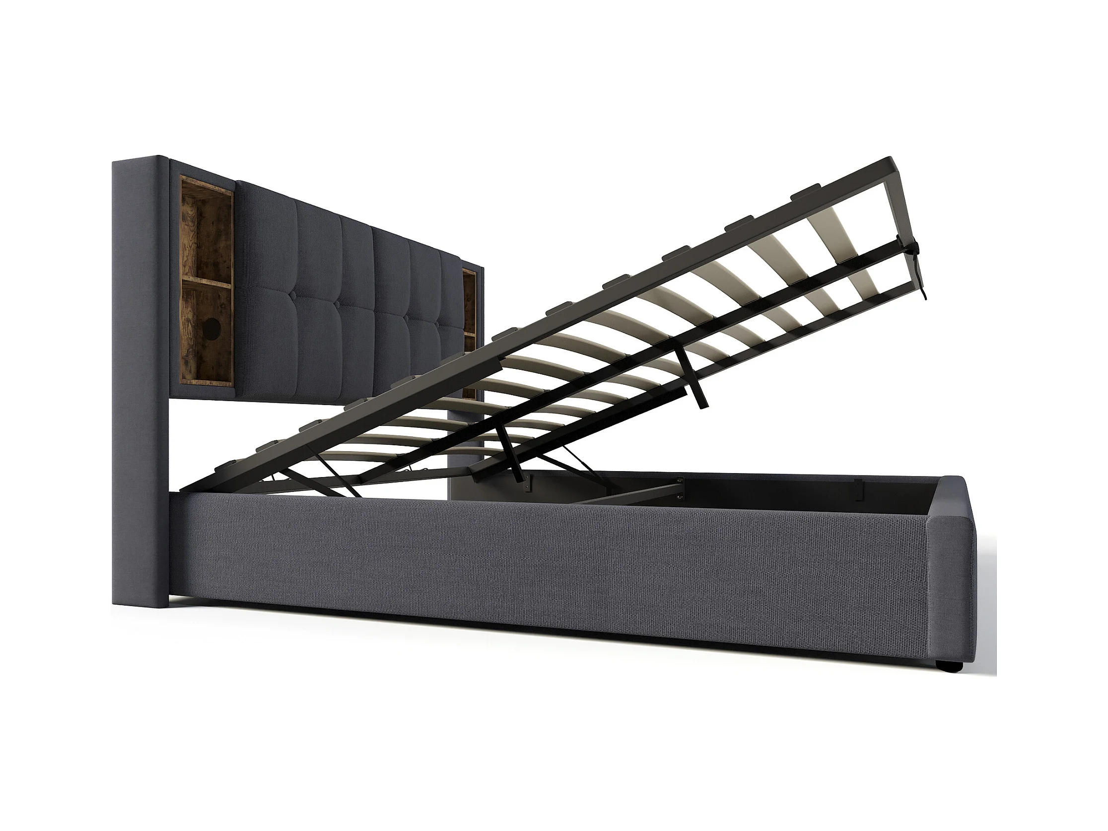Lit coffre 160x200 cm - lit adulte avec recharge sans fil USB C - coton - gris