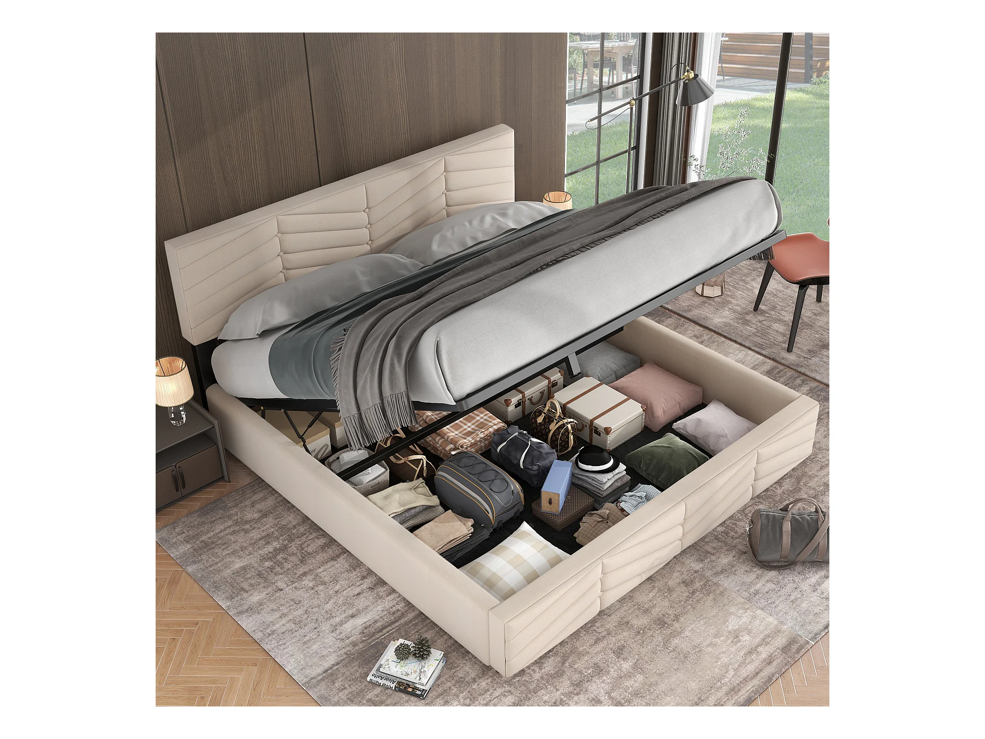 Lit coffre 160x200 cm - Lit adulte avec tête de lit réglable en hauteur - Style rayé - Velours - Beige