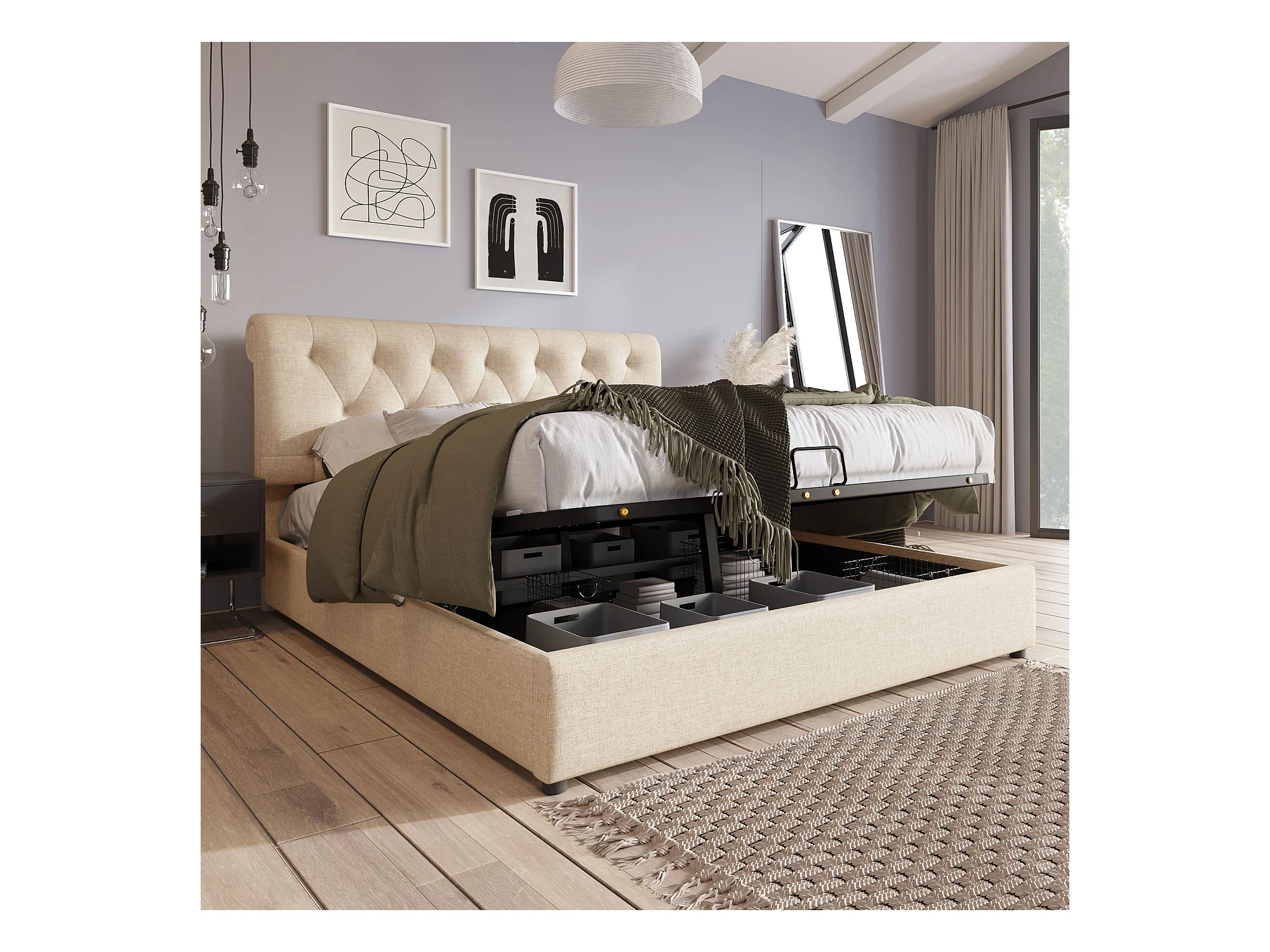 Lit coffre 160x200 cm - lit double avec tête de lit réglable - structure métal - lin - coloris naturel - sans matelas