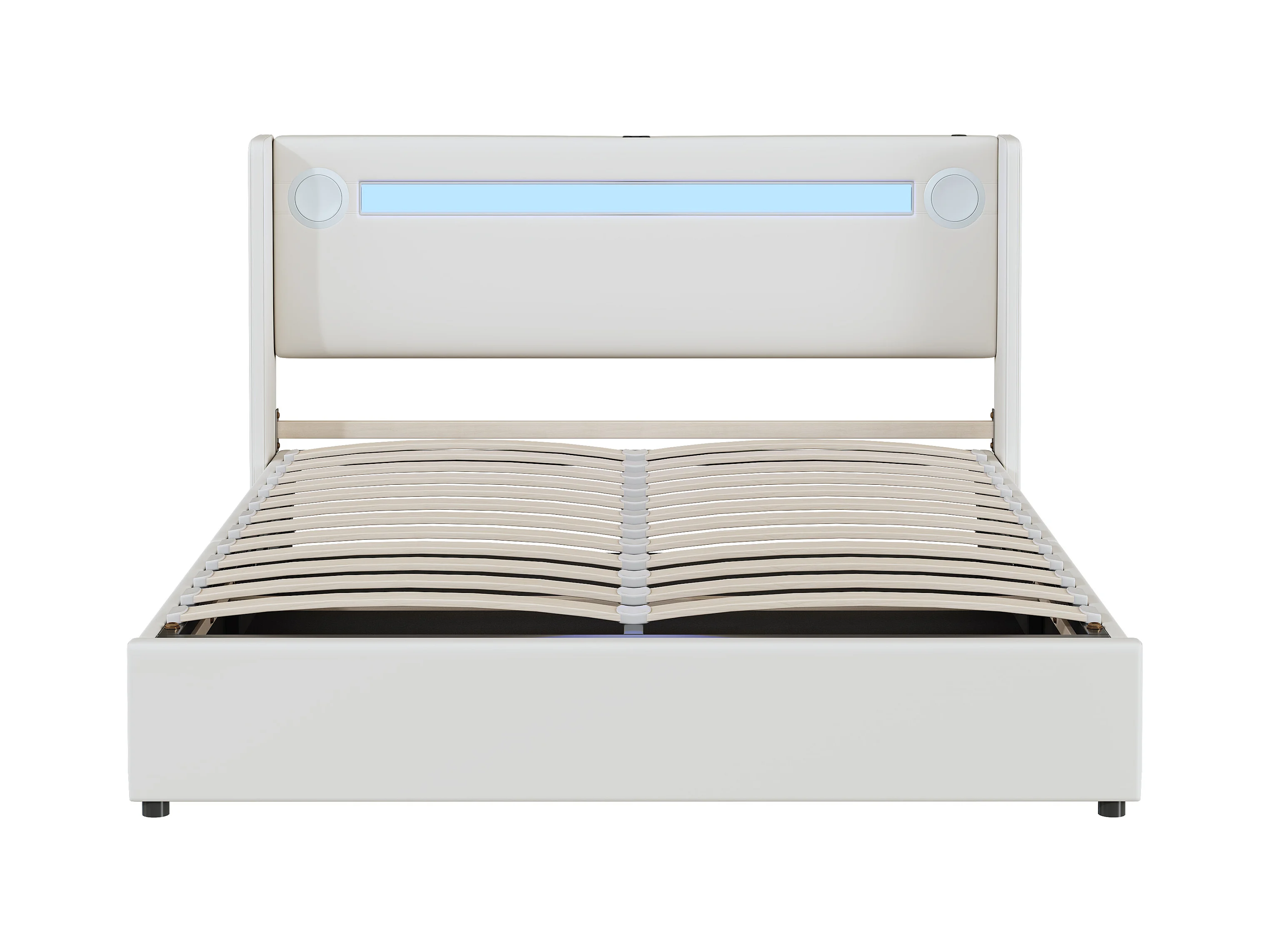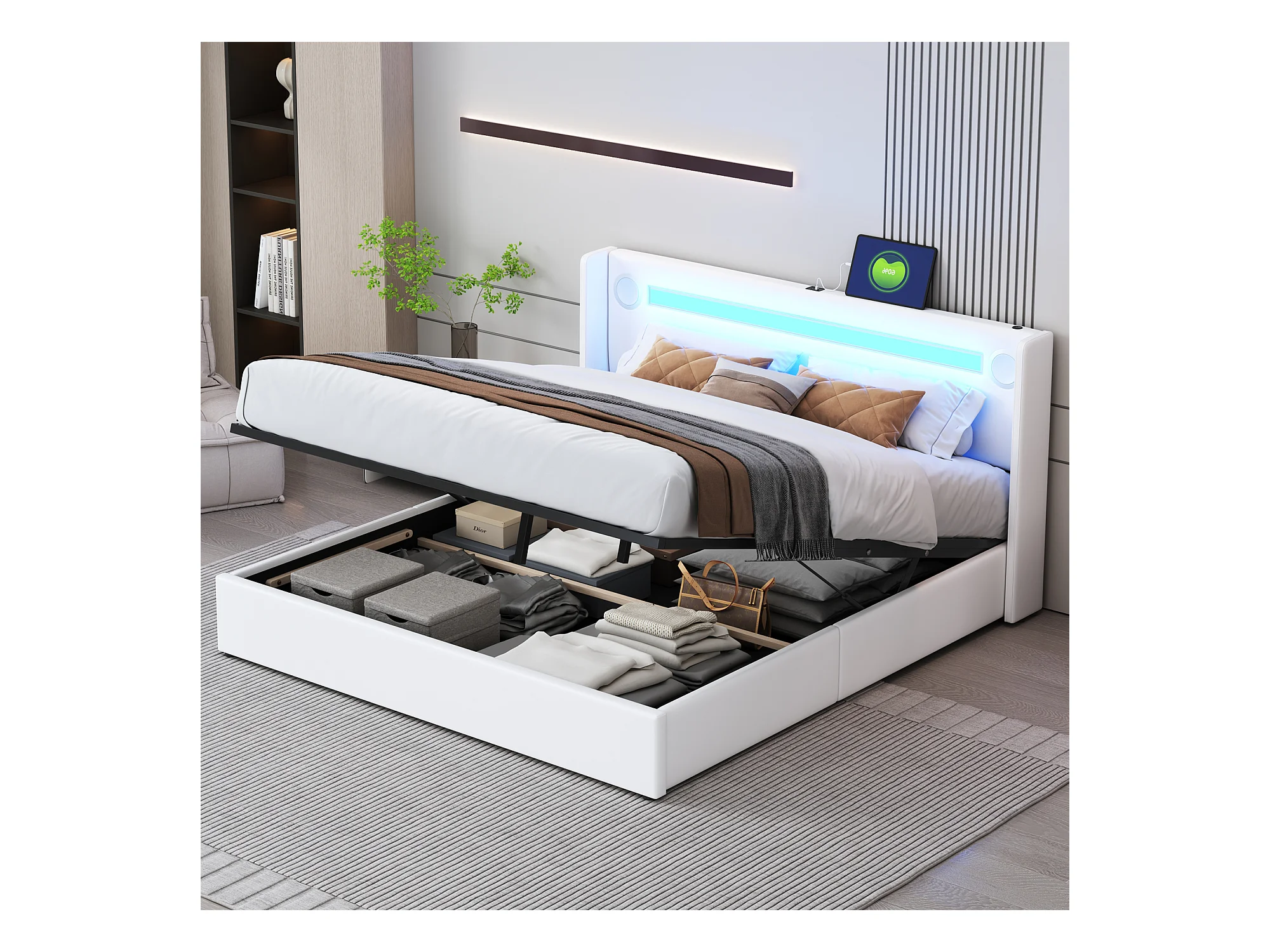 Lit coffre 160x200 cm - Lit double avec USB, lumière LED et lecteur Bluetooth - PU blanc - sans matelas