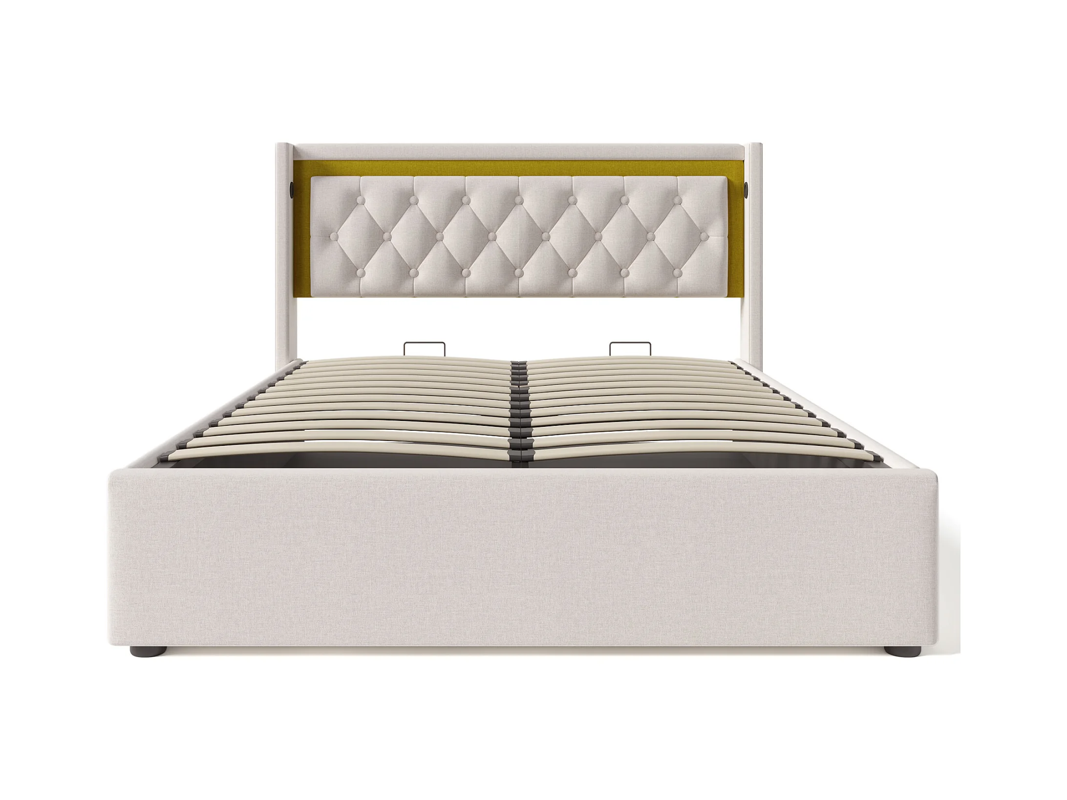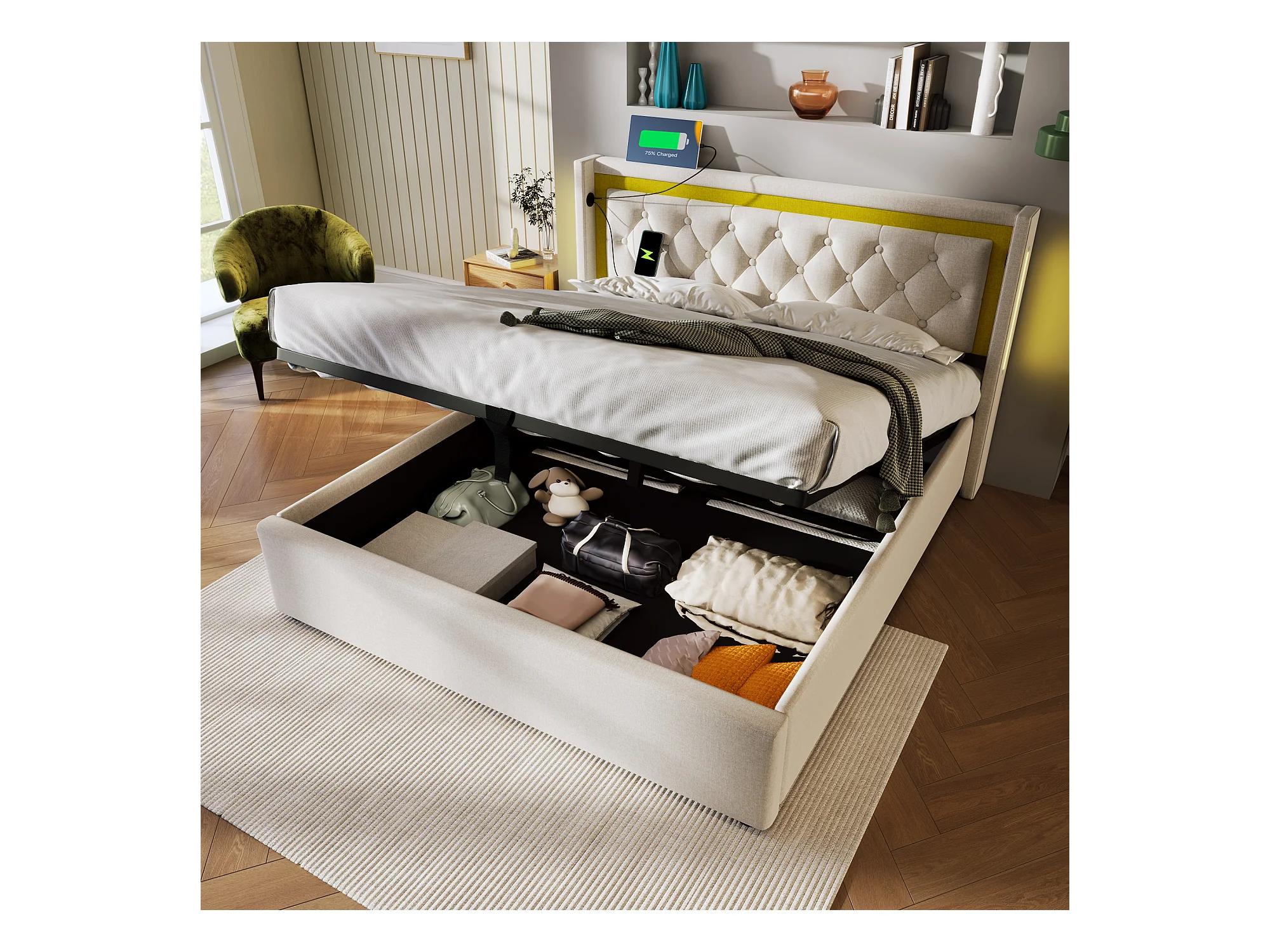 Lit coffre 160x200 cm - Lit adulte avec chargeur USB et lumière LED - beige - coton - sans matelas