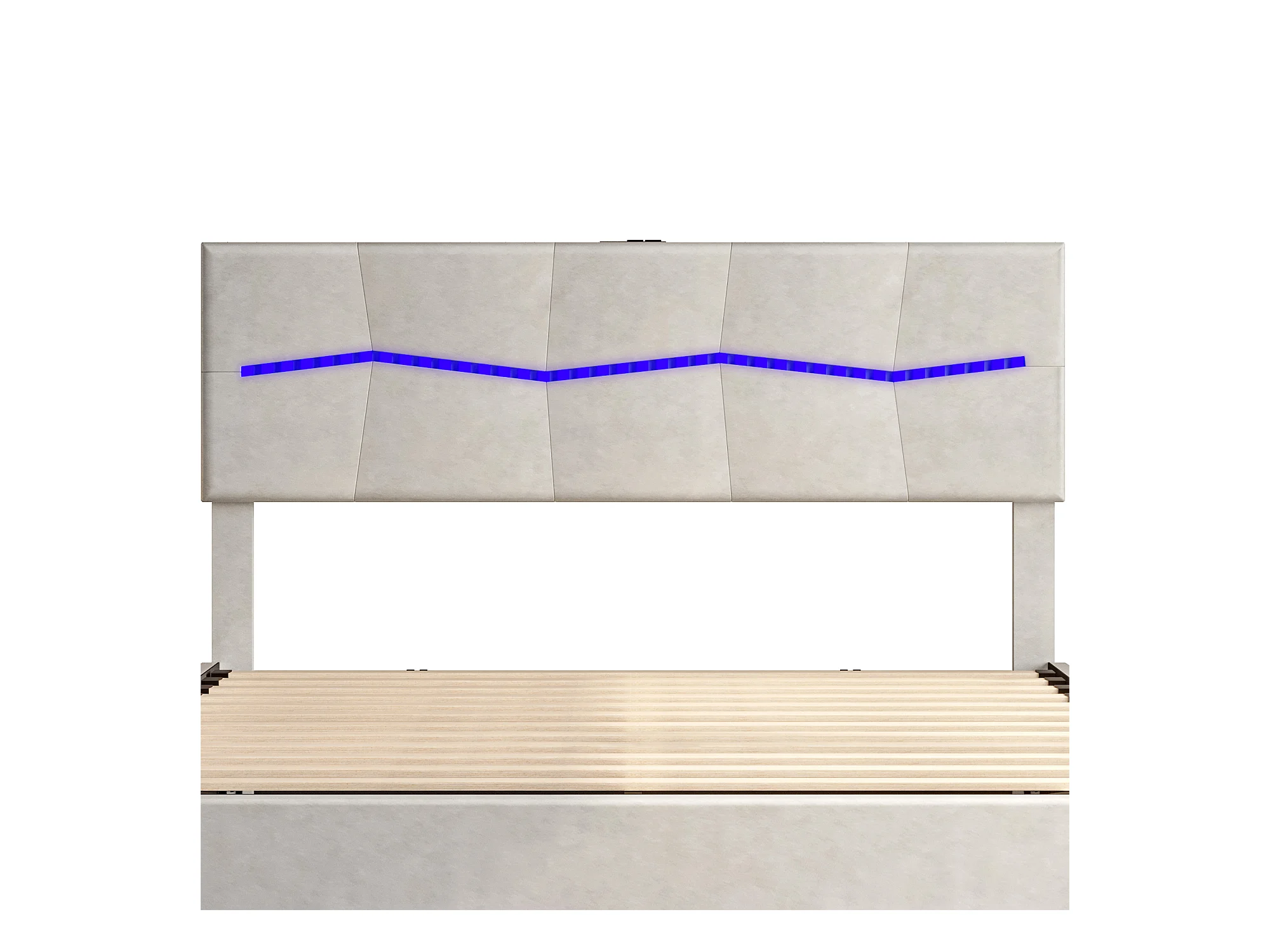 Lit Coffre 160x200 cm,Tête Rembourrée avec LED et USB, Grand Rangement sous Le Lit, Tissu PU,Beige