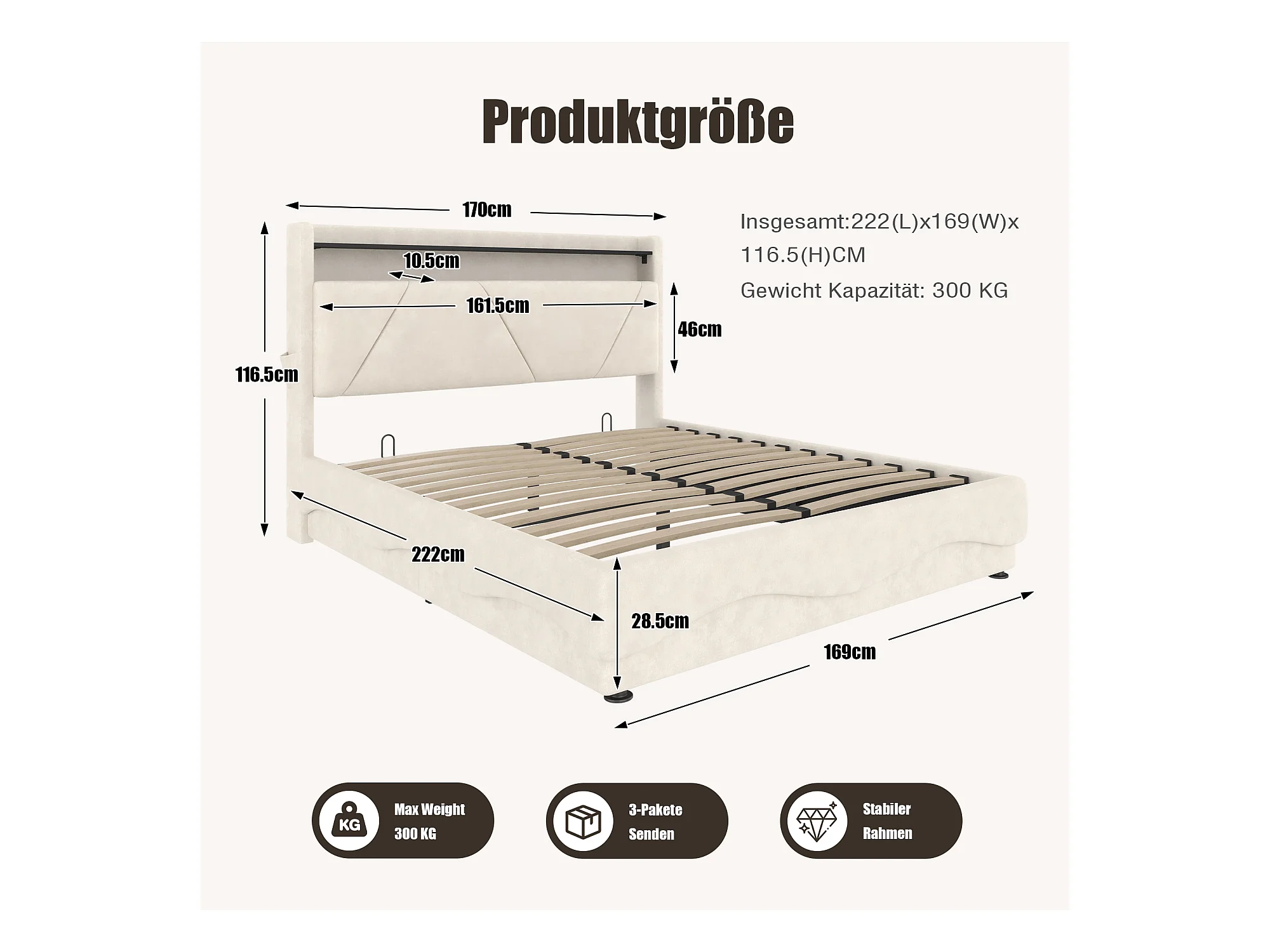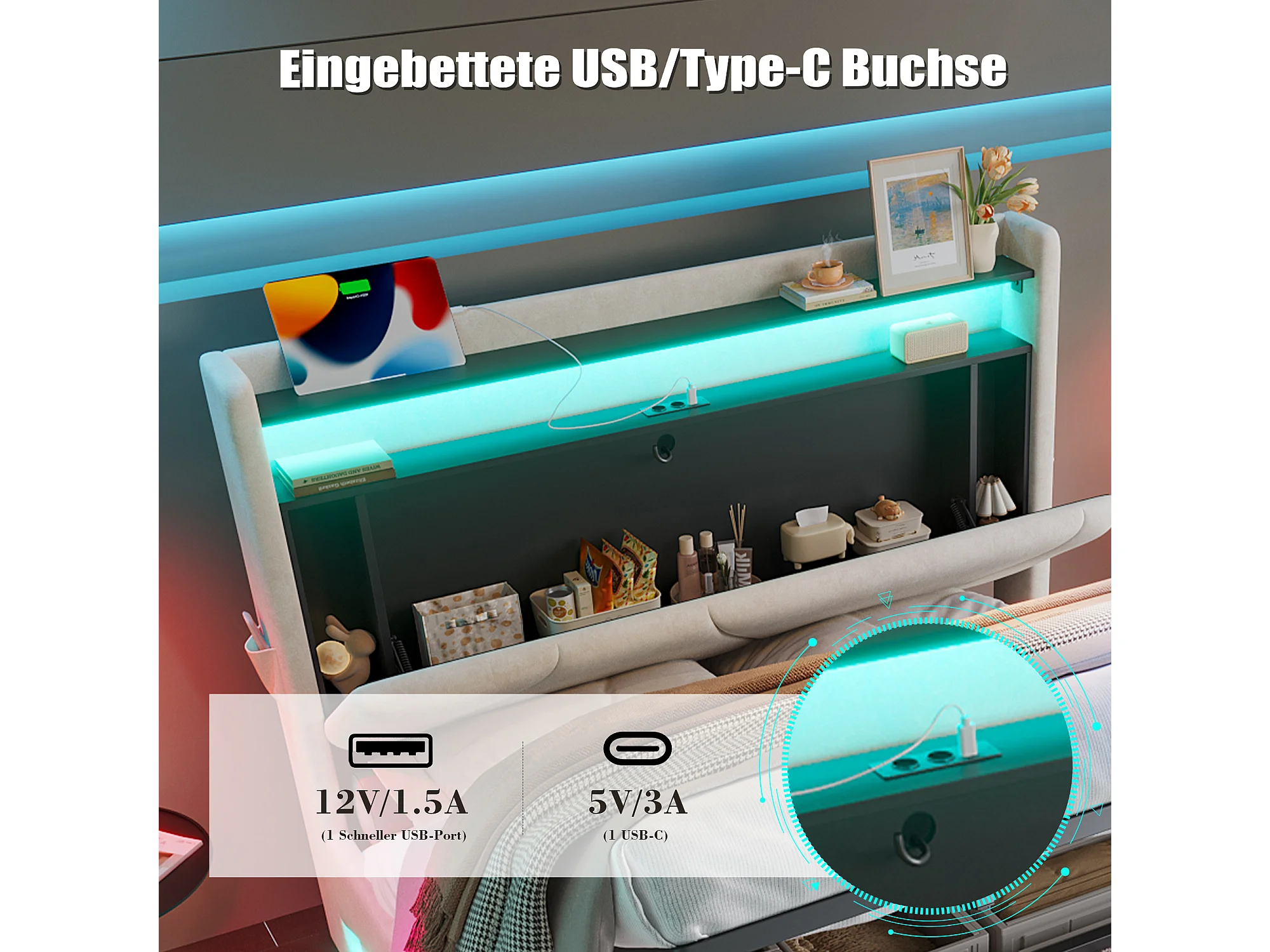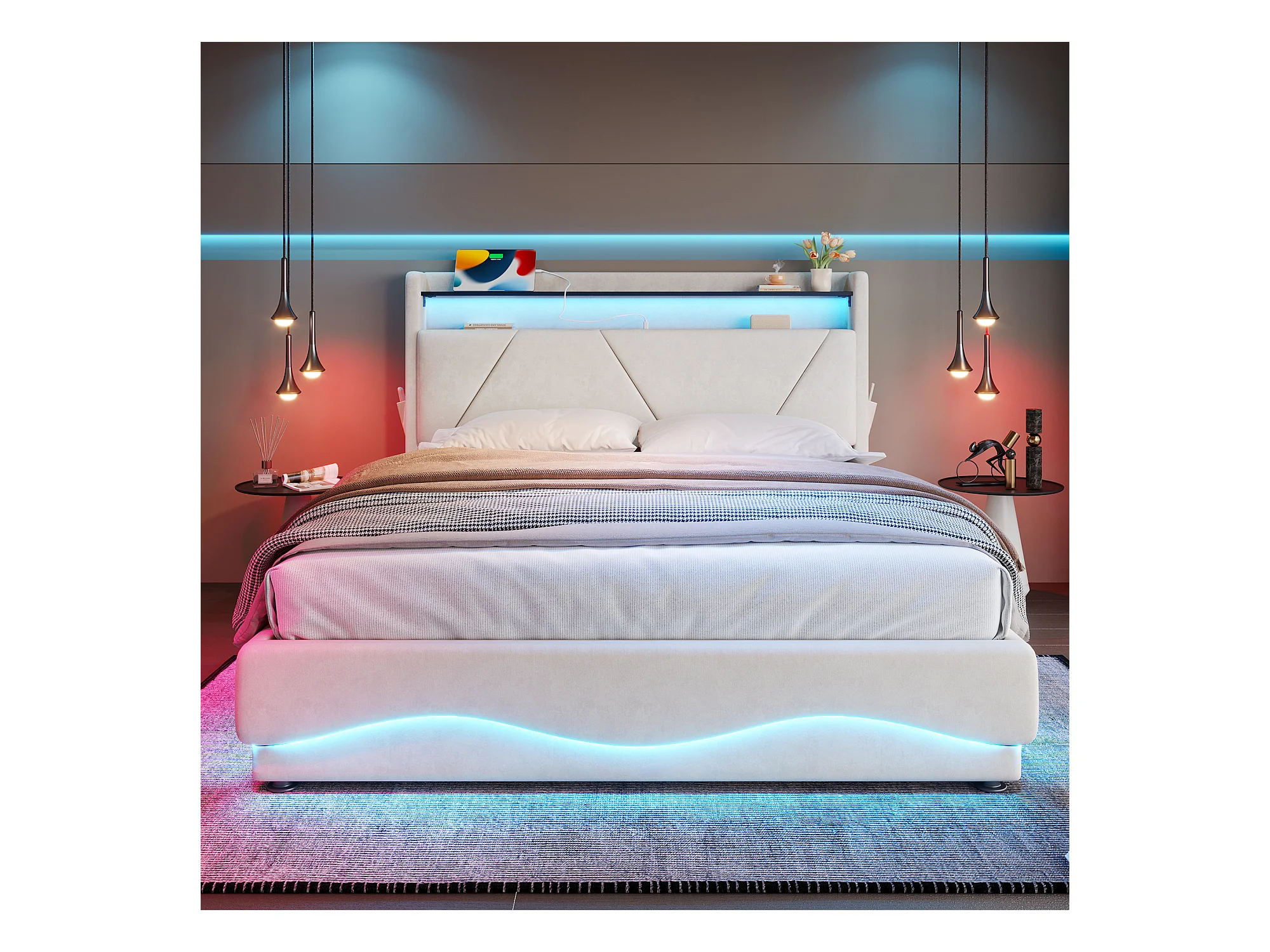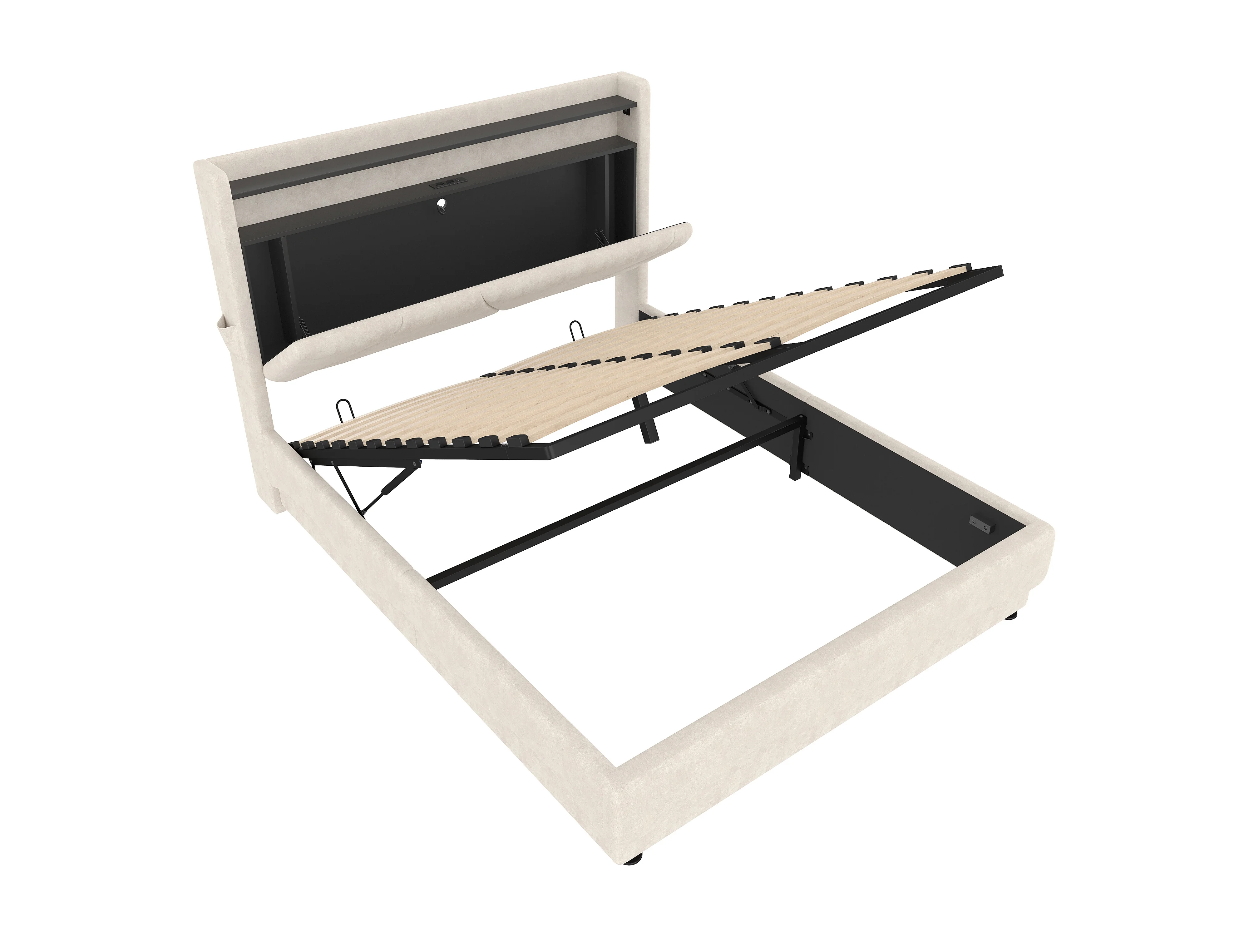 Lit Coffre Rembourré 160×200 Cm Velours Beige –Étagère tête de lit - LED/USB‑C – Grand Coffre Sous Sommier – Style Contemporain