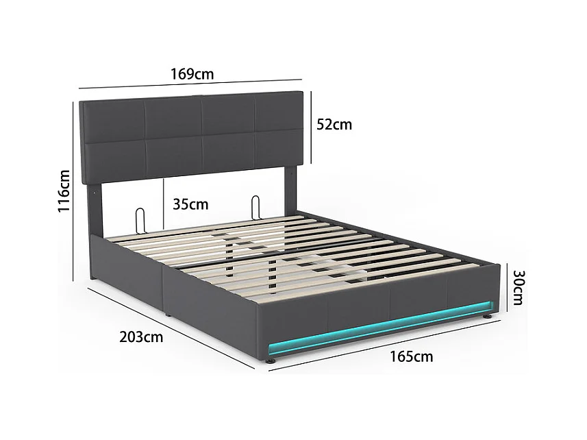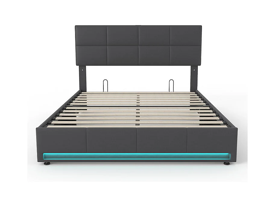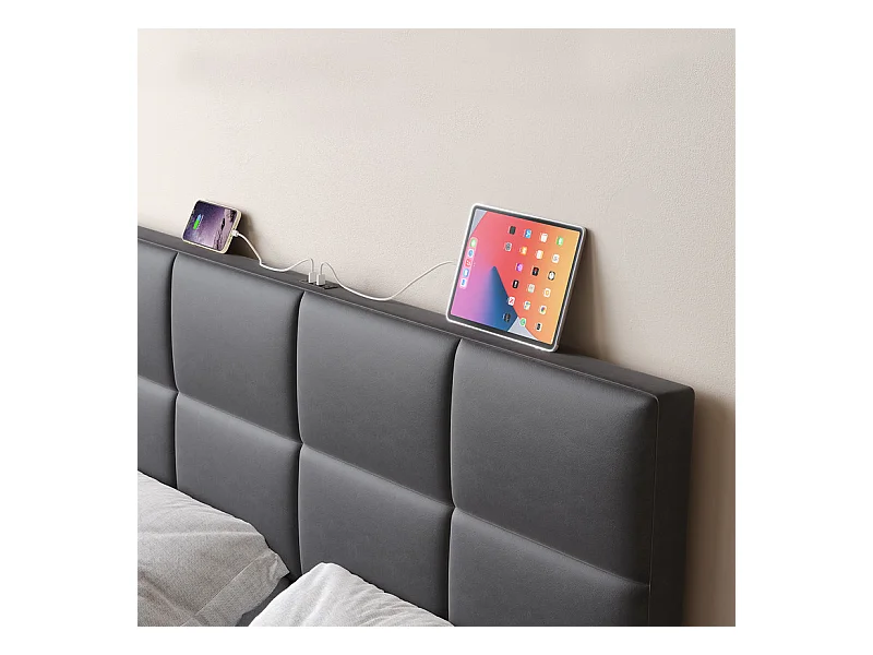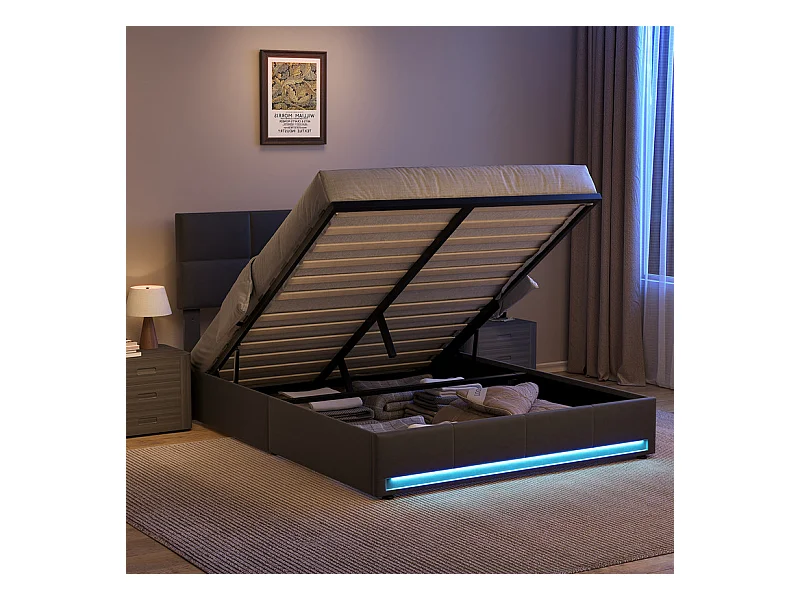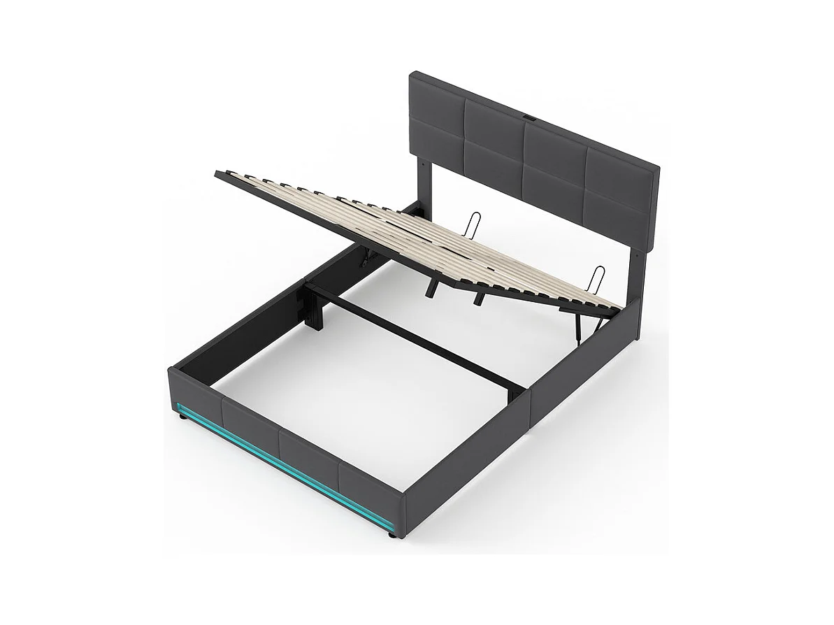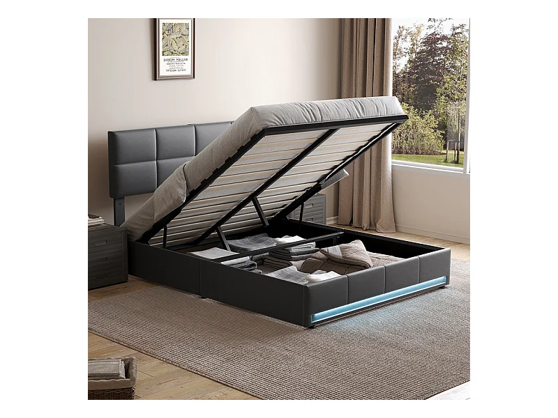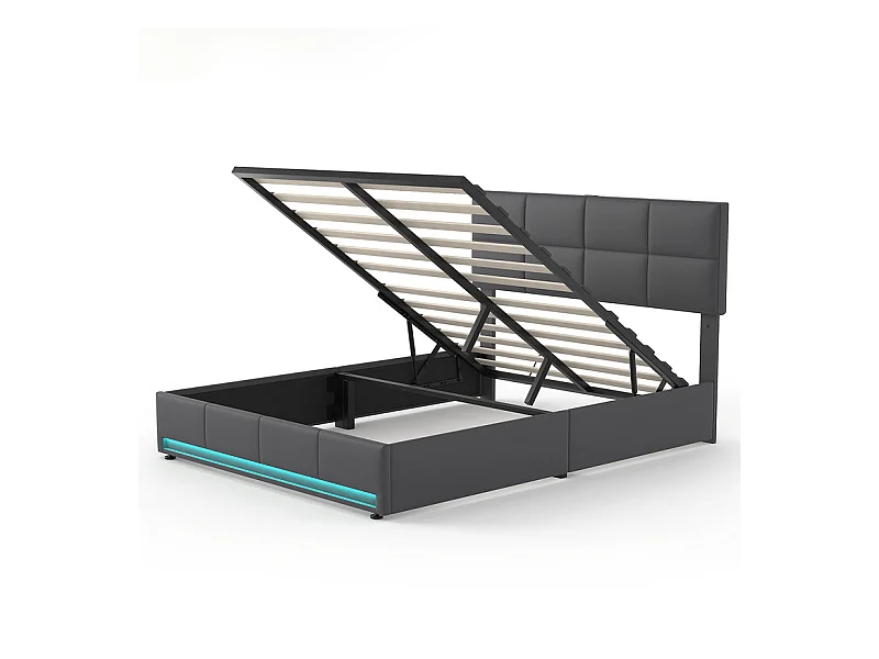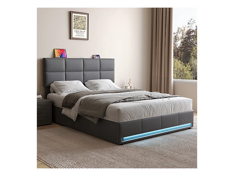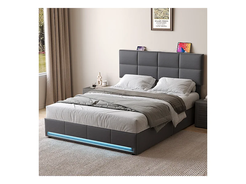 Lit coffre 160x200cm avec tête de lit réglable - LED RGB - USB+Type-C - en velours - Gris anthracite