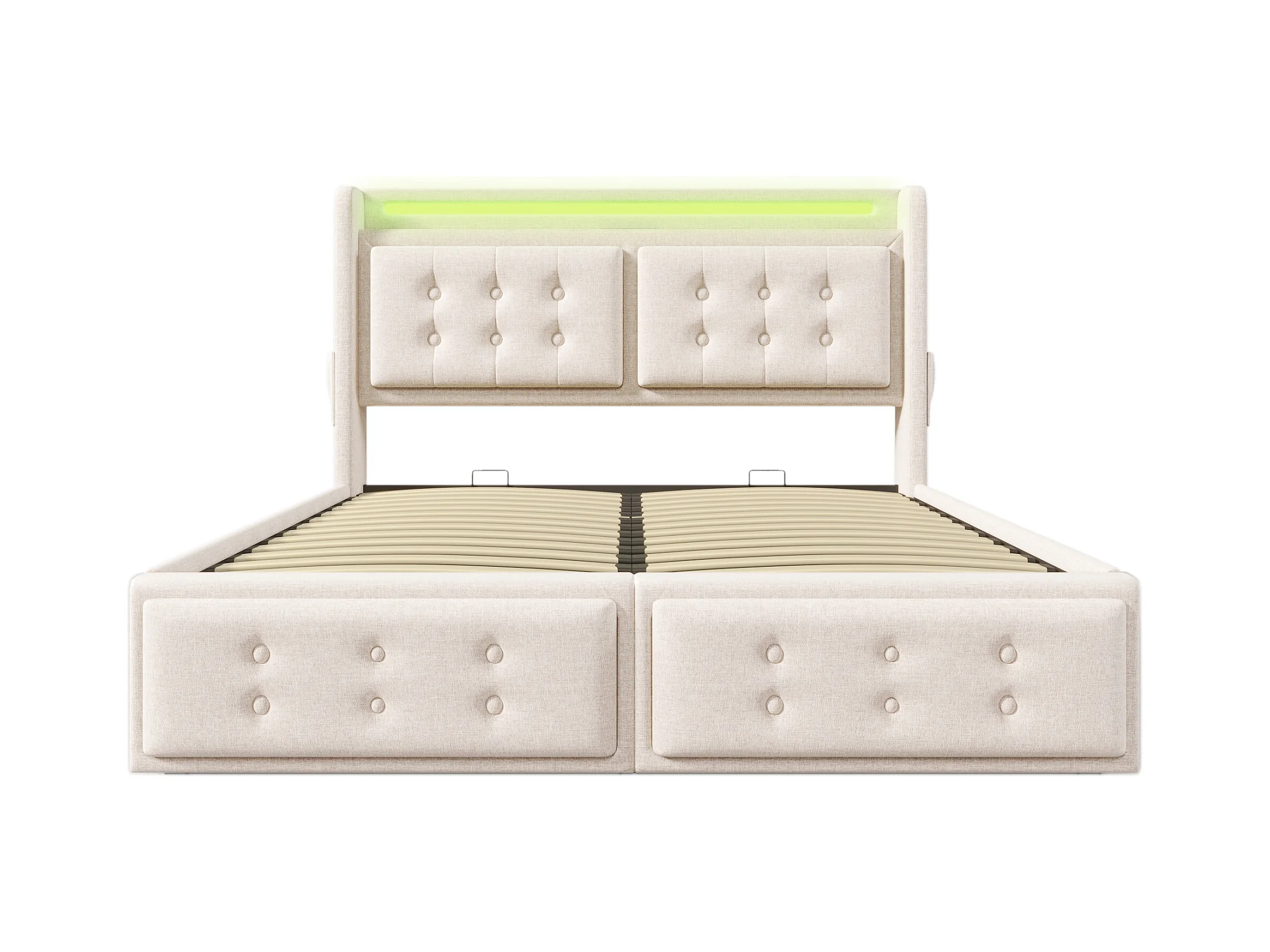 Lit coffre 180x200 cm - lit capitonné avec tête de lit LED et fonction de charge USB C - coton - beige - sans matelas
