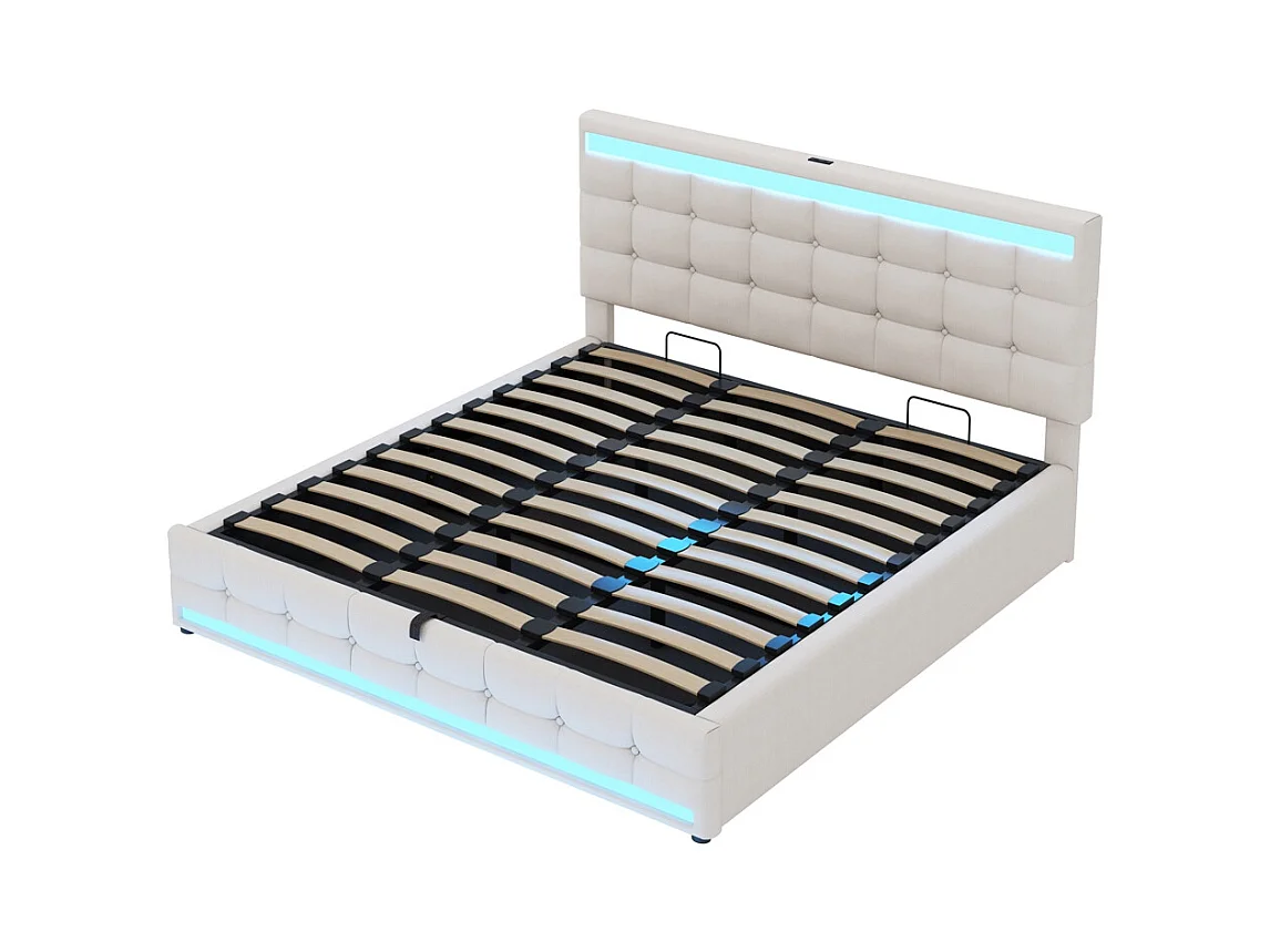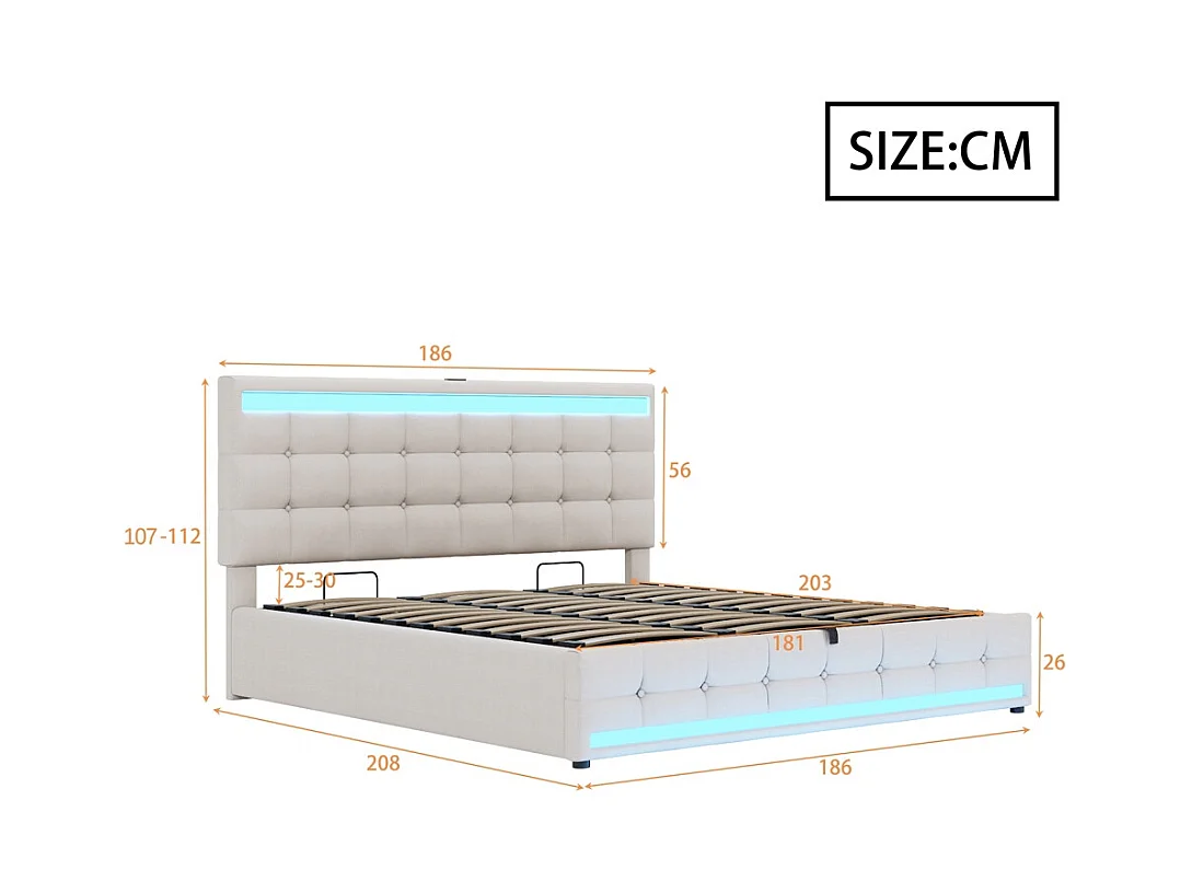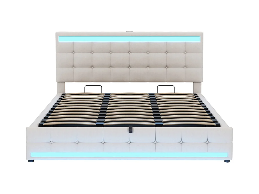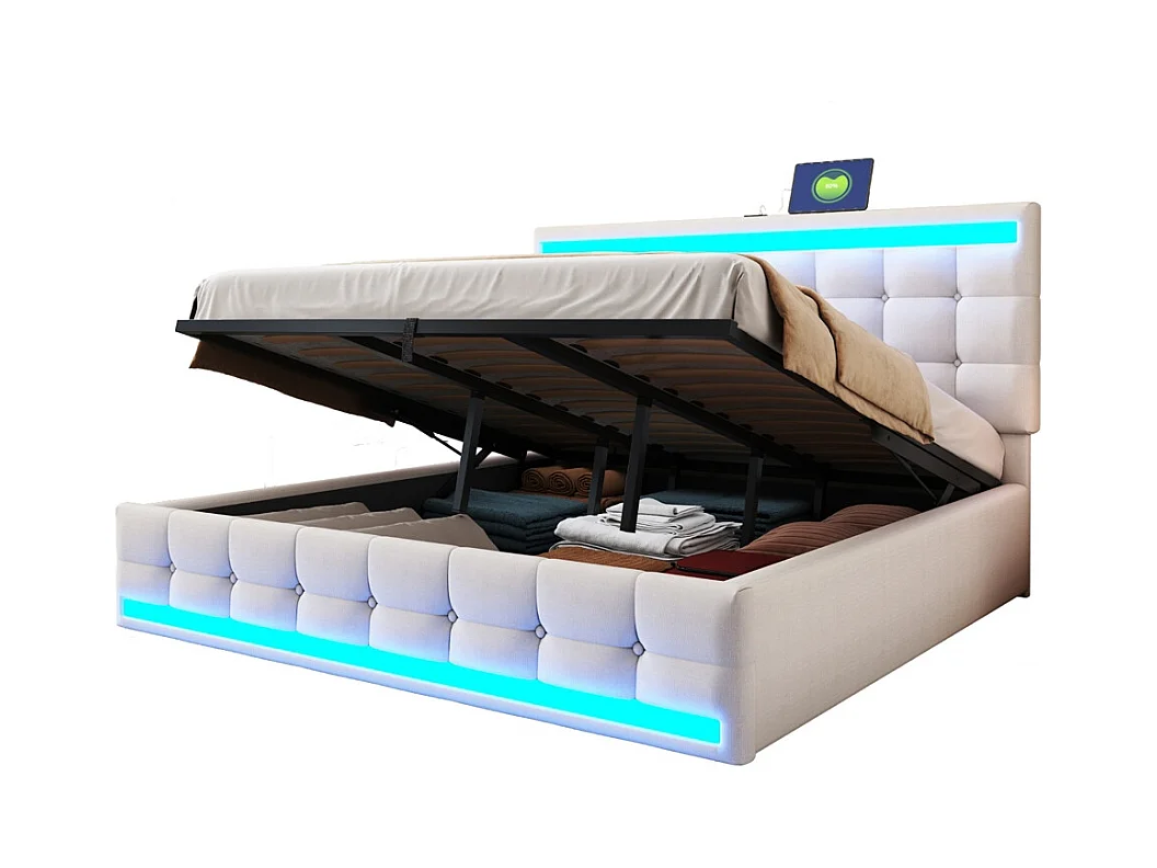 Lit coffre 180x200 pour enfant avec espace de rangement hydraulique USB et bande lumineuse LED à changement de couleur lin beige