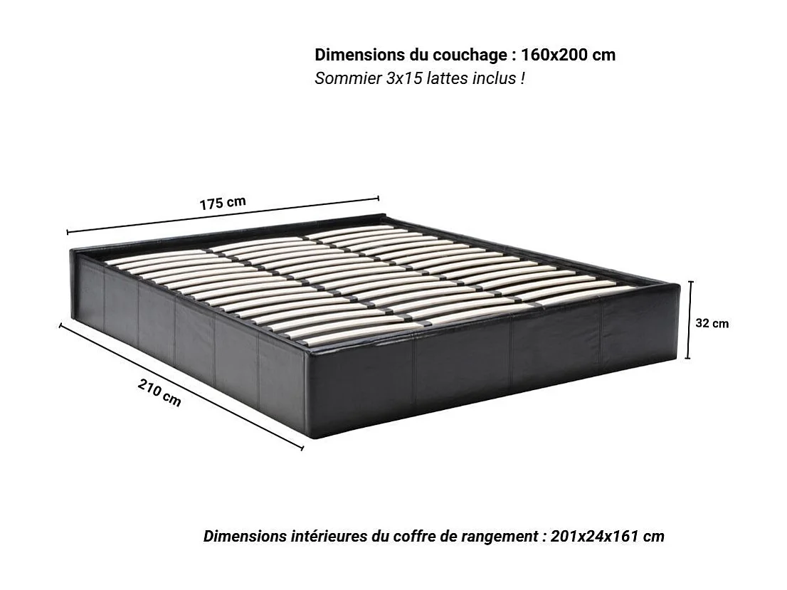 Lit coffre 2 places 160x200cm Noir avec sommier TURIN