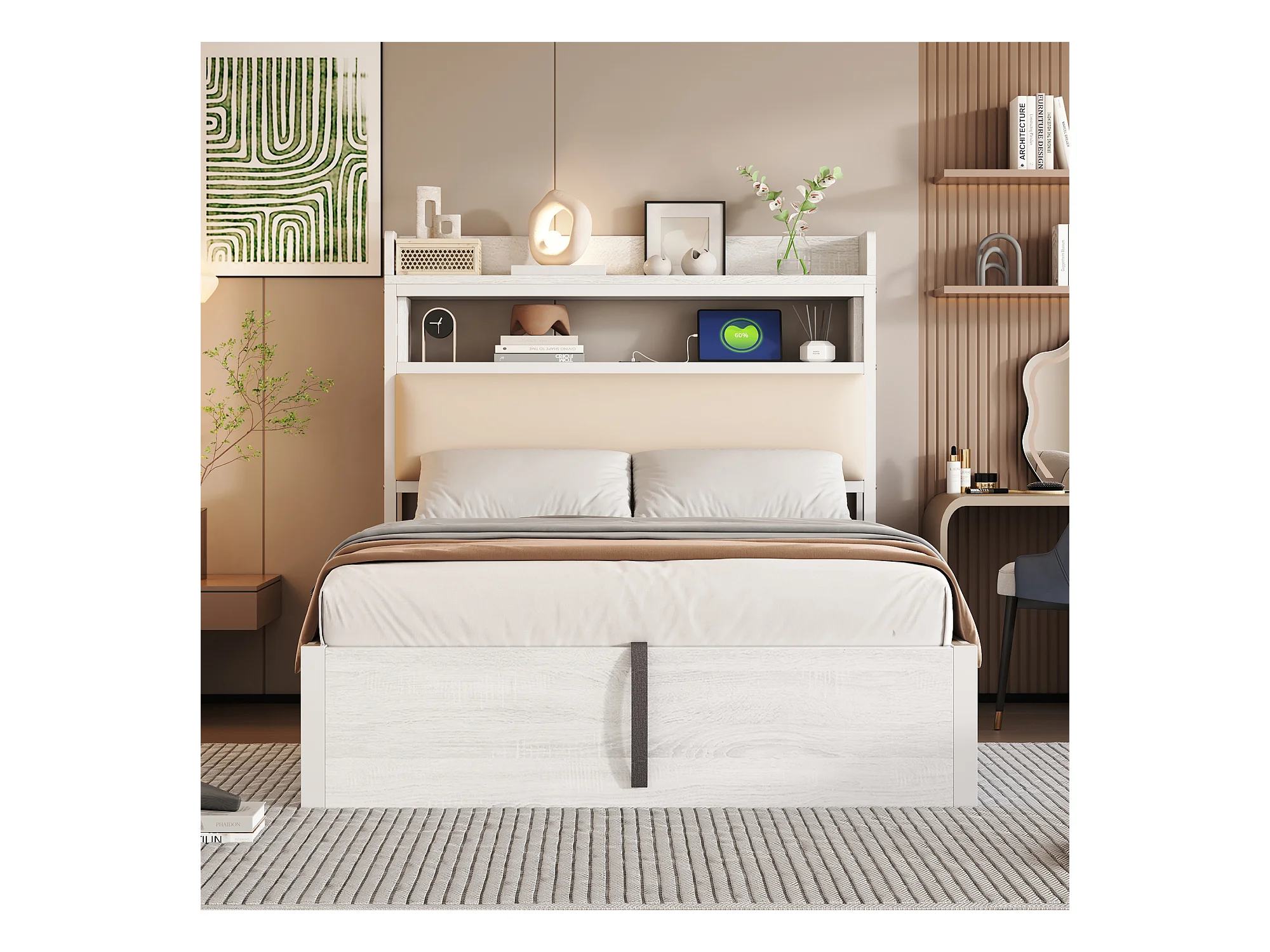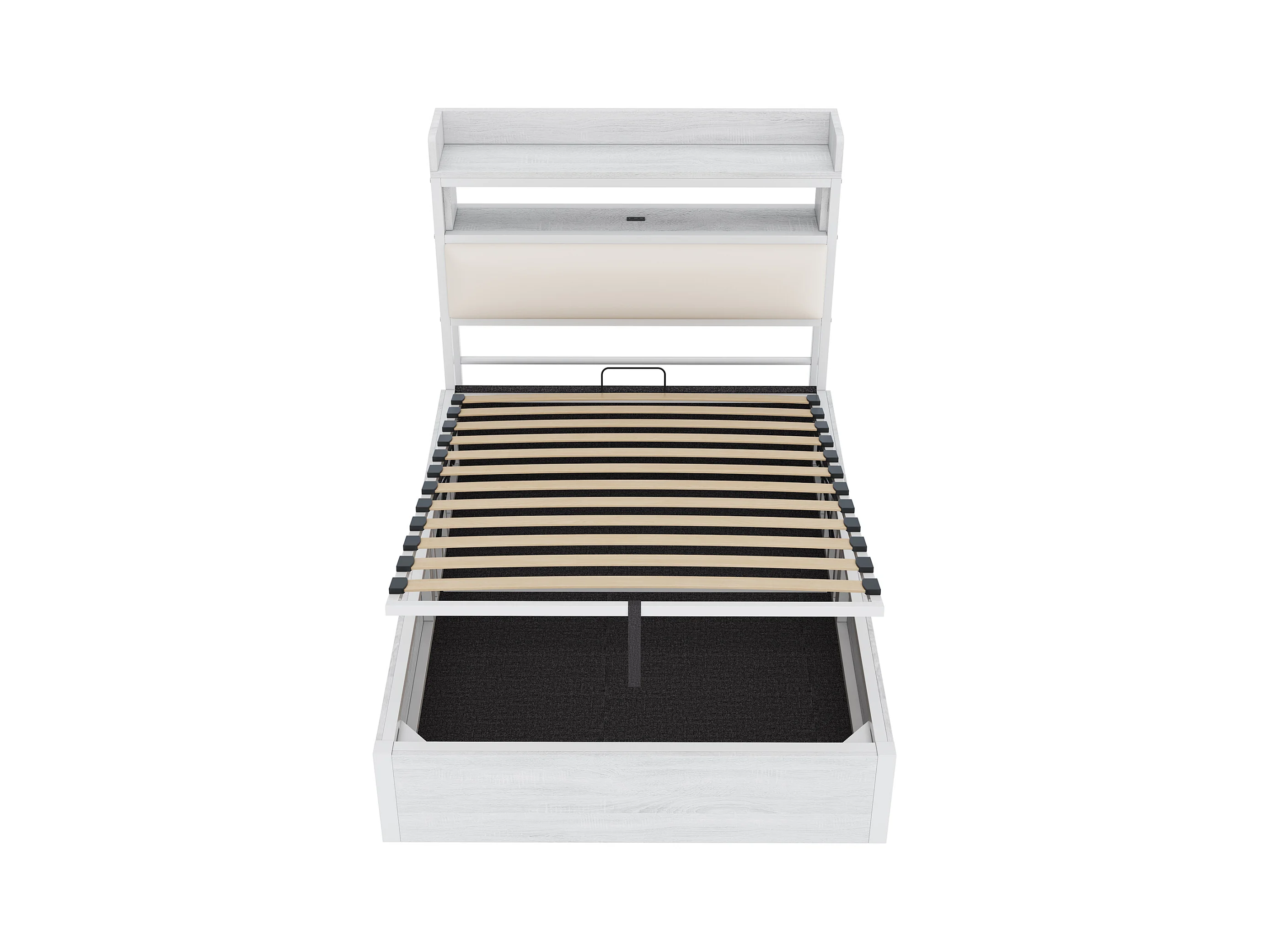 Lit coffre 90 x 200 cm - Lit simple avec chargement USB et tête de lit coffre - bois blanc