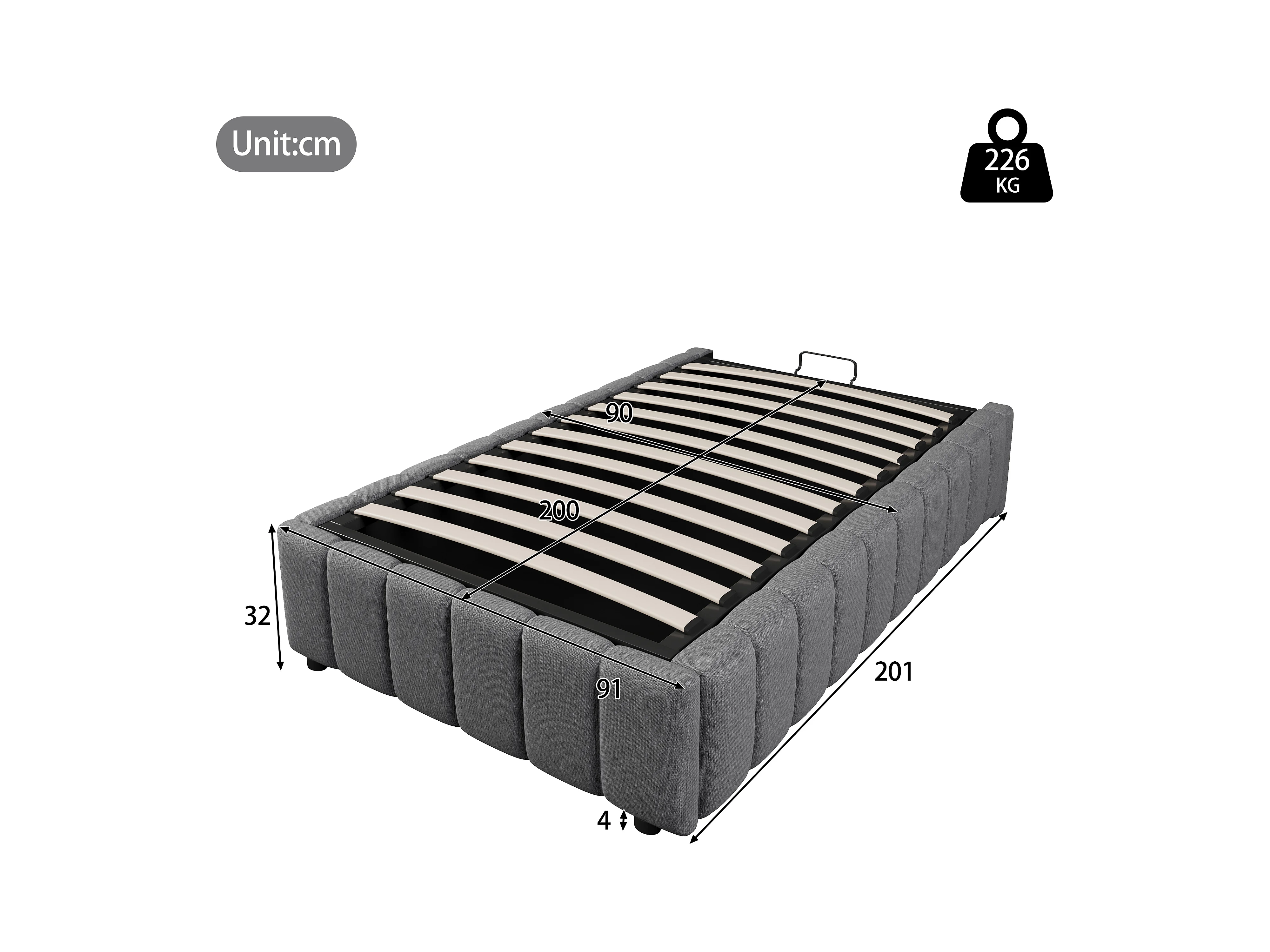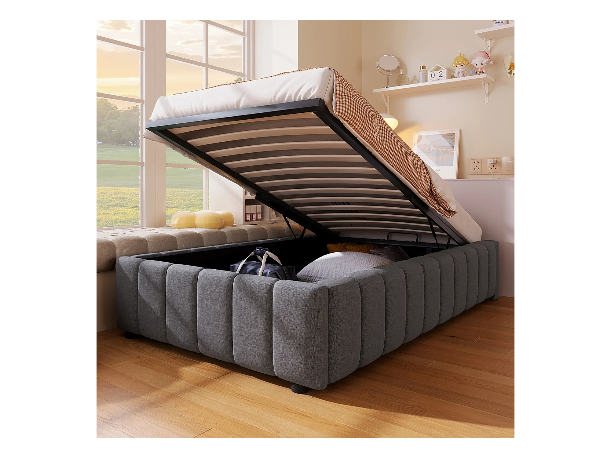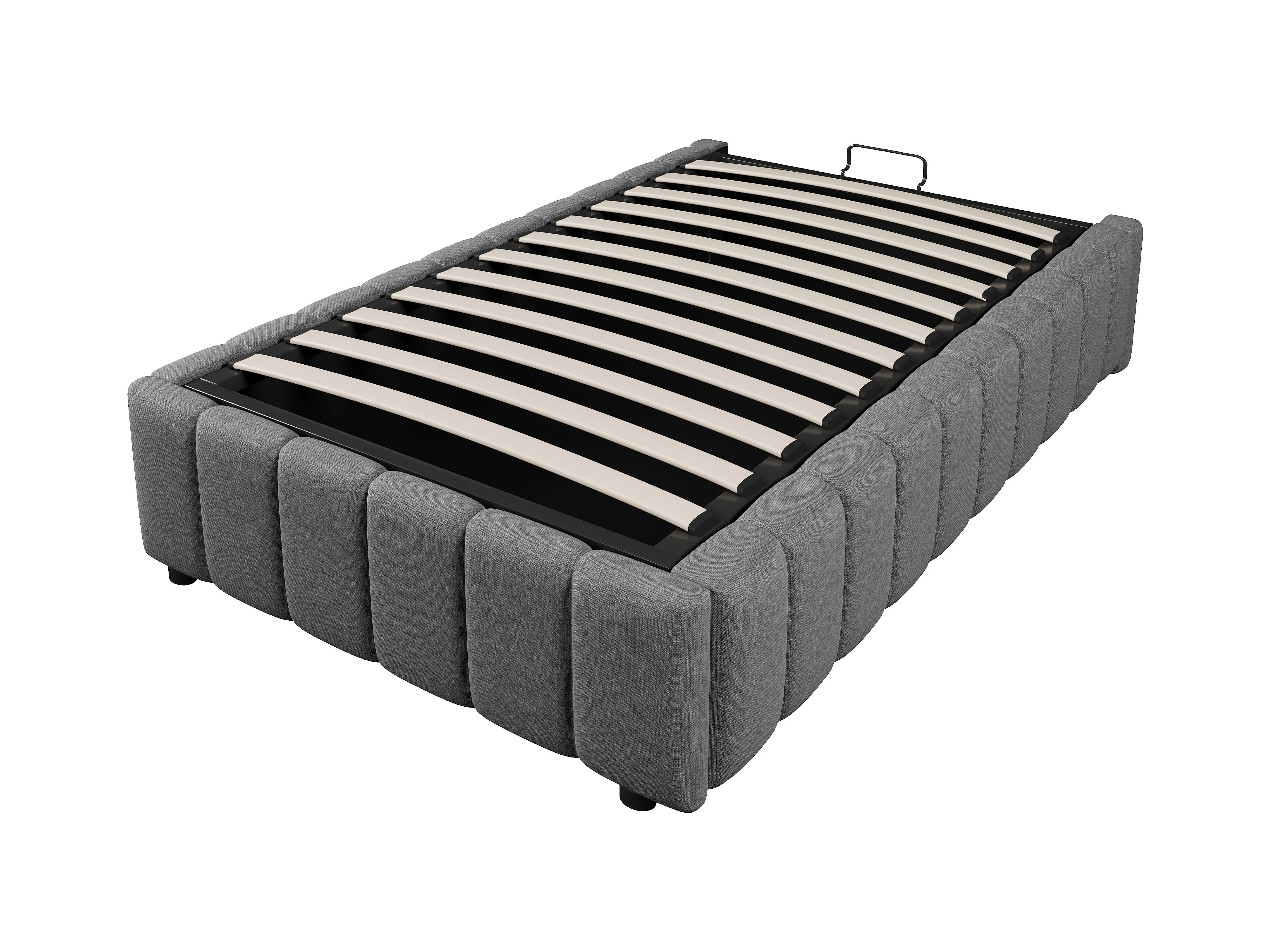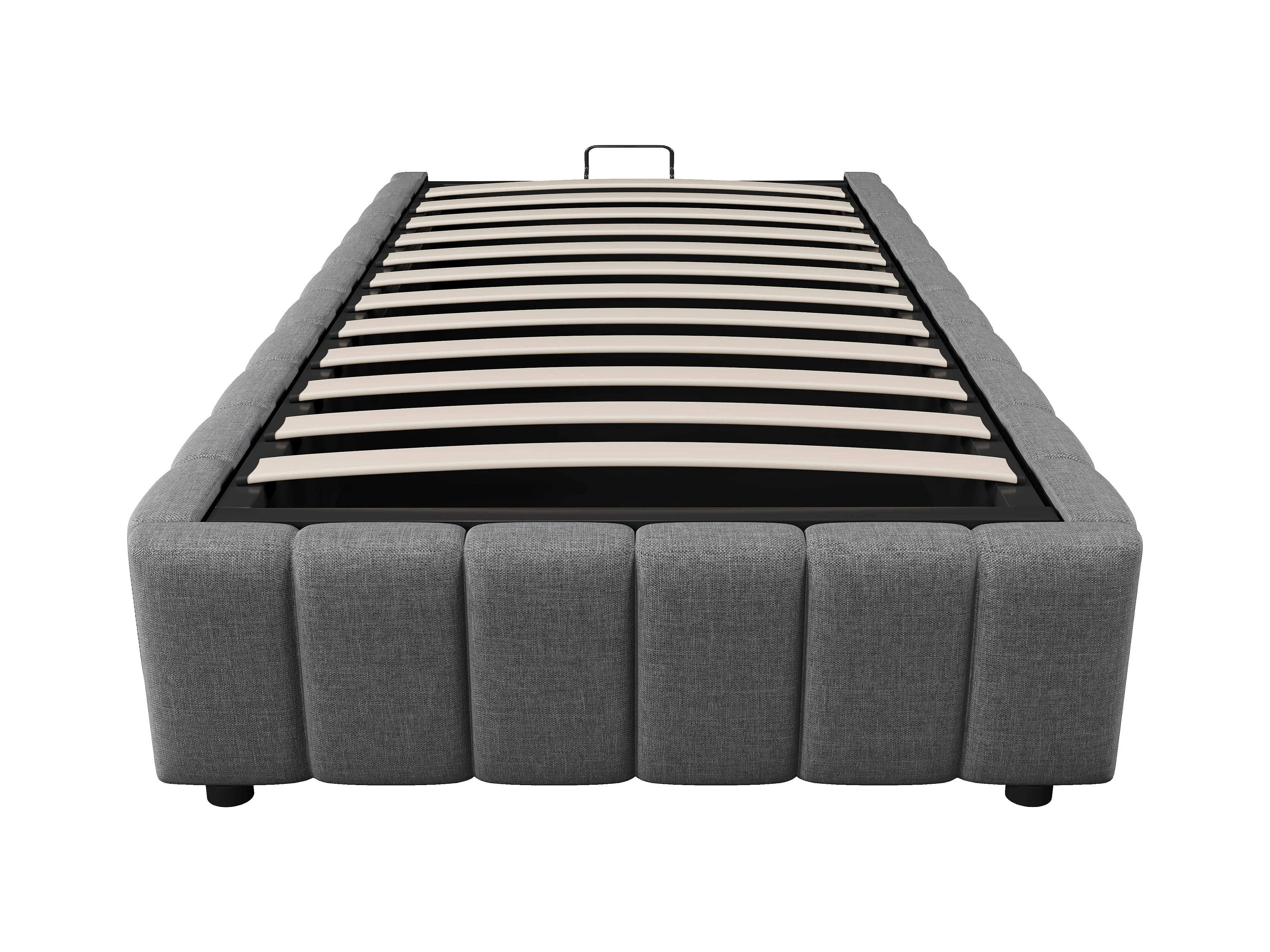 Lit coffre 90 x 200 cm sans tête de lit - Tissu en lin - Sommier à lattes inclus - Gris (sans matelas)