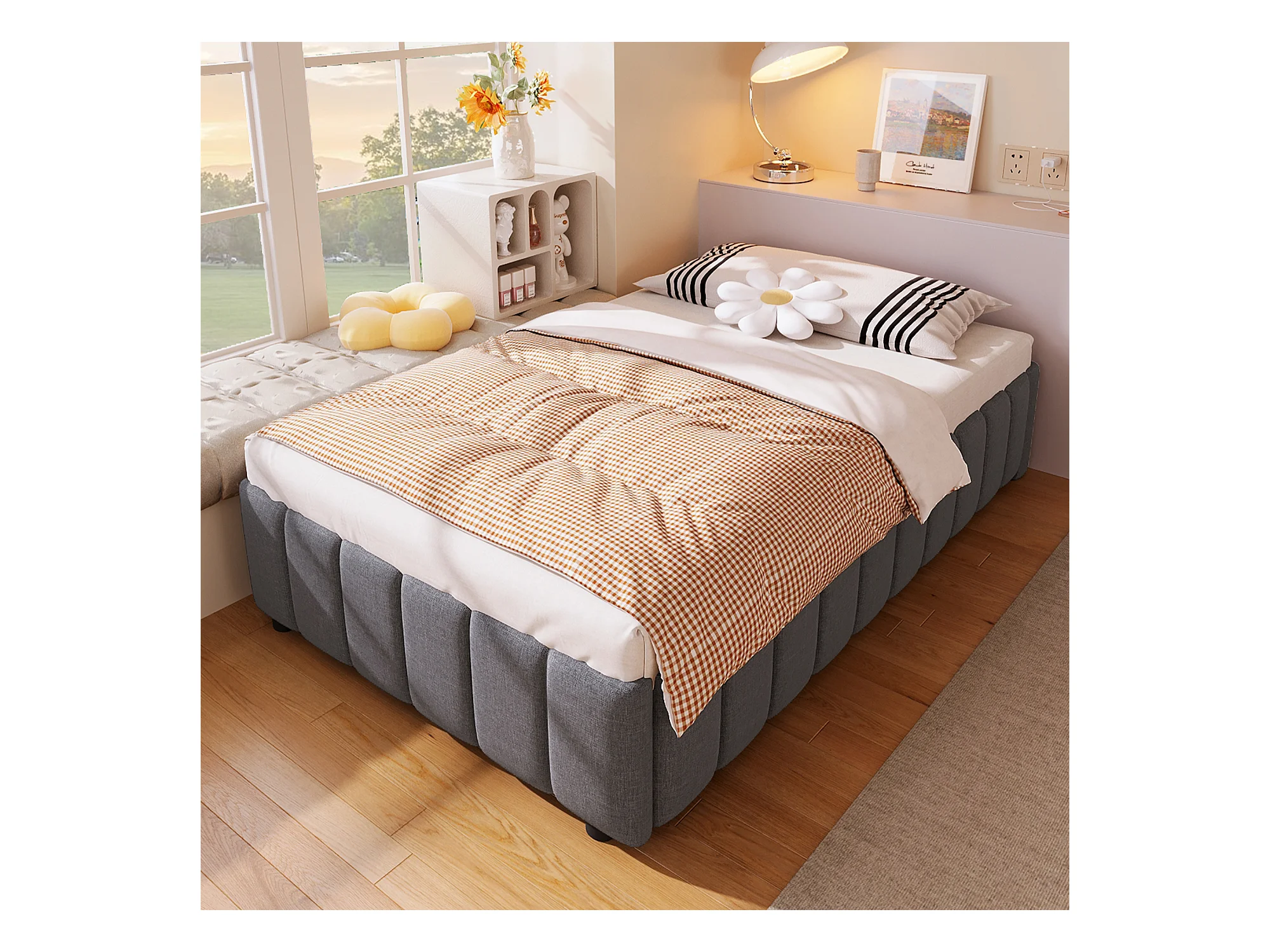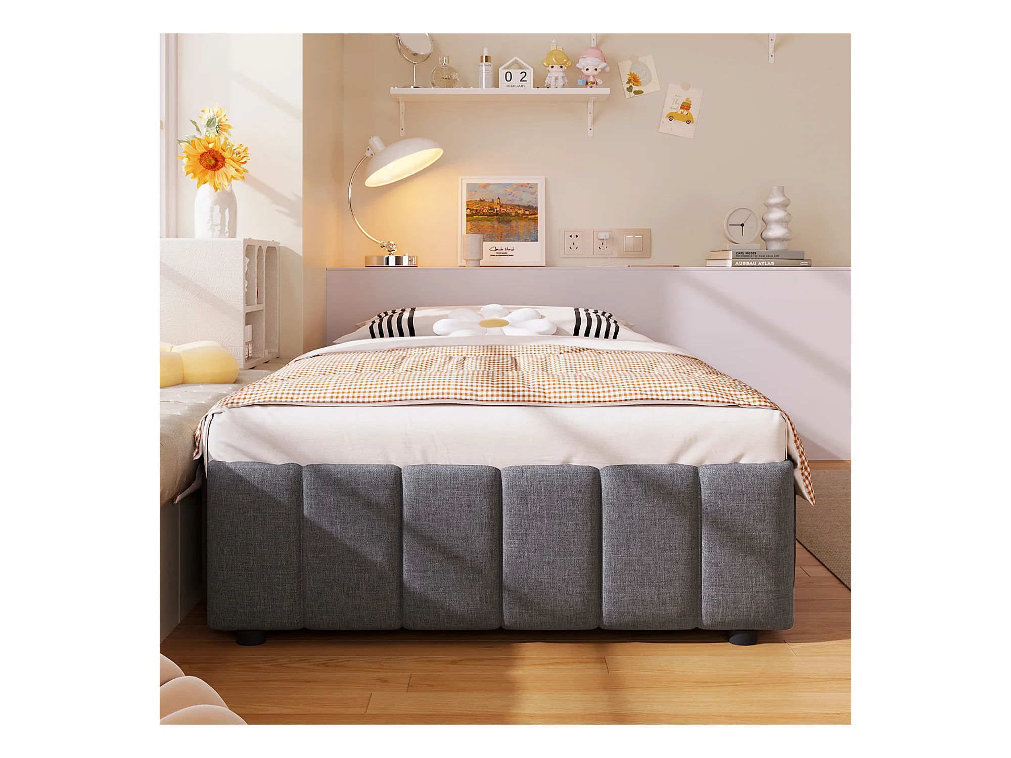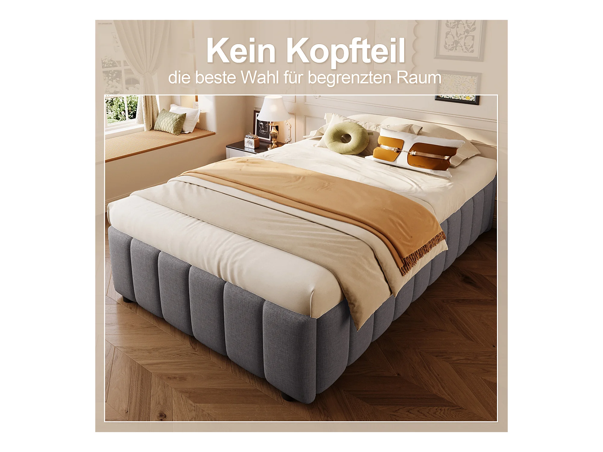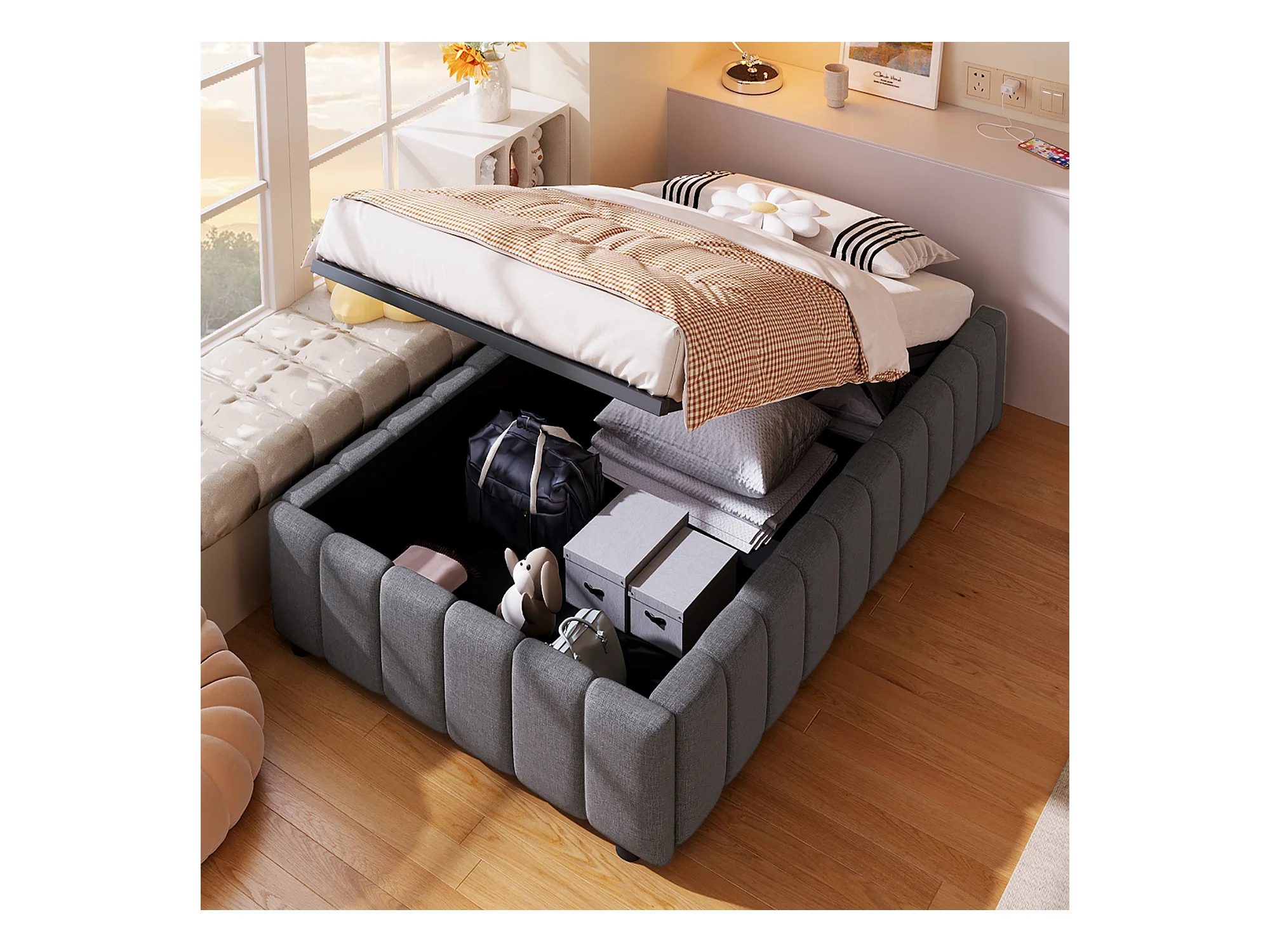 Lit coffre 90 x 200 cm sans tête de lit - Tissu en lin - Sommier à lattes inclus - Gris (sans matelas)