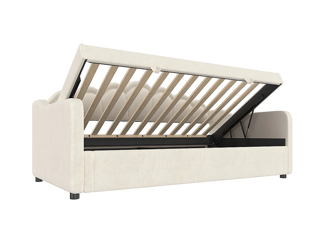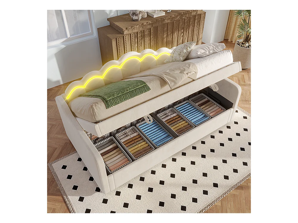 Lit coffre 90x200 cm canapé-lit avec espace de rangement lit simple velours bande LED changeant de couleur beige