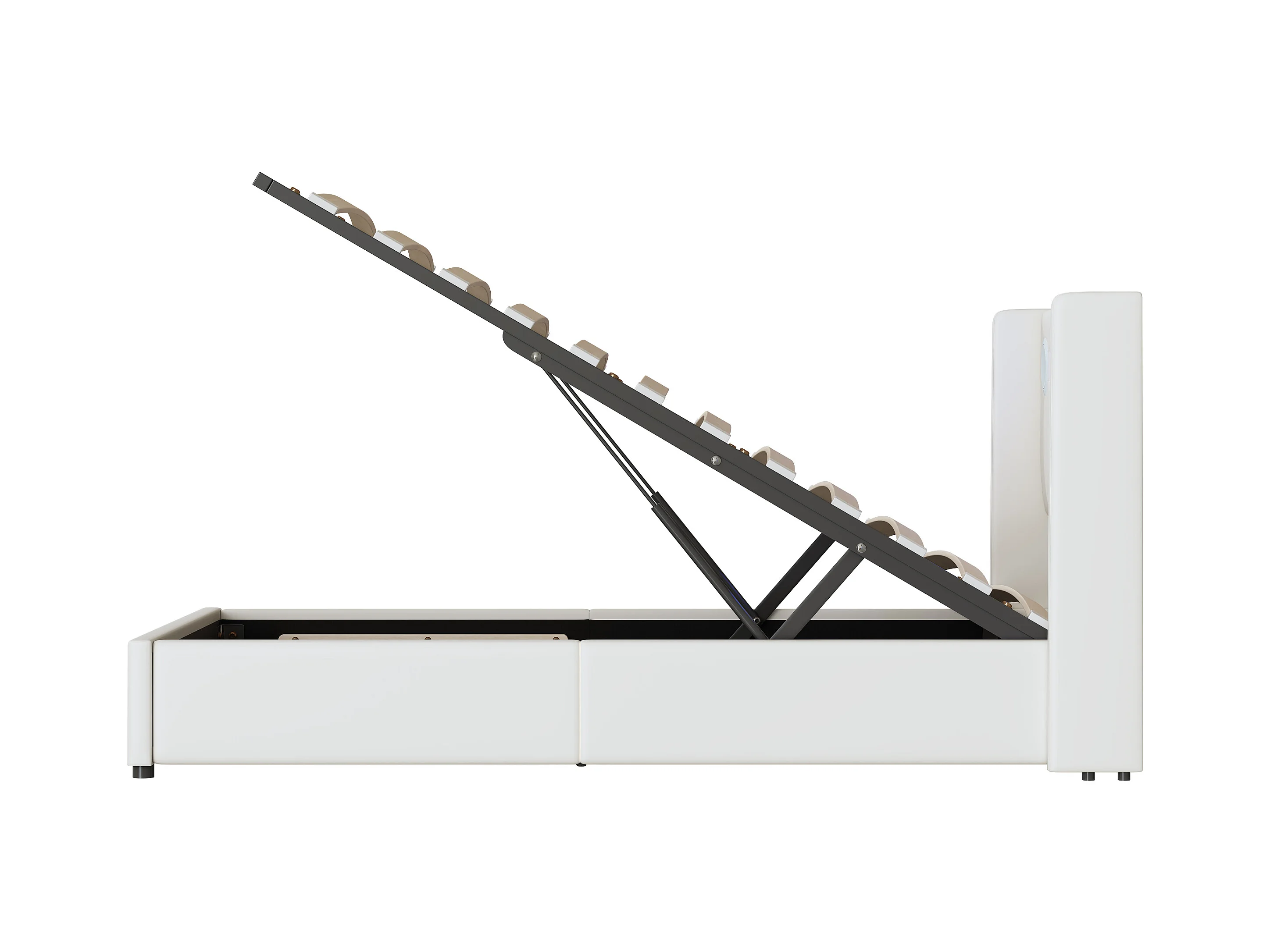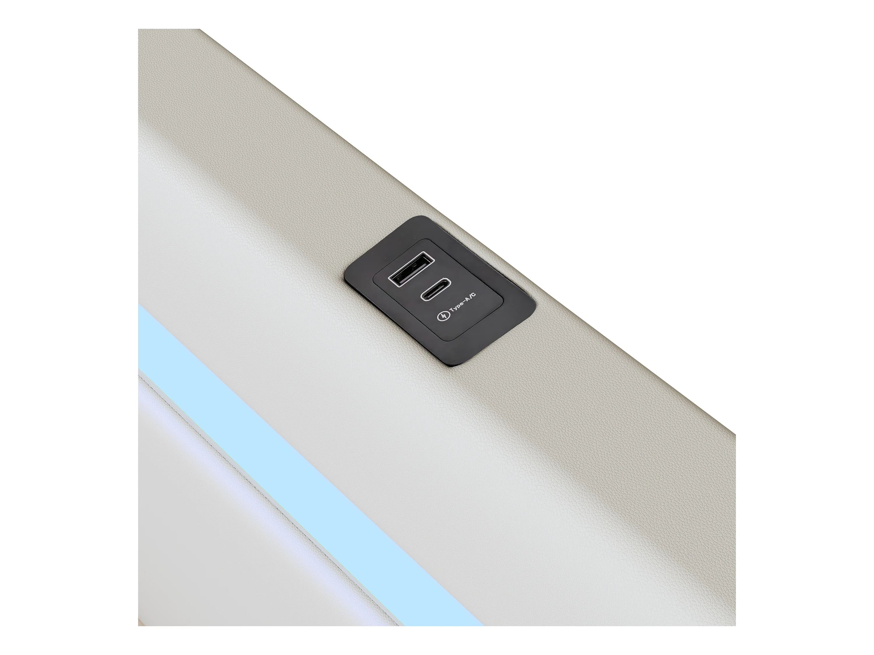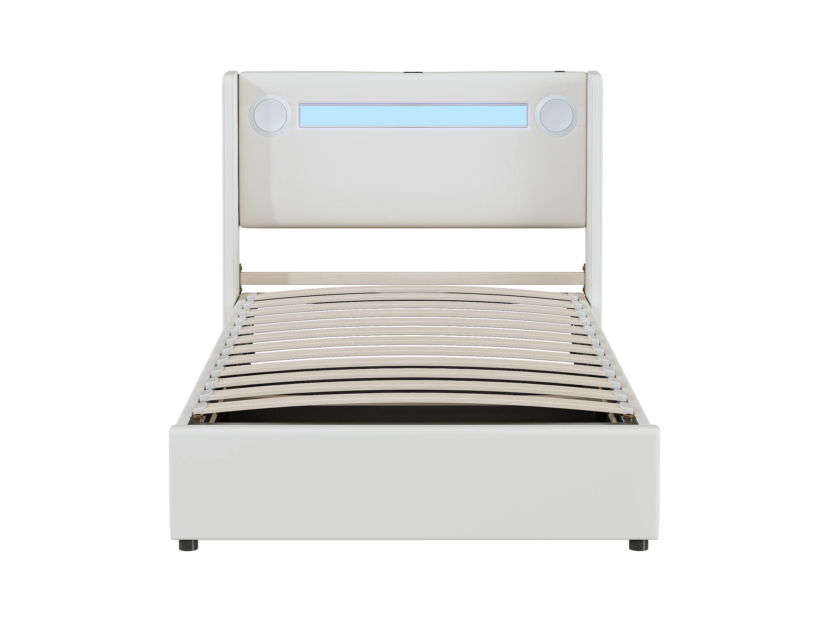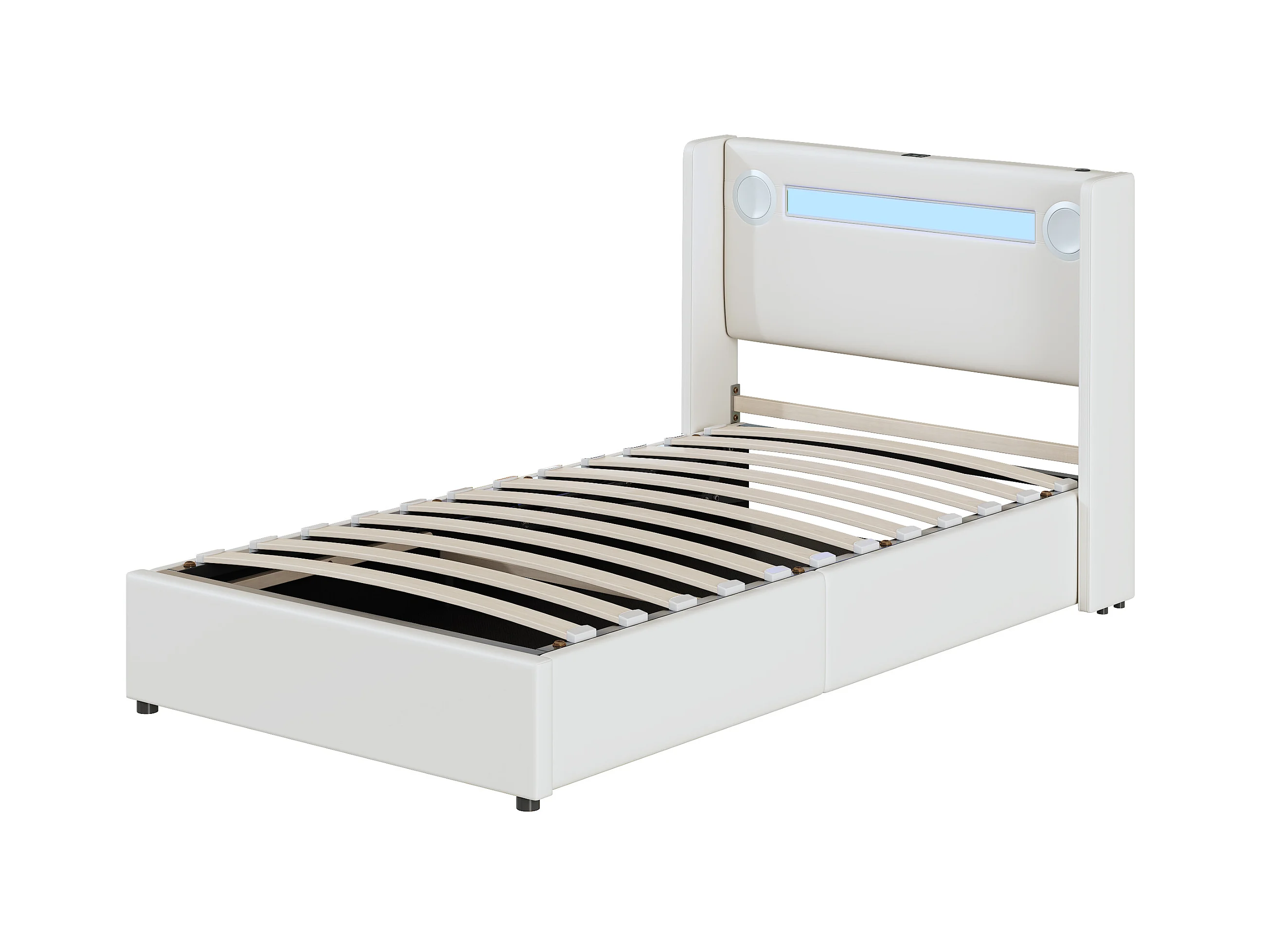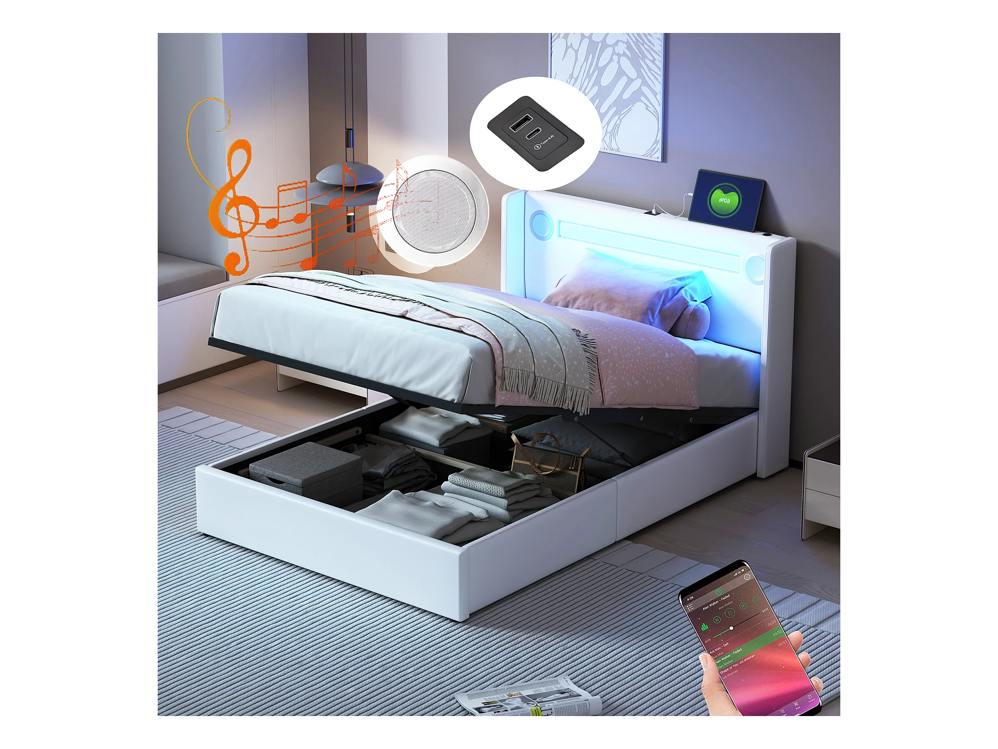 Lit coffre 90x200 cm - Lit ado avec USB, lumière LED et lecteur Bluetooth - PU blanc - sans matelas