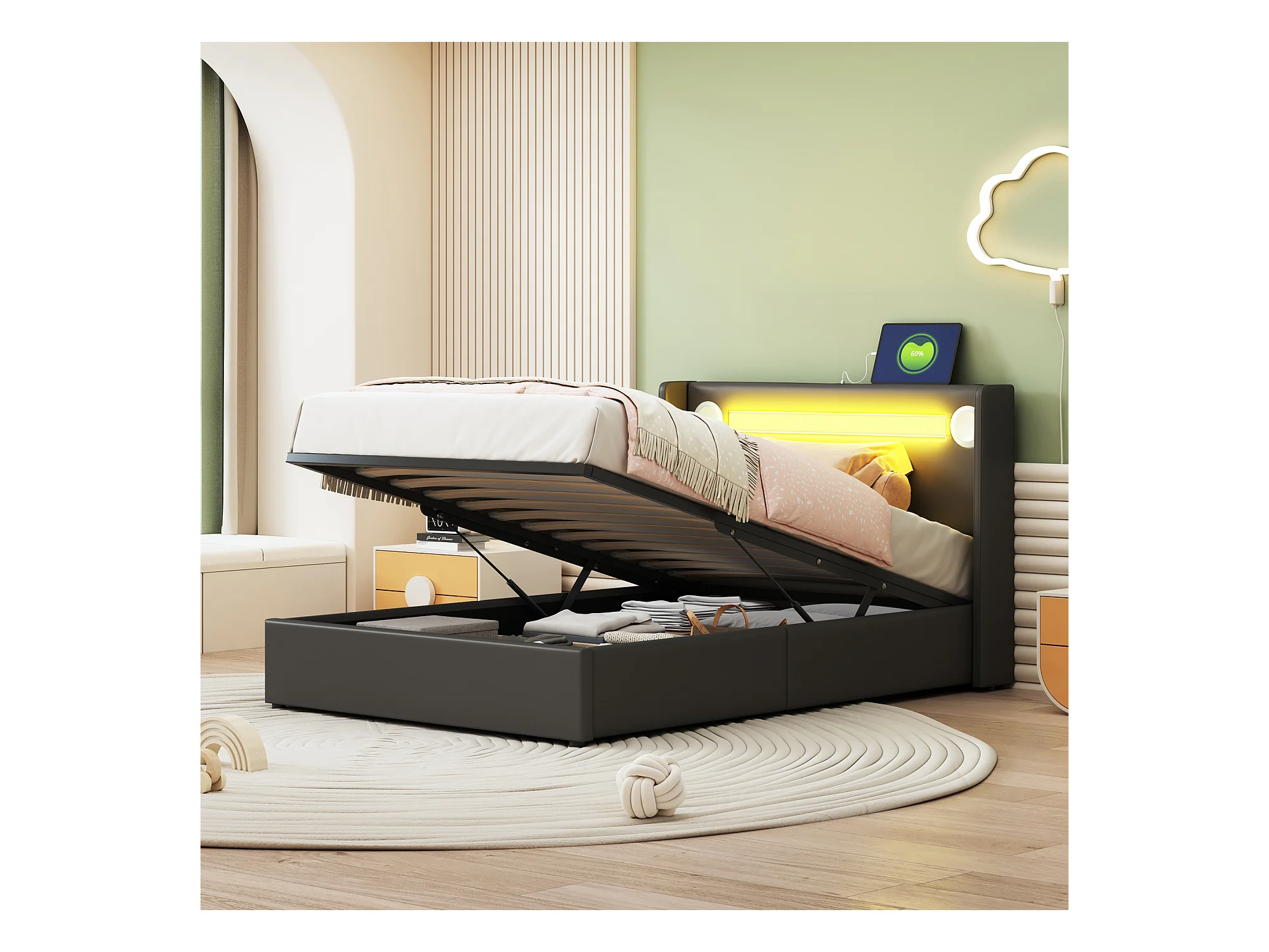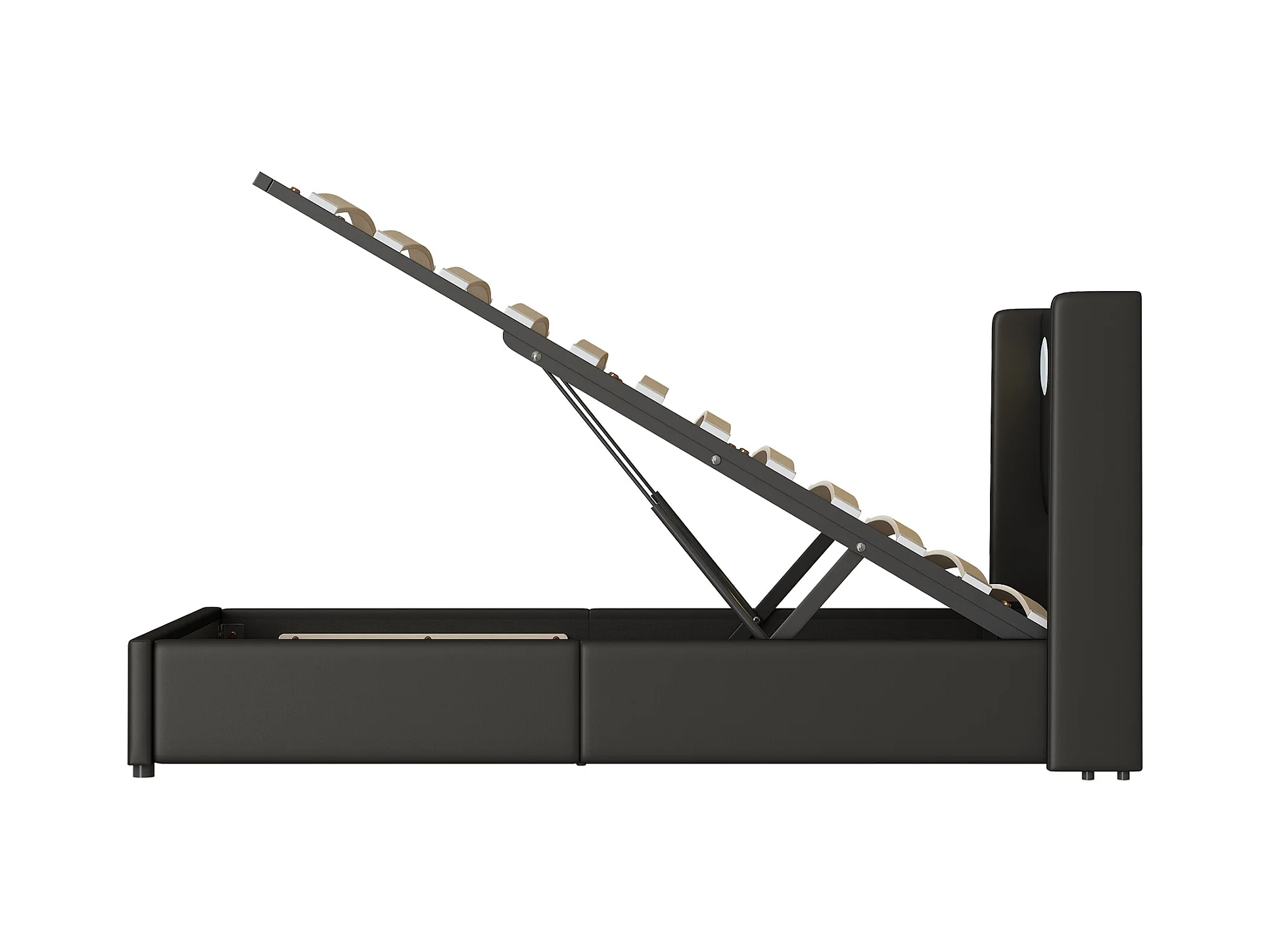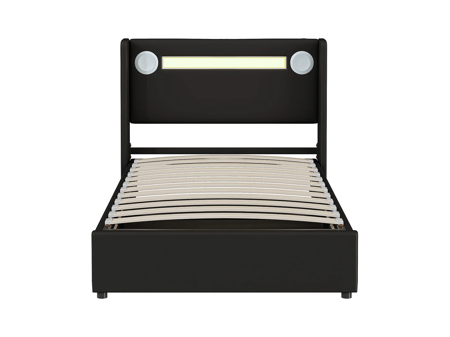Lit coffre 90x200 cm - Lit ado avec USB, lumière LED et lecteur Bluetooth - PU noir - sans matelas