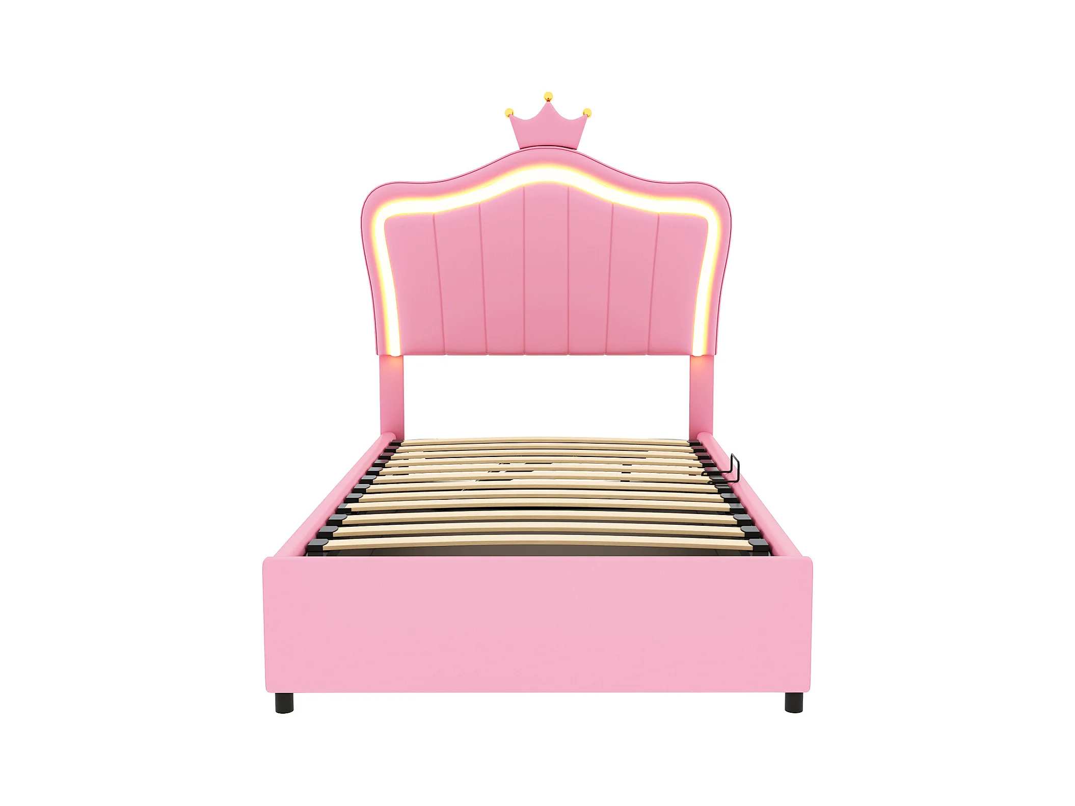 Lit coffre 90x200 cm - Simili cuir rose - Lit enfant avec tête de lit réglable et sommier à lattes - éclairage LED - sans matelas