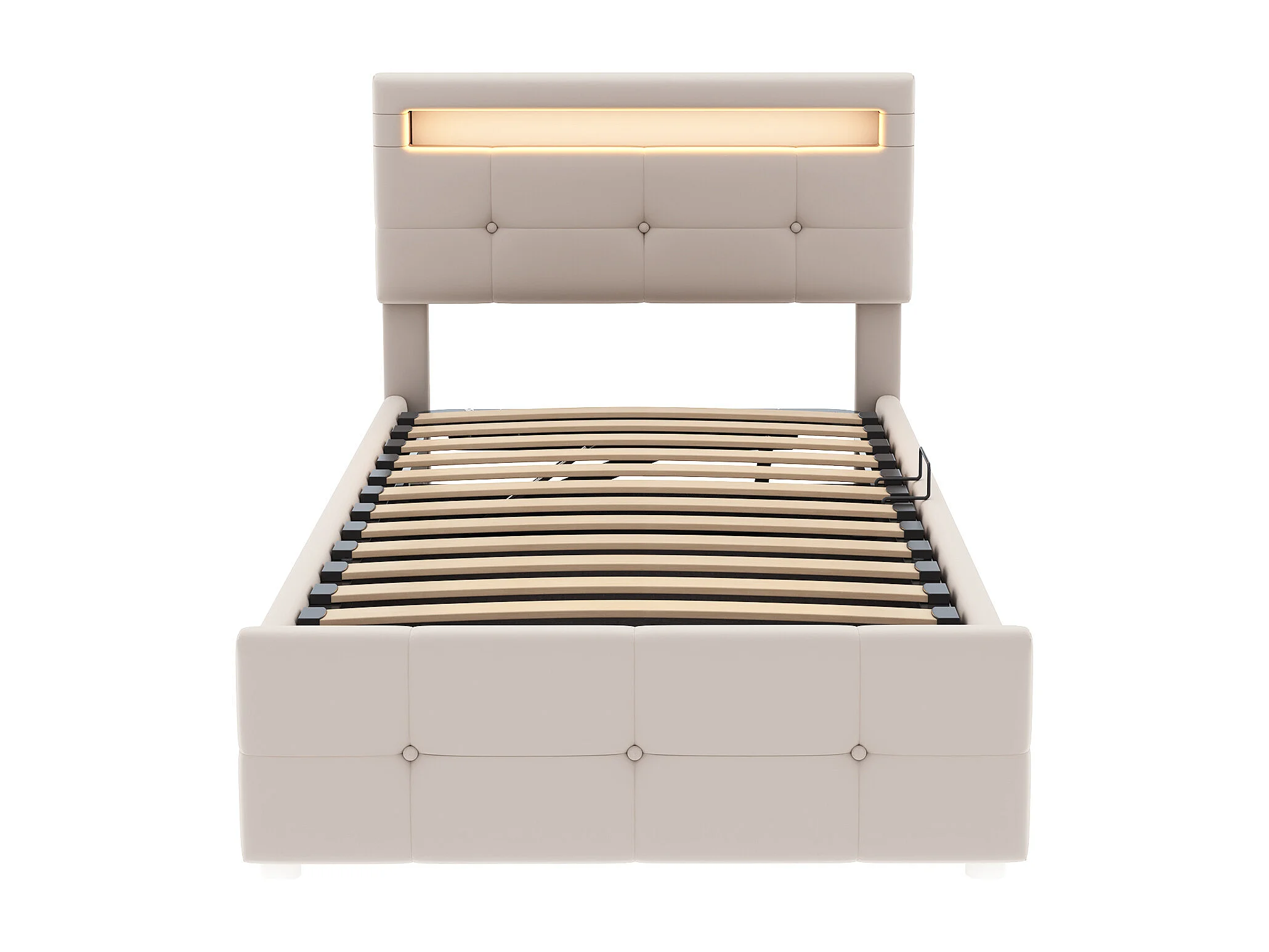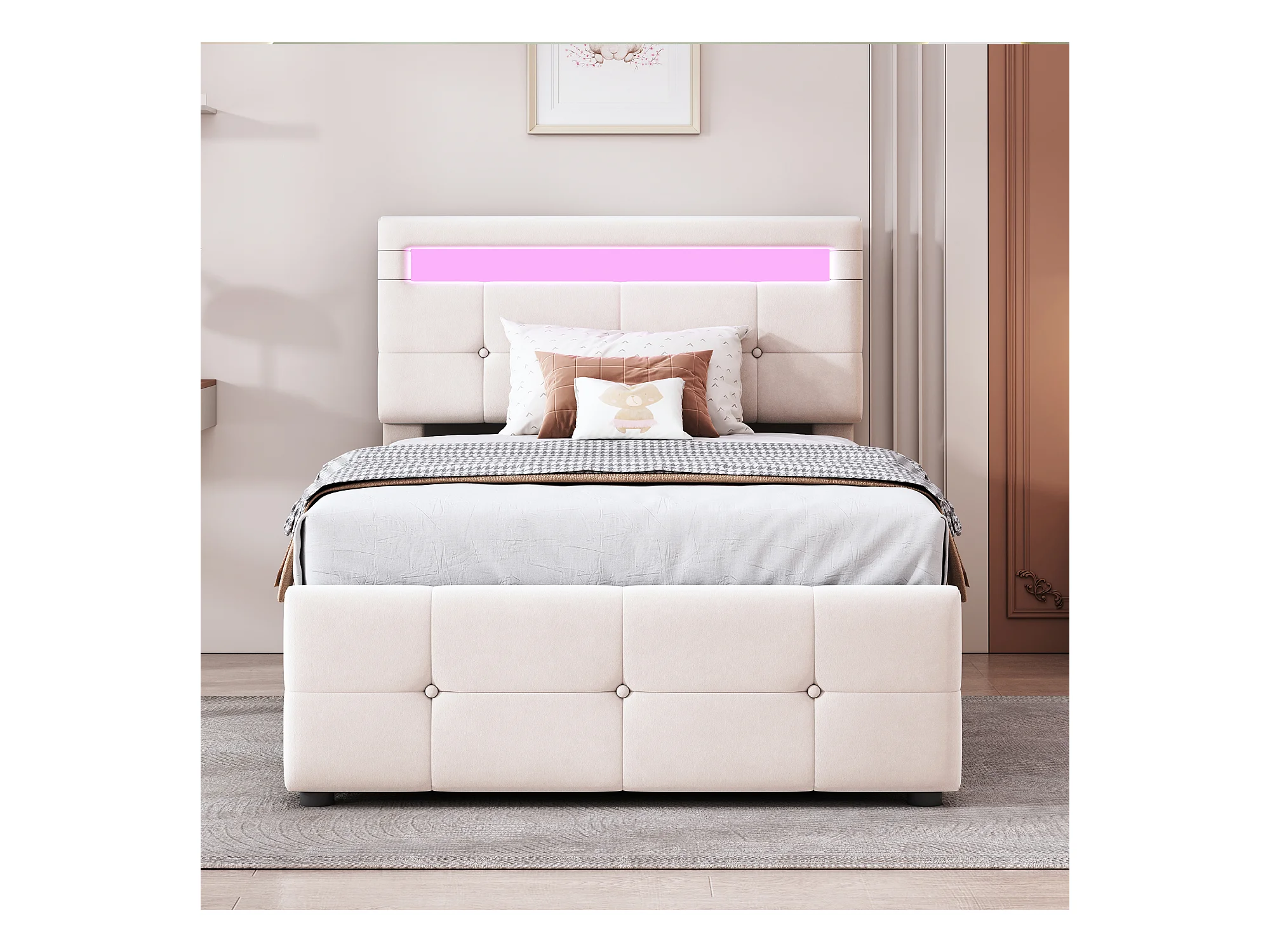 Lit coffre 90x200 cm - velours beige - Lit enfant avec tête de lit réglable et éclairage LED - sans matelas