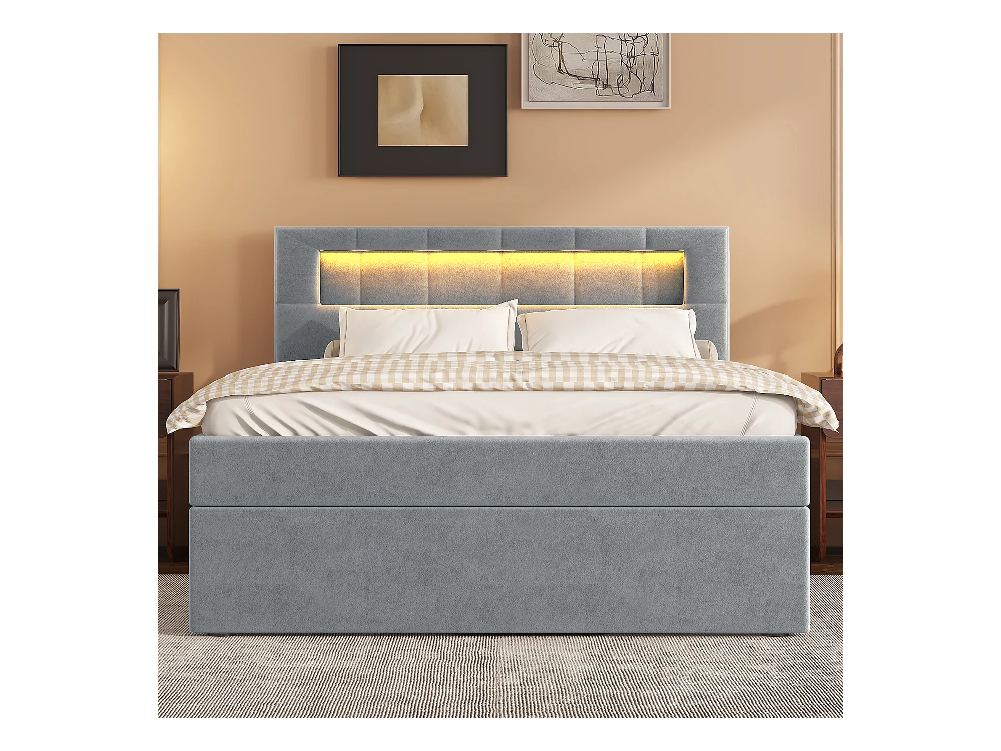Lit coffre 90x200 cm, velours gris, Lit adulte avec tête de lit capitonnée et éclairage LED, sans matelas