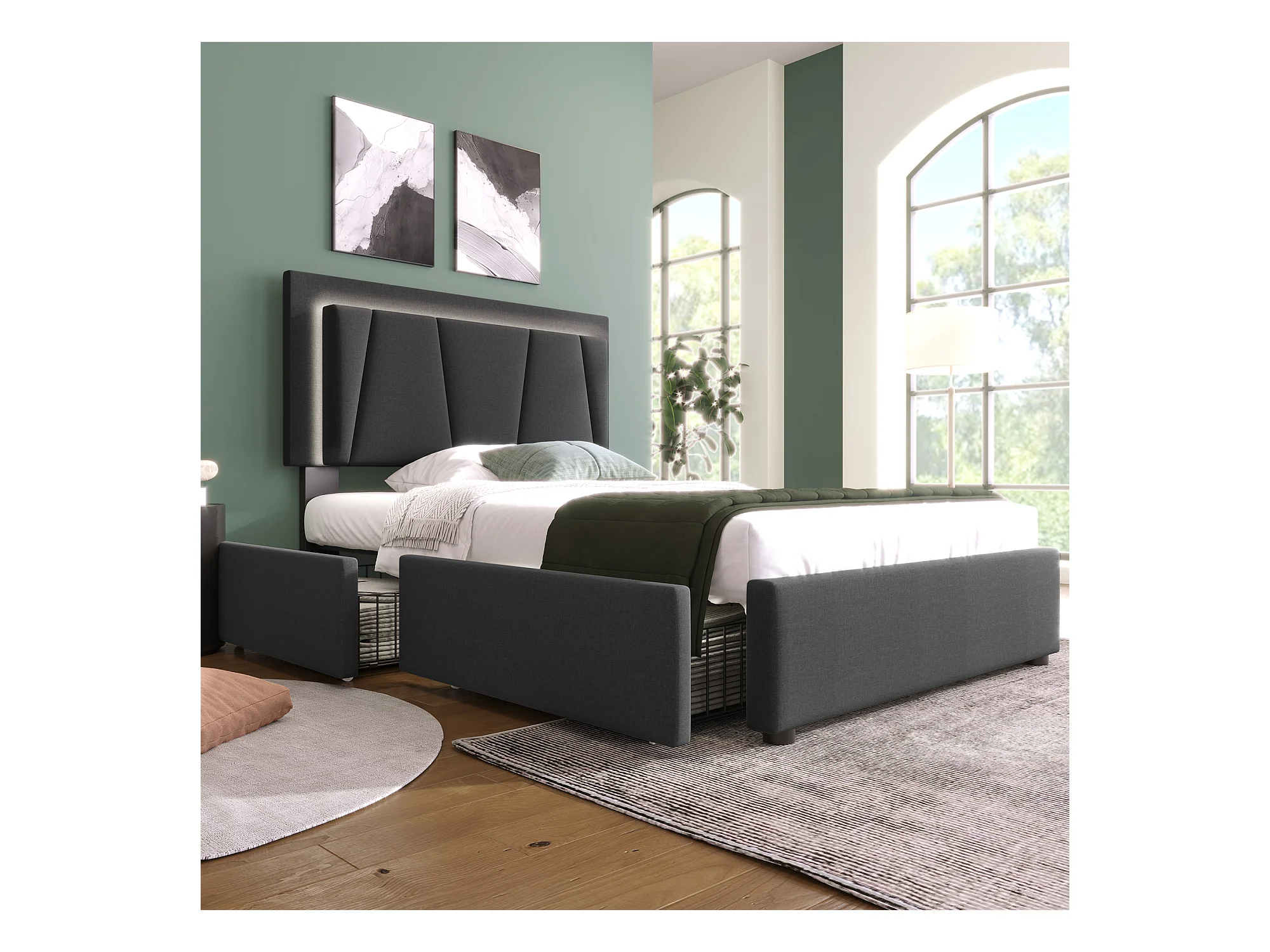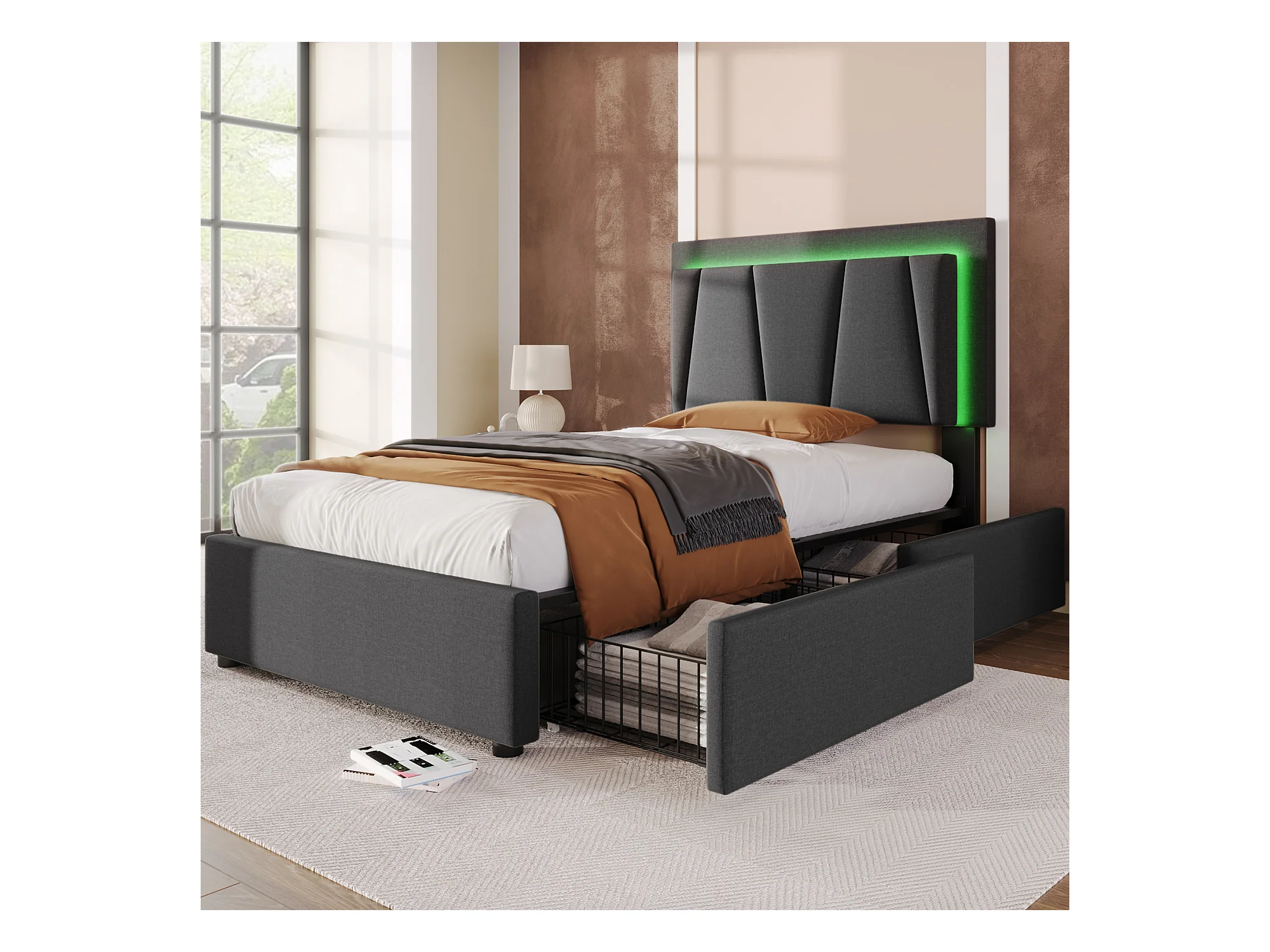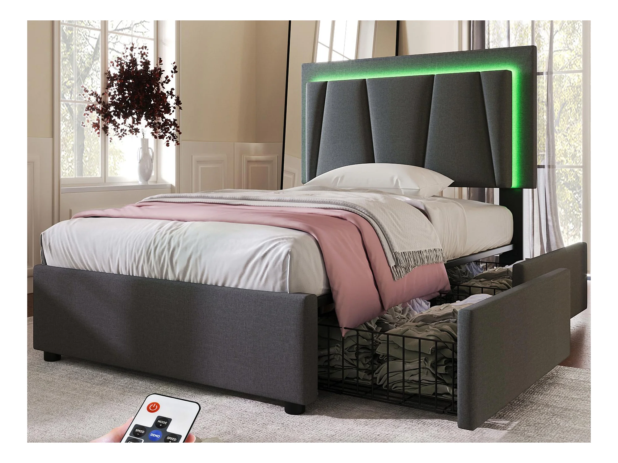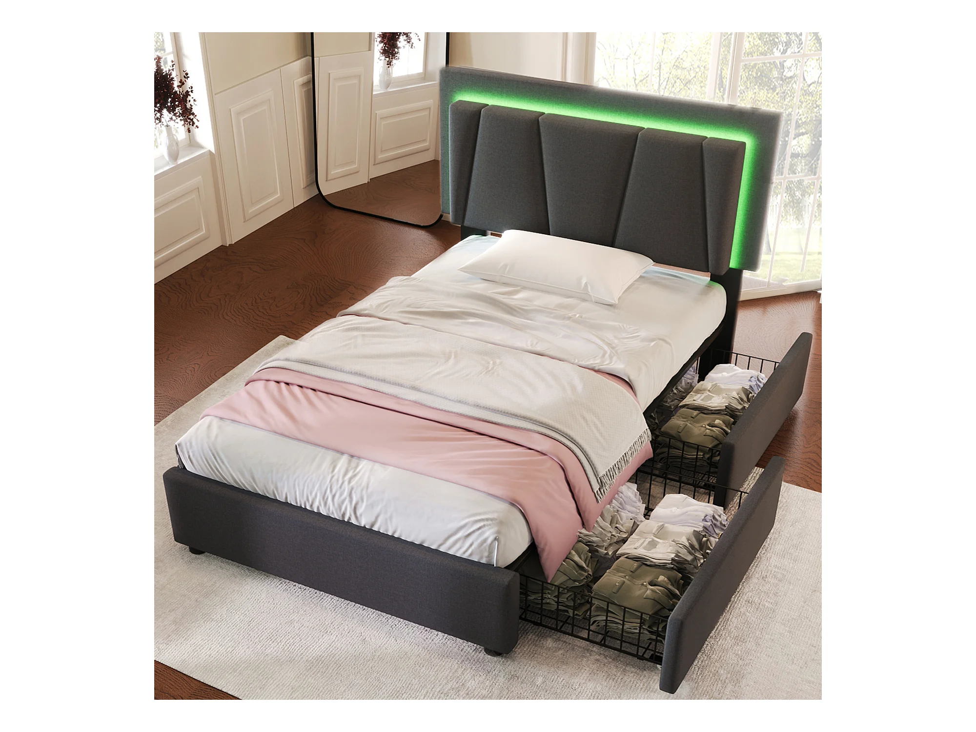 Lit 90x200cm avec 2 tiroirs + LED + sommier à lattes - lin - gris