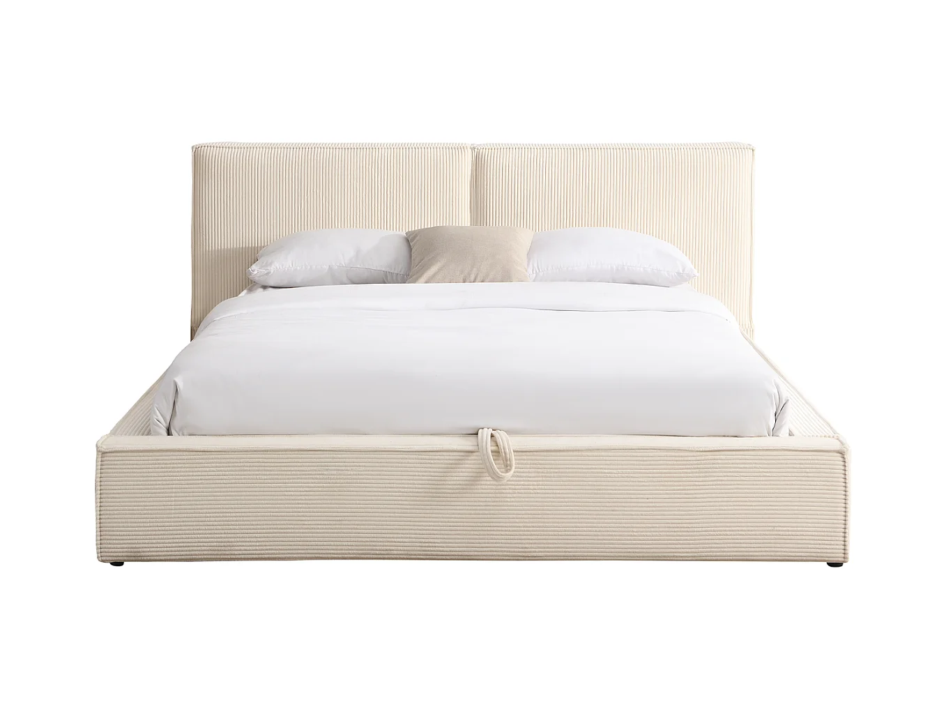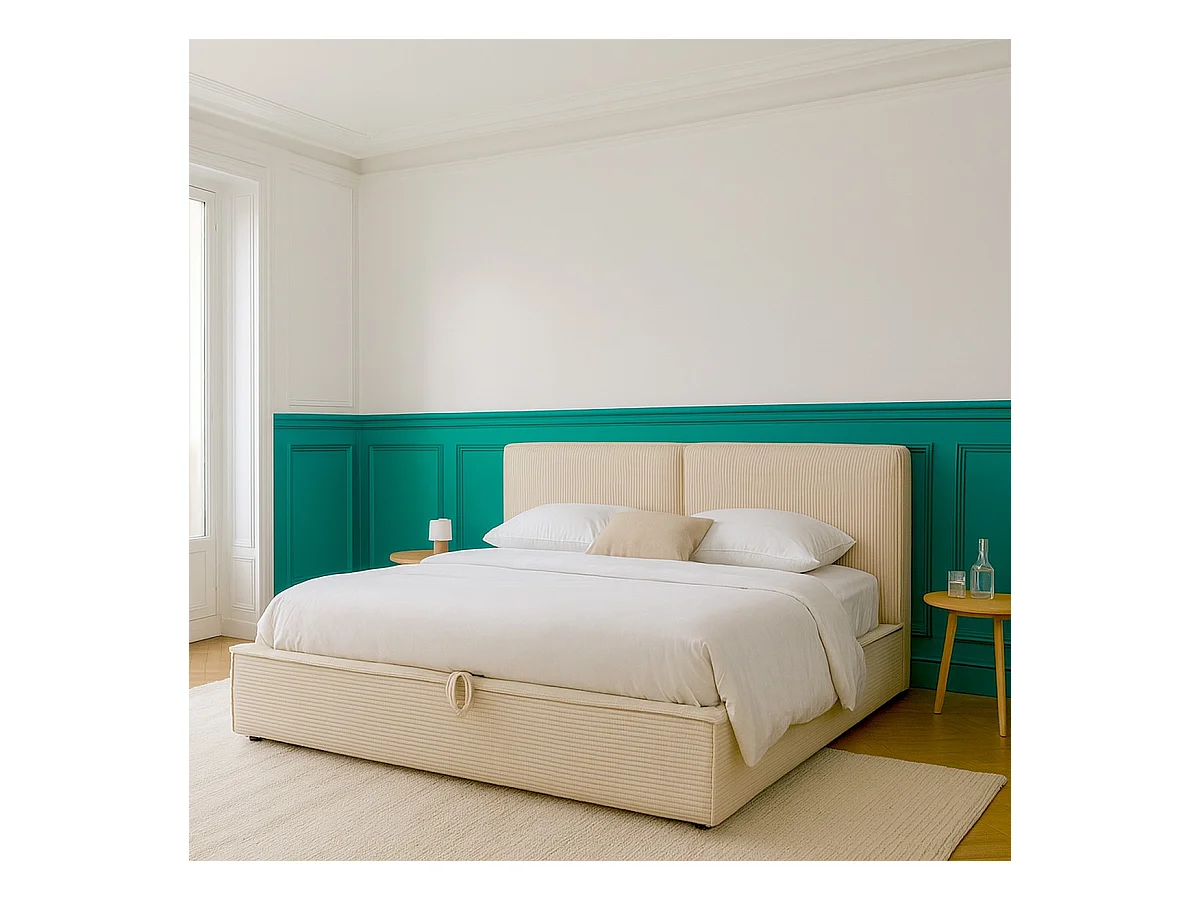Lit coffre adulte 140x190 cm avec sommier et tête de lit matelassée en velours côtelé beige - Arno