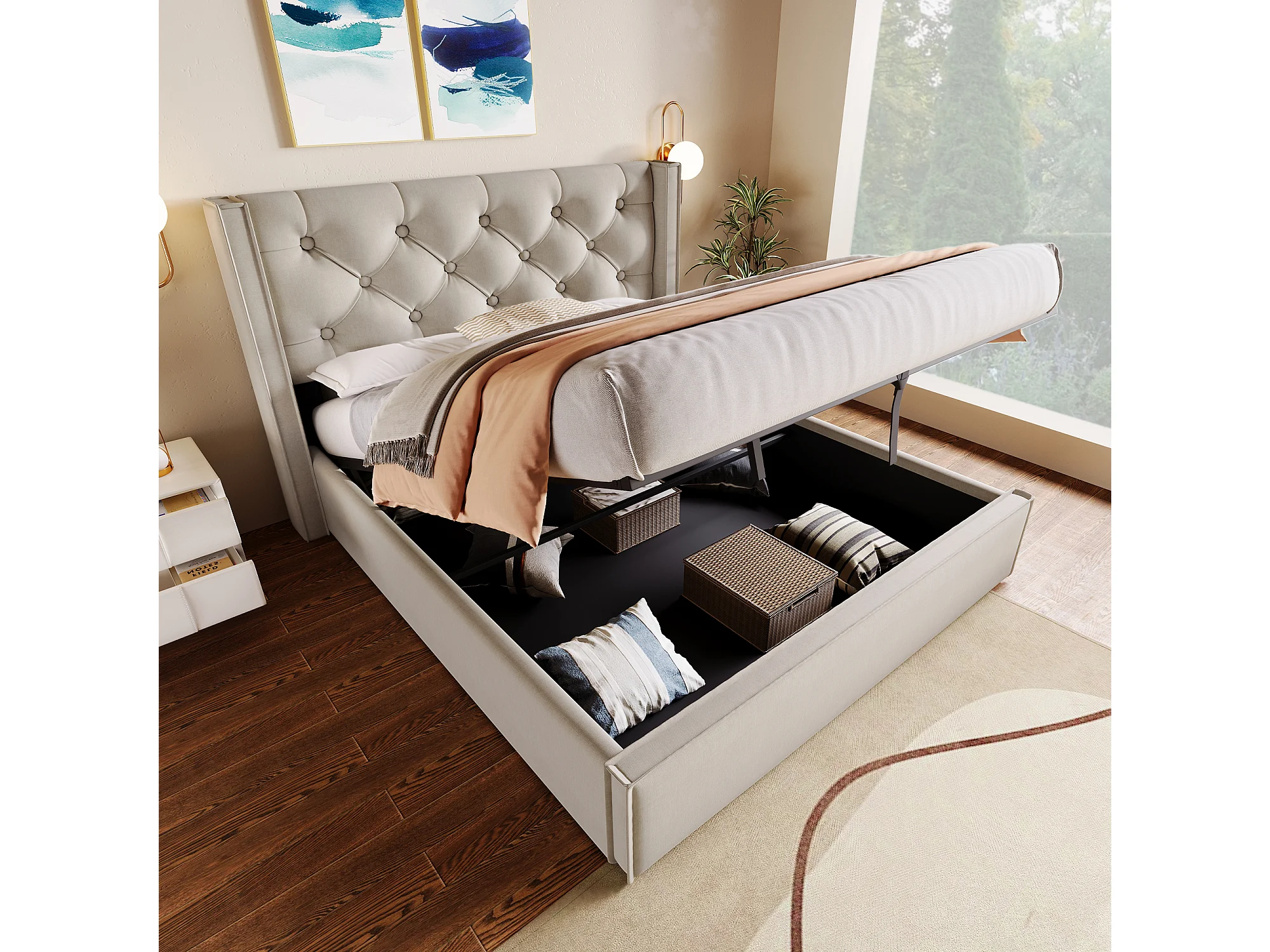 Lit coffre 140x200cm avec sommier à lattes - cadre métalique et lattes en bois - coton - gris clair (sans matelas)