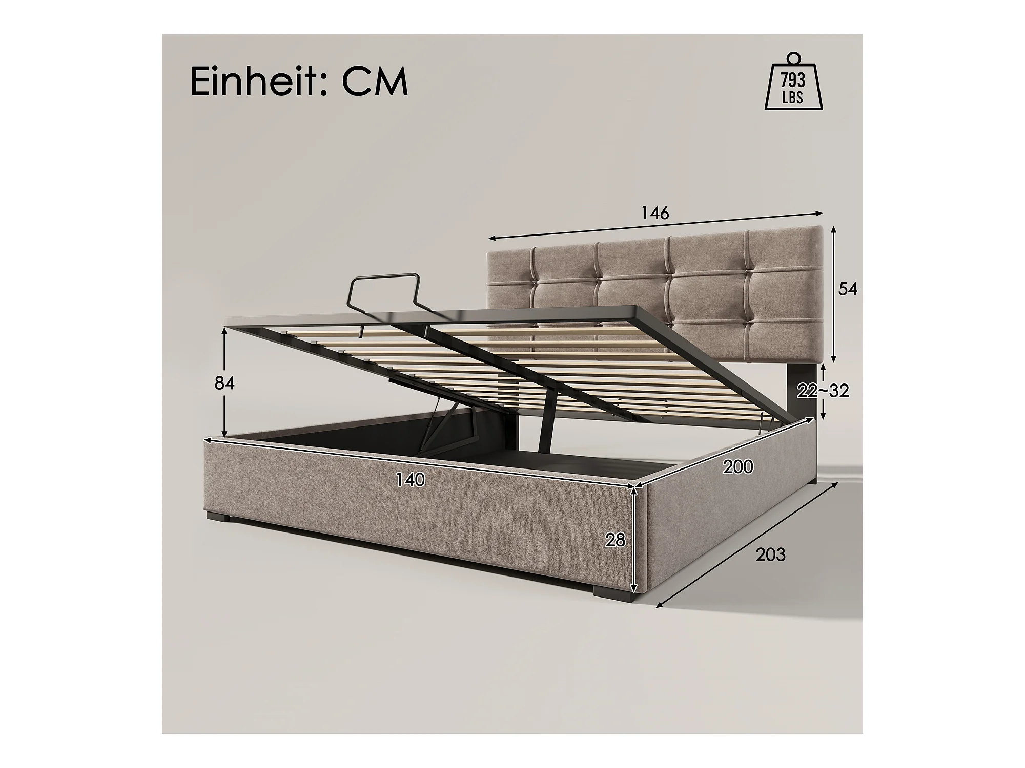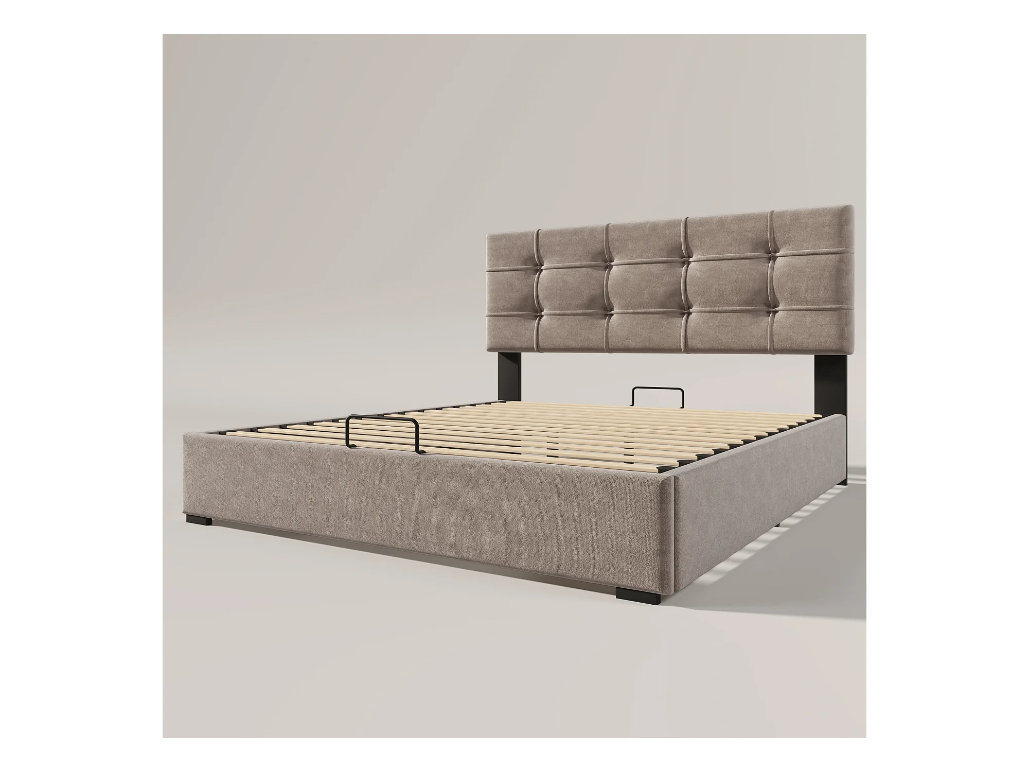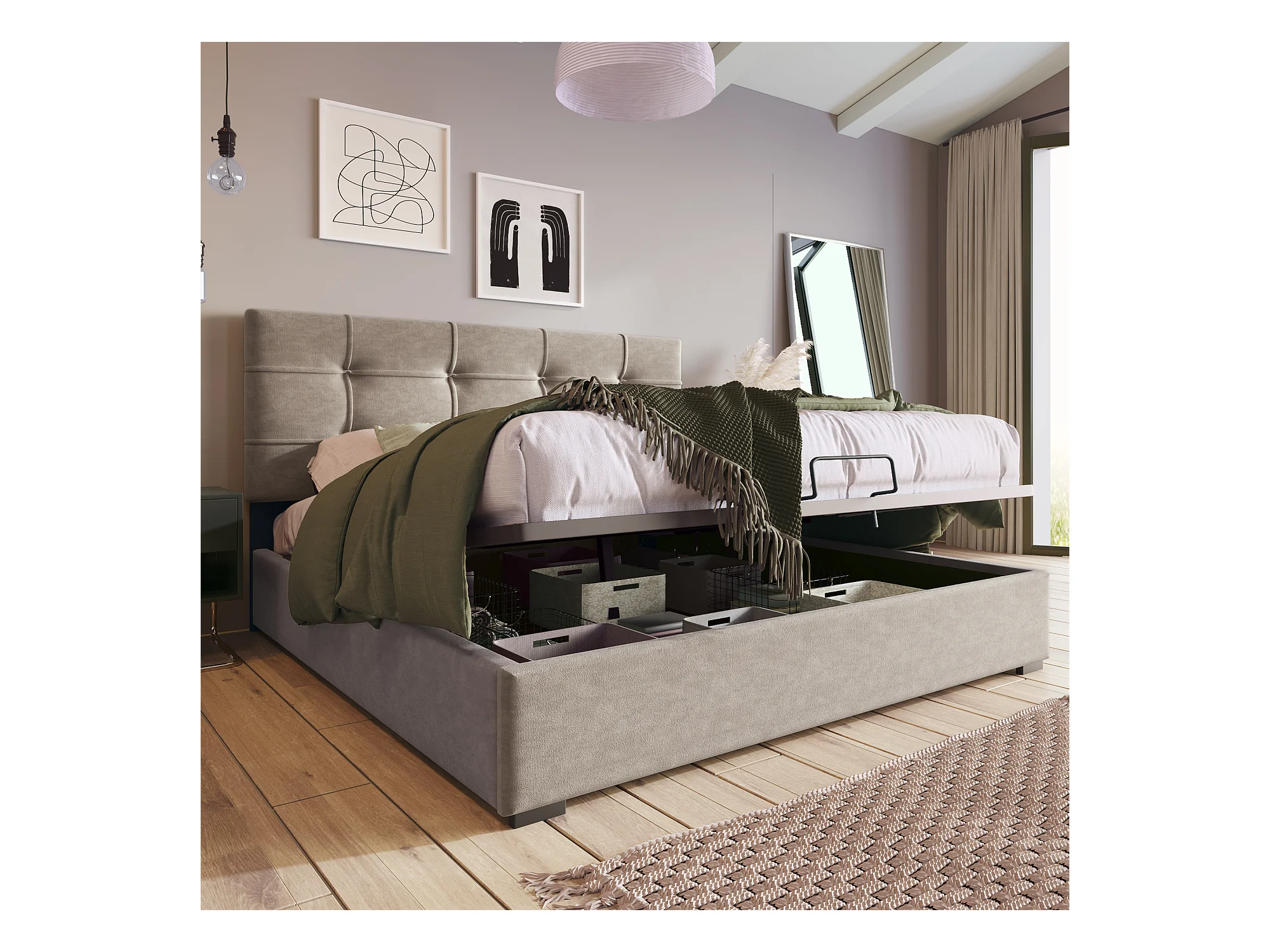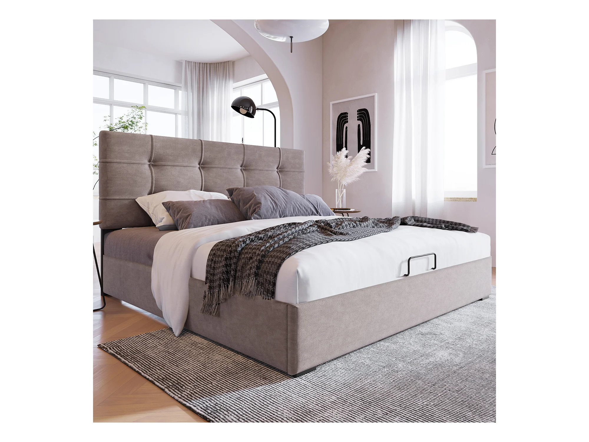 Lit coffre adulte 140x200cm gris clair en velours, tête de lit réglable en hauteur, sans matelas