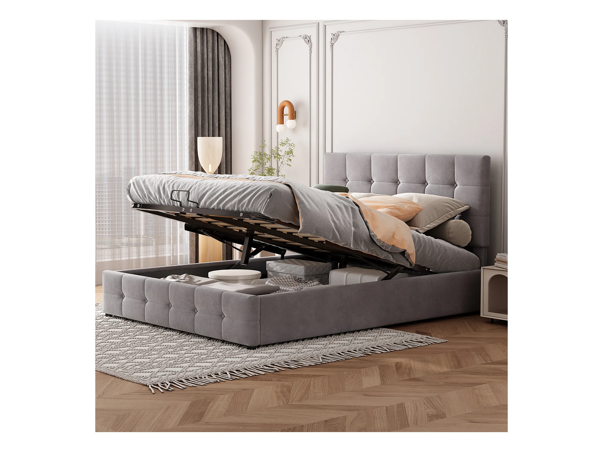 Lit coffre adulte 140x200cm gris en velours, tête de lit réglable en hauteur, sans matelas