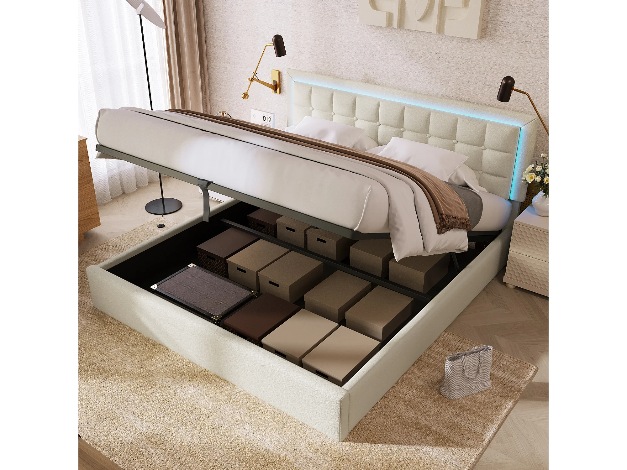Lit coffre 160x200 cm avec sommier - tête de lit rembourrée avec LED - similicuir blanc (sans matelas)