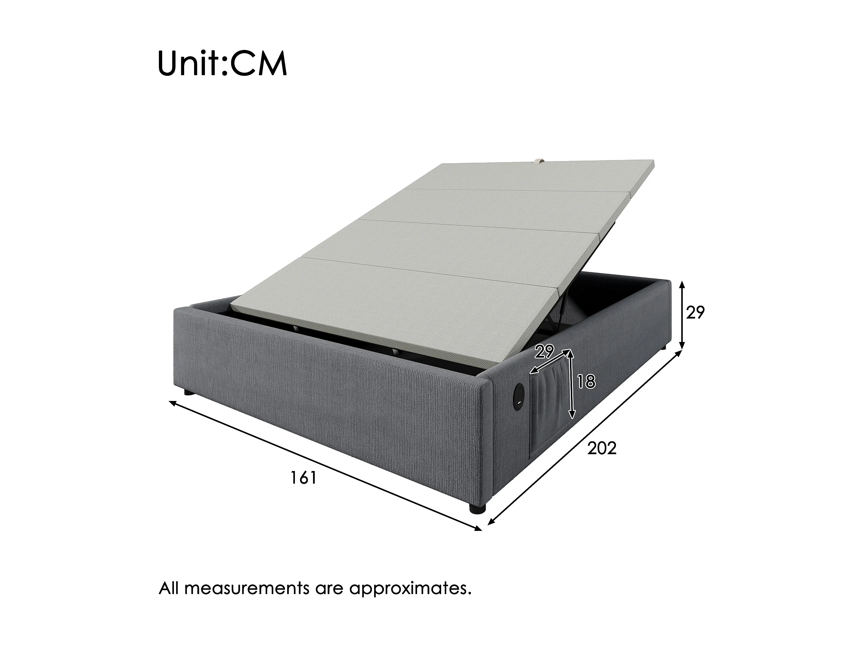 Lit coffre 160x200 cm sans tête de lit - avec USB et rangement latéral - lin coton - gris (sans matelas)