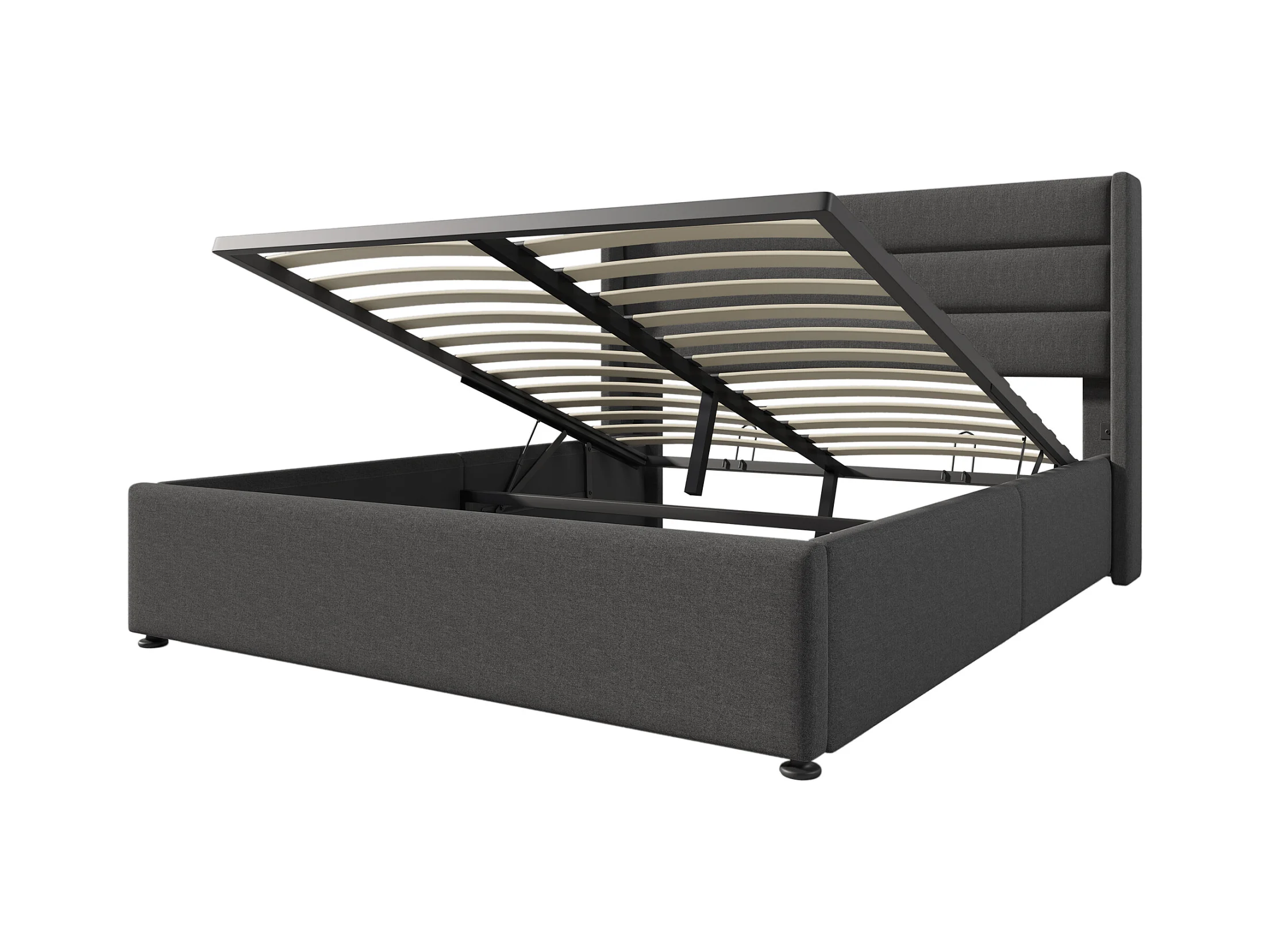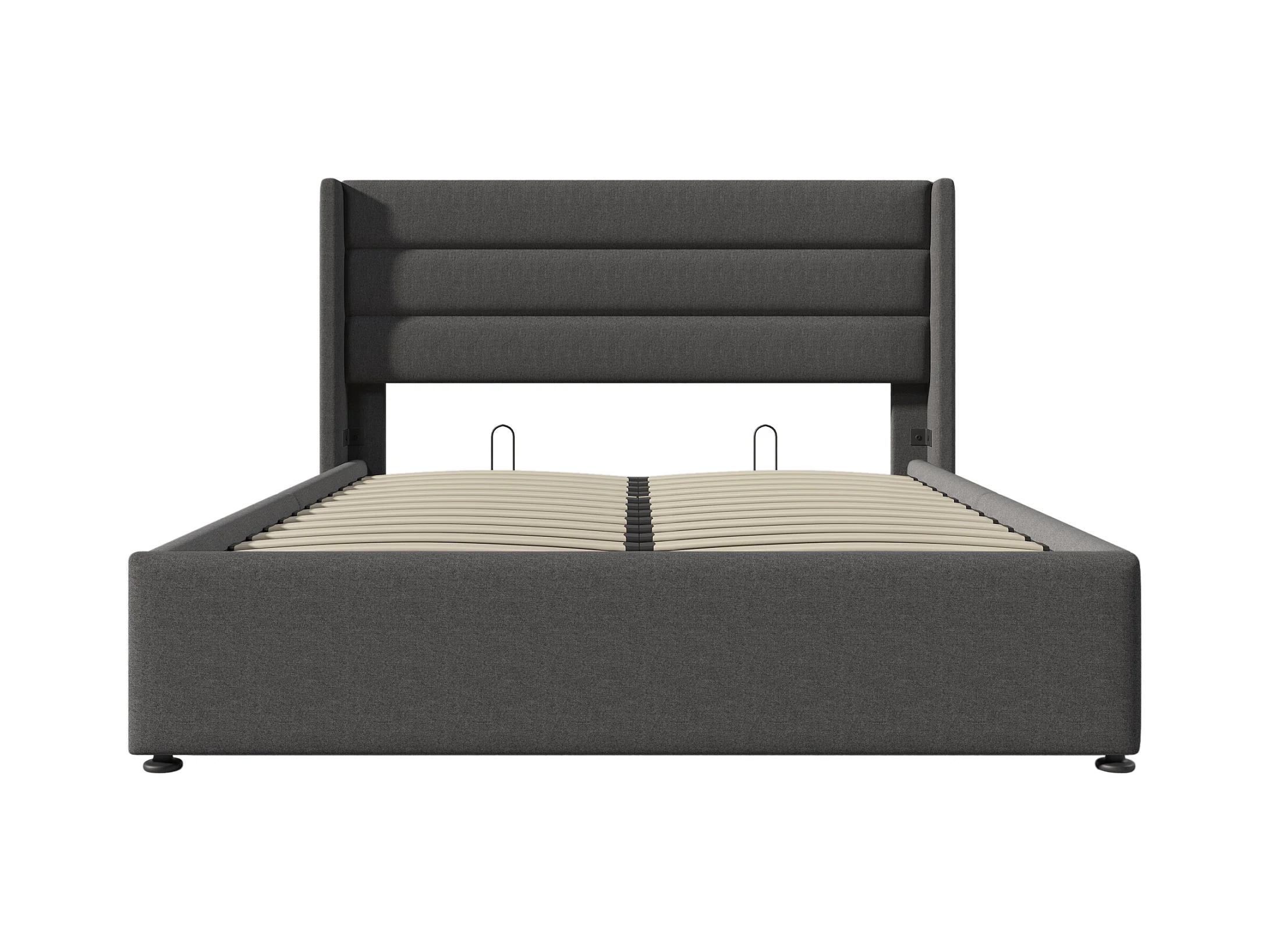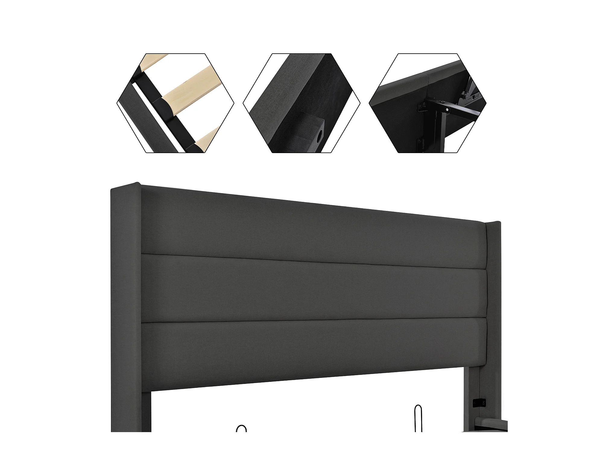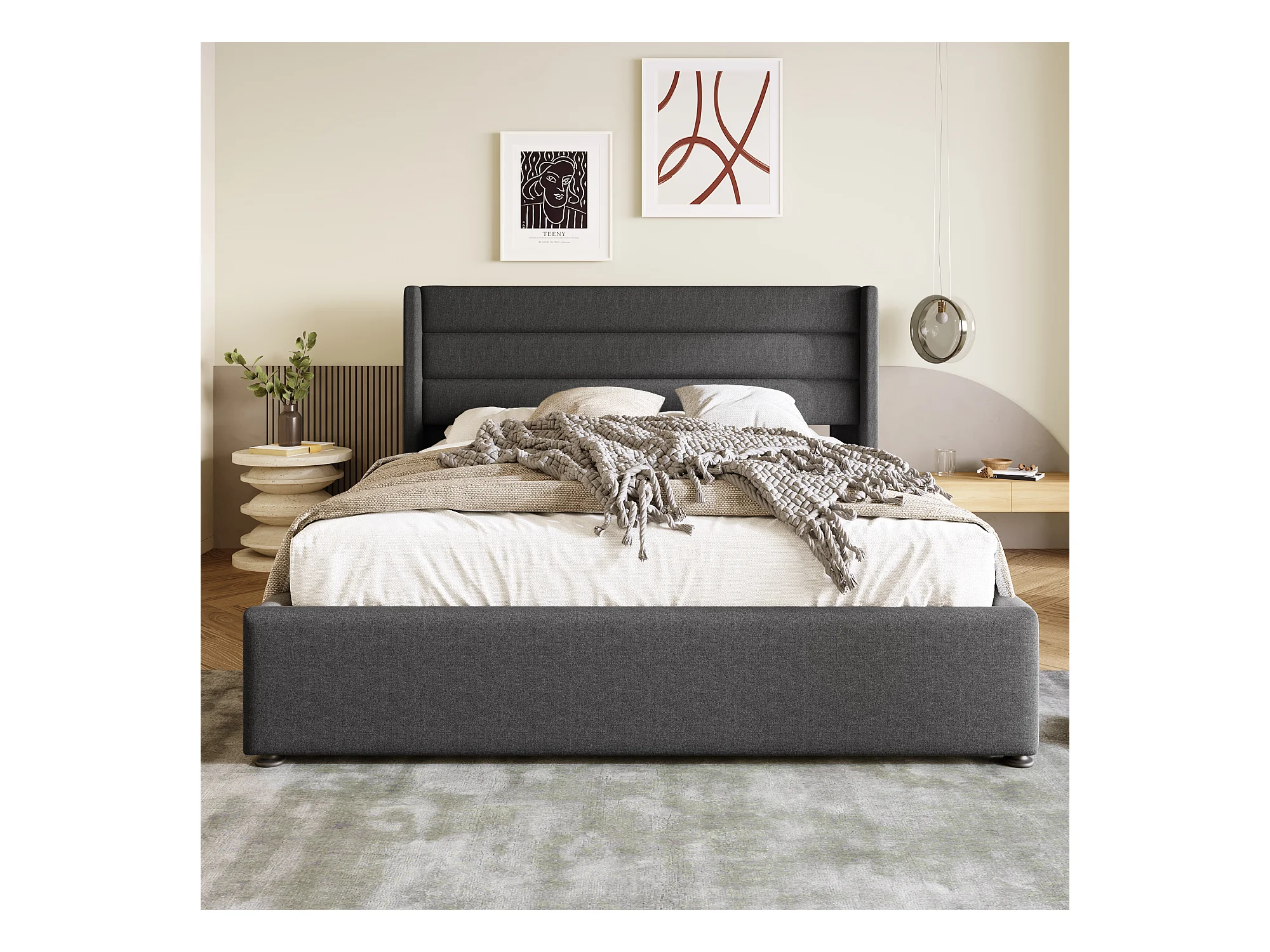 Lit coffre adulte 160x200cm, sommier à lattes en bois, métal+lin, gris, sans matelas