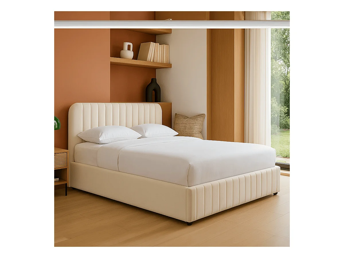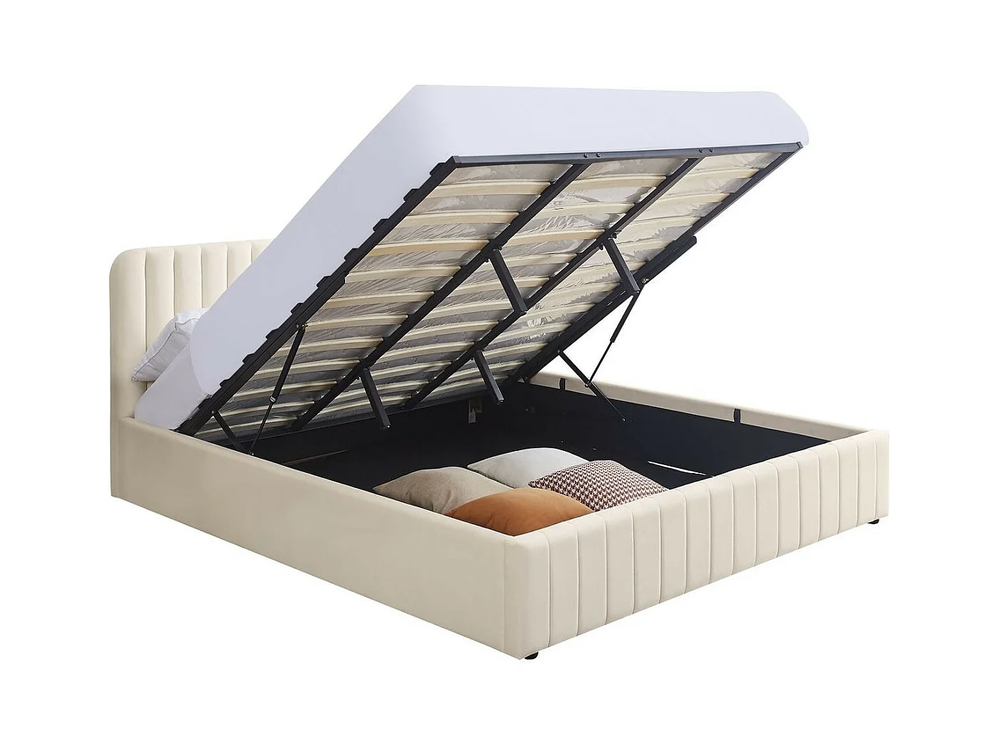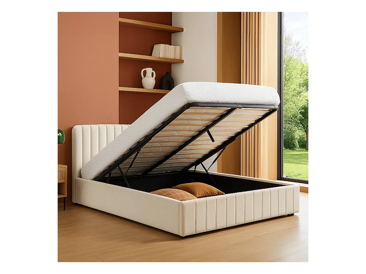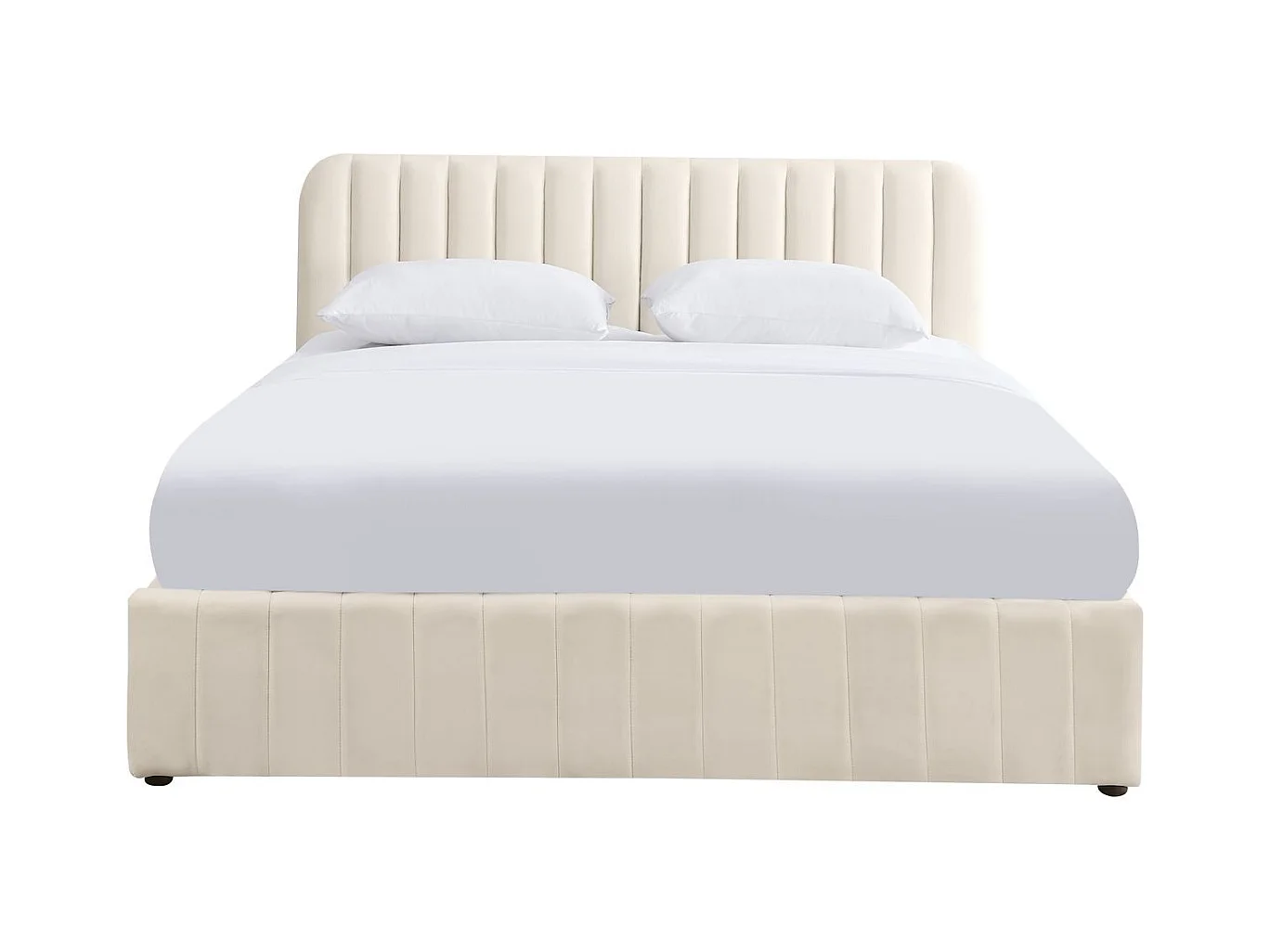 Lit coffre adulte 180x200 cm avec tête de lit capitonnée en velours beige - Ava