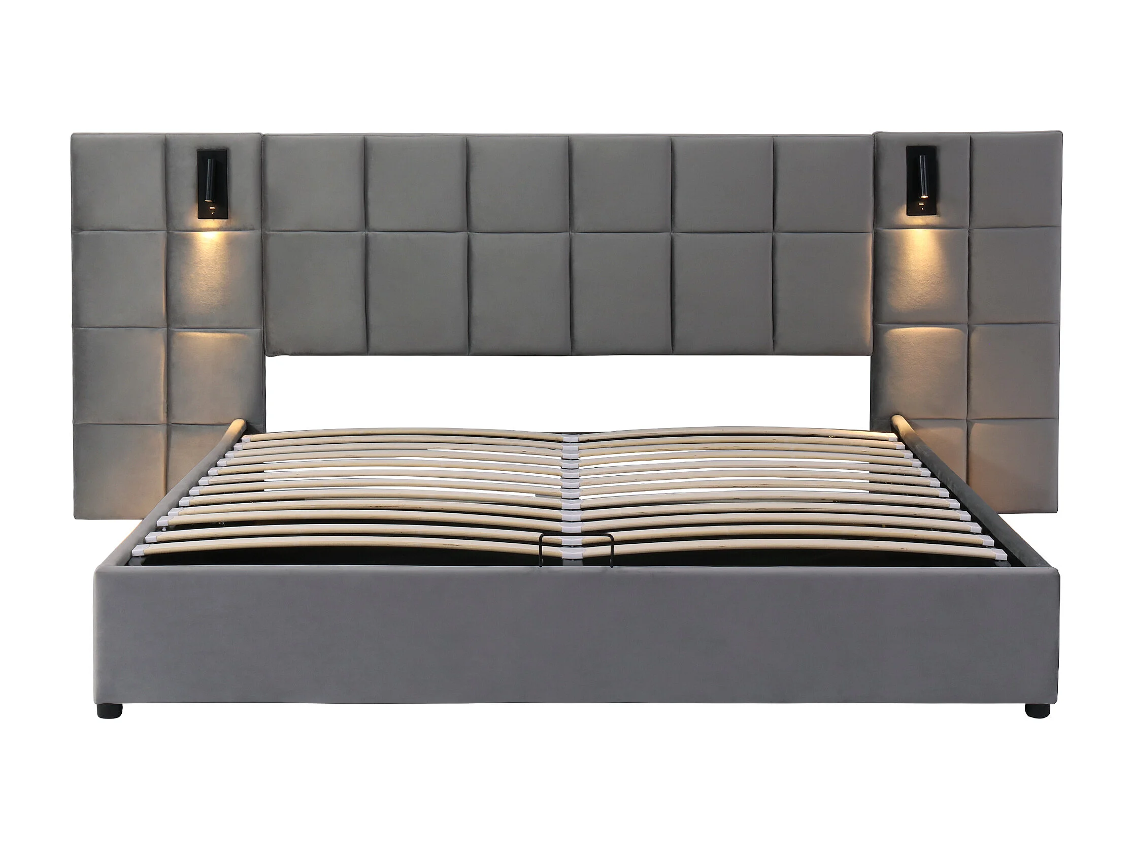 Lit coffre adulte 180x200cm avec tête de lit large et 2 lampes de lecture, tissu en velours gris, sans matelas ni chevet
