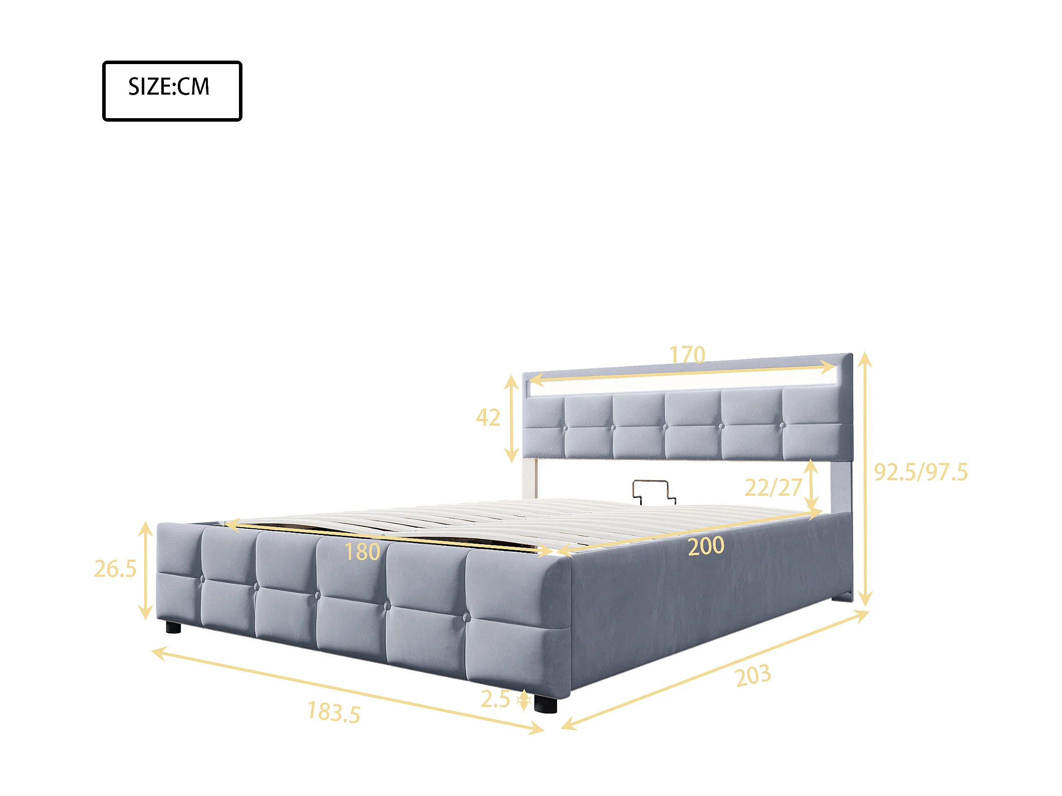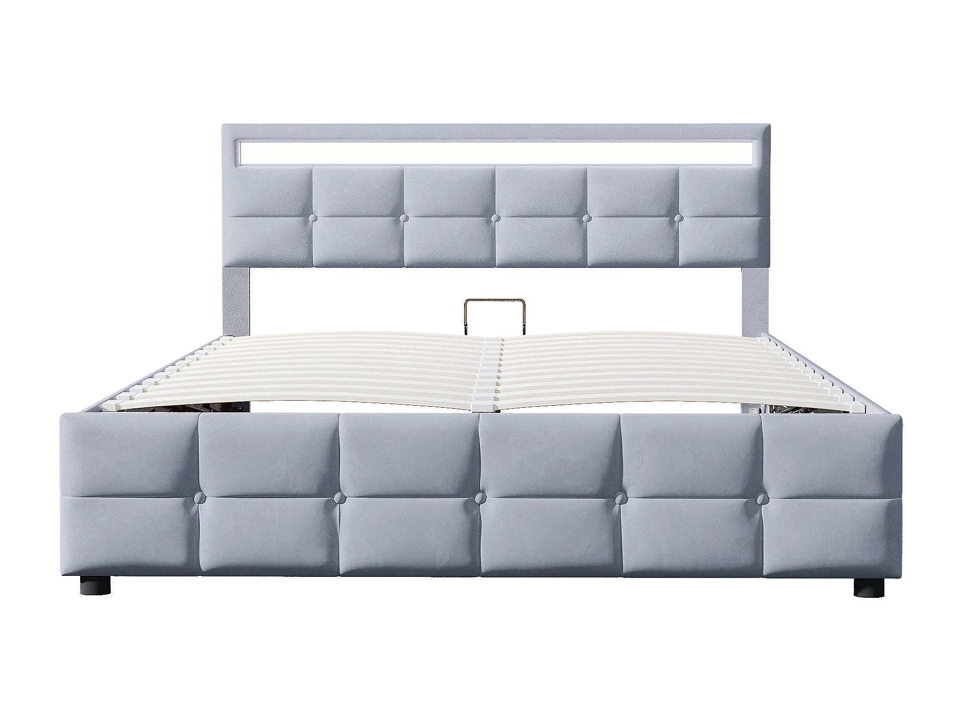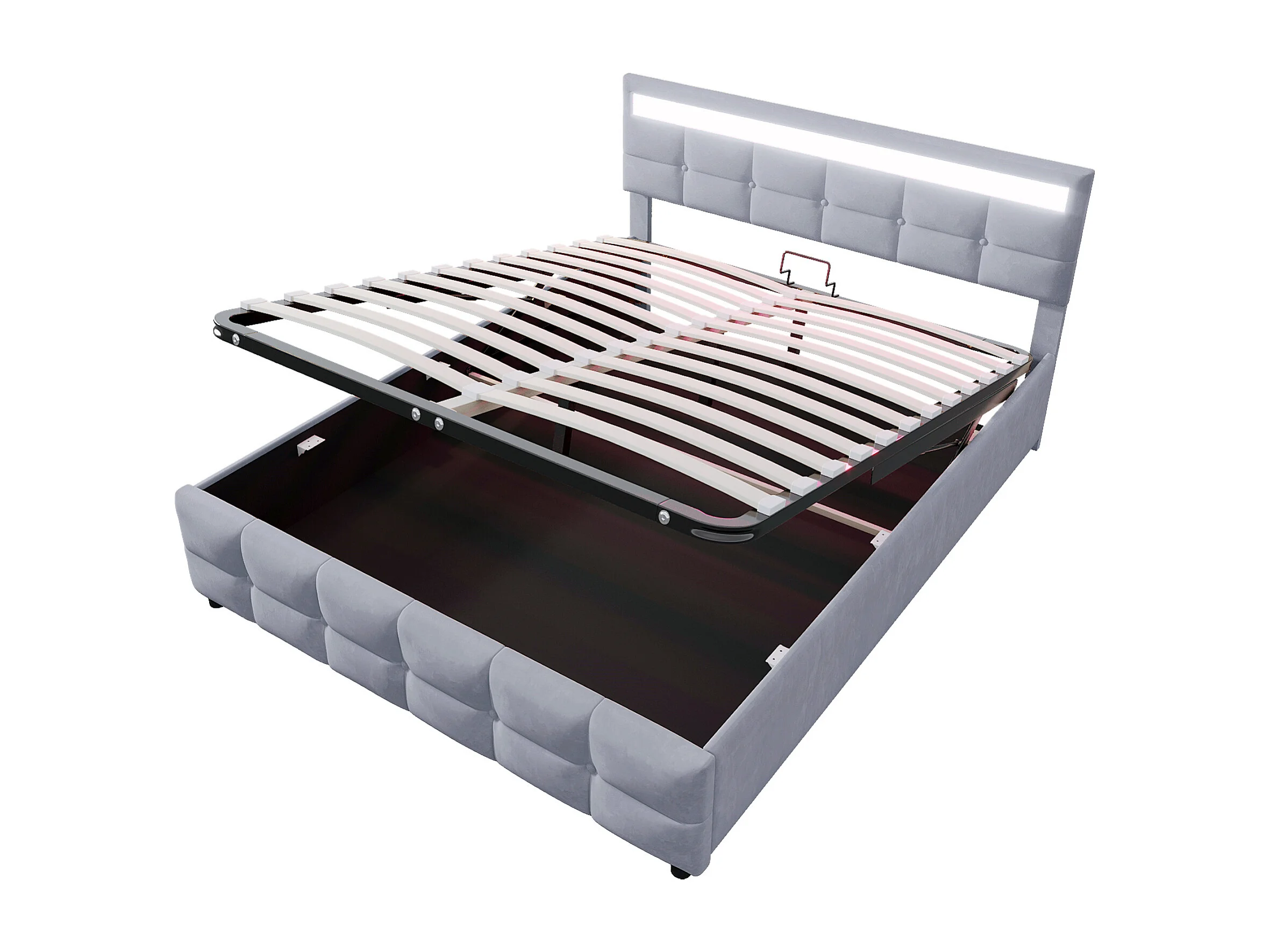Lit coffre adulte 180x200cm gris avec LED en tissu velours hollandais, sans matelas