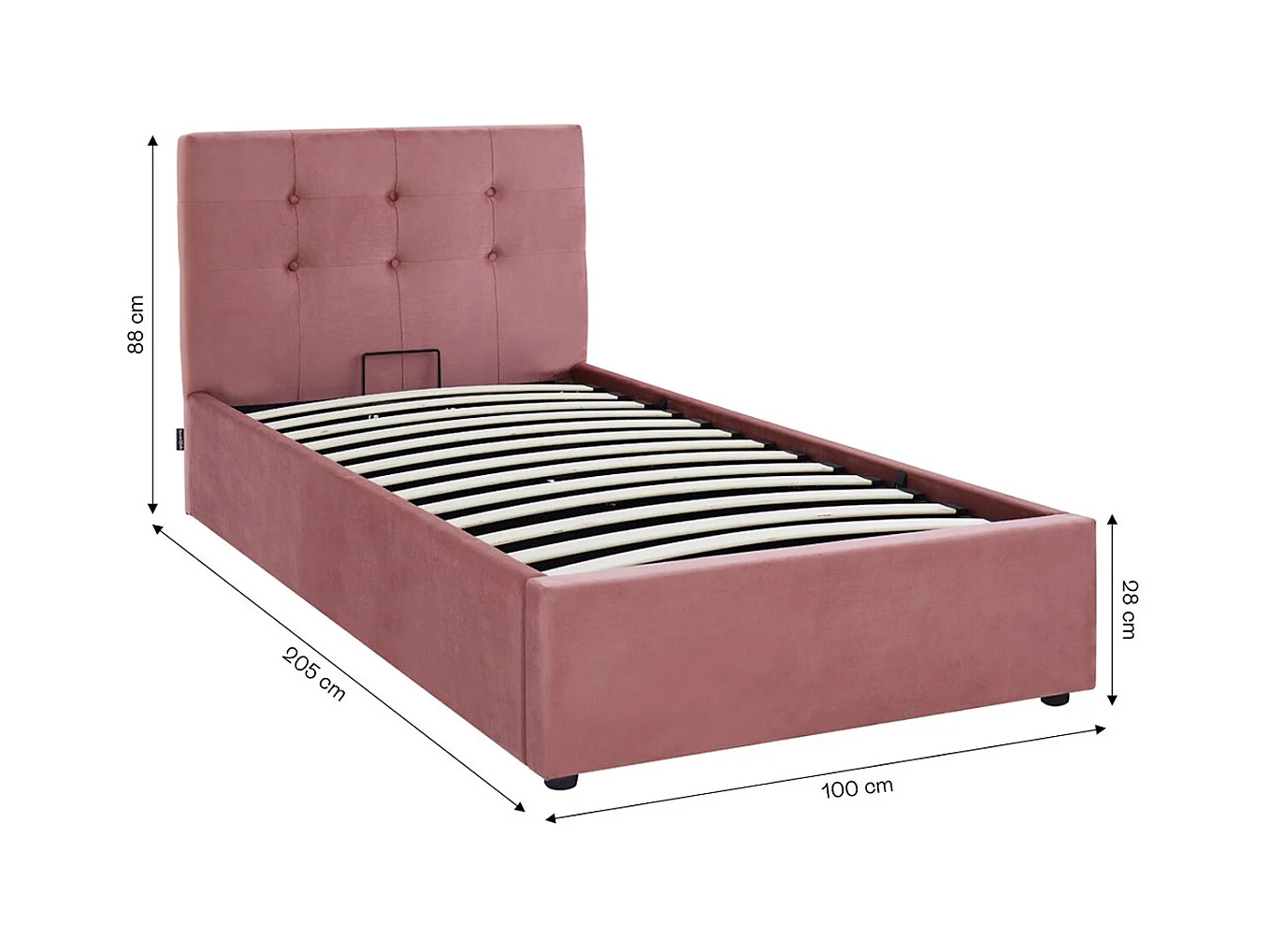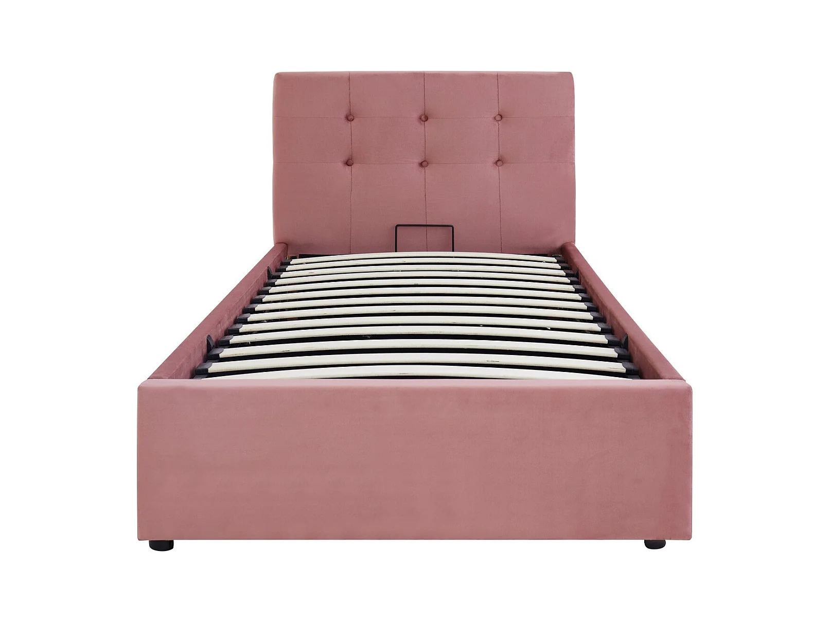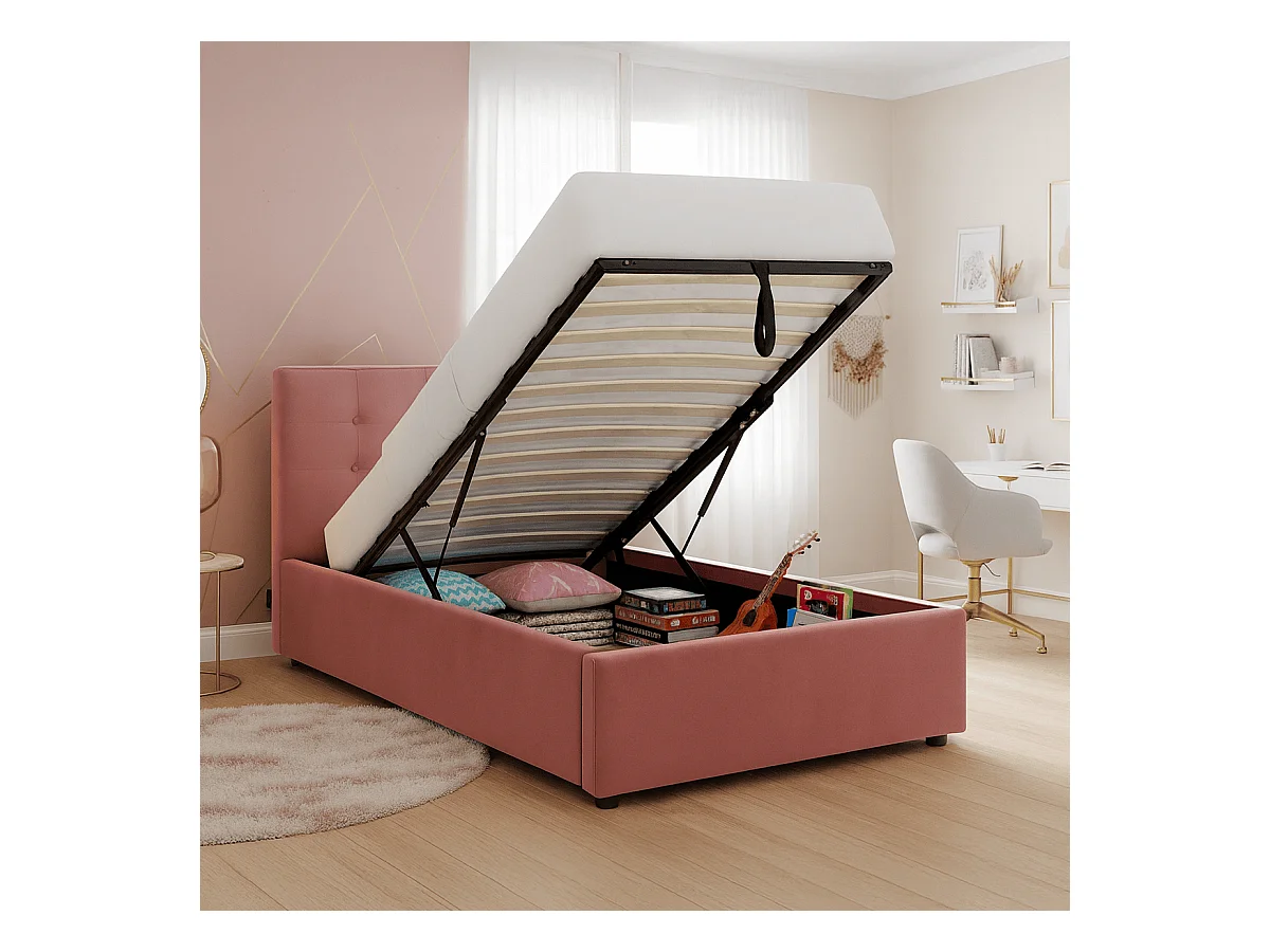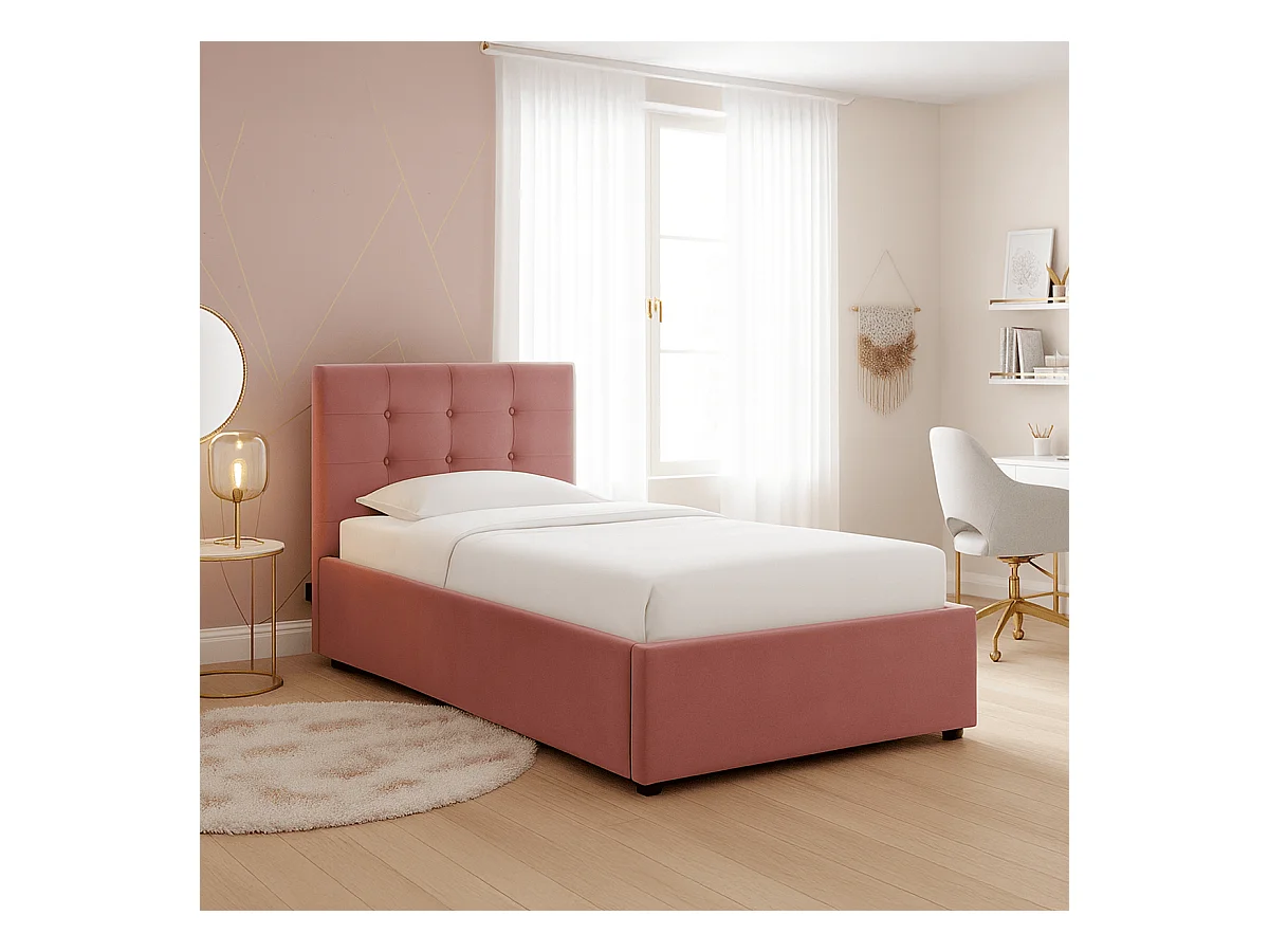 Lit coffre adulte 90x190 cm avec tête de lit matelassée en velours rose et sommier - Tina