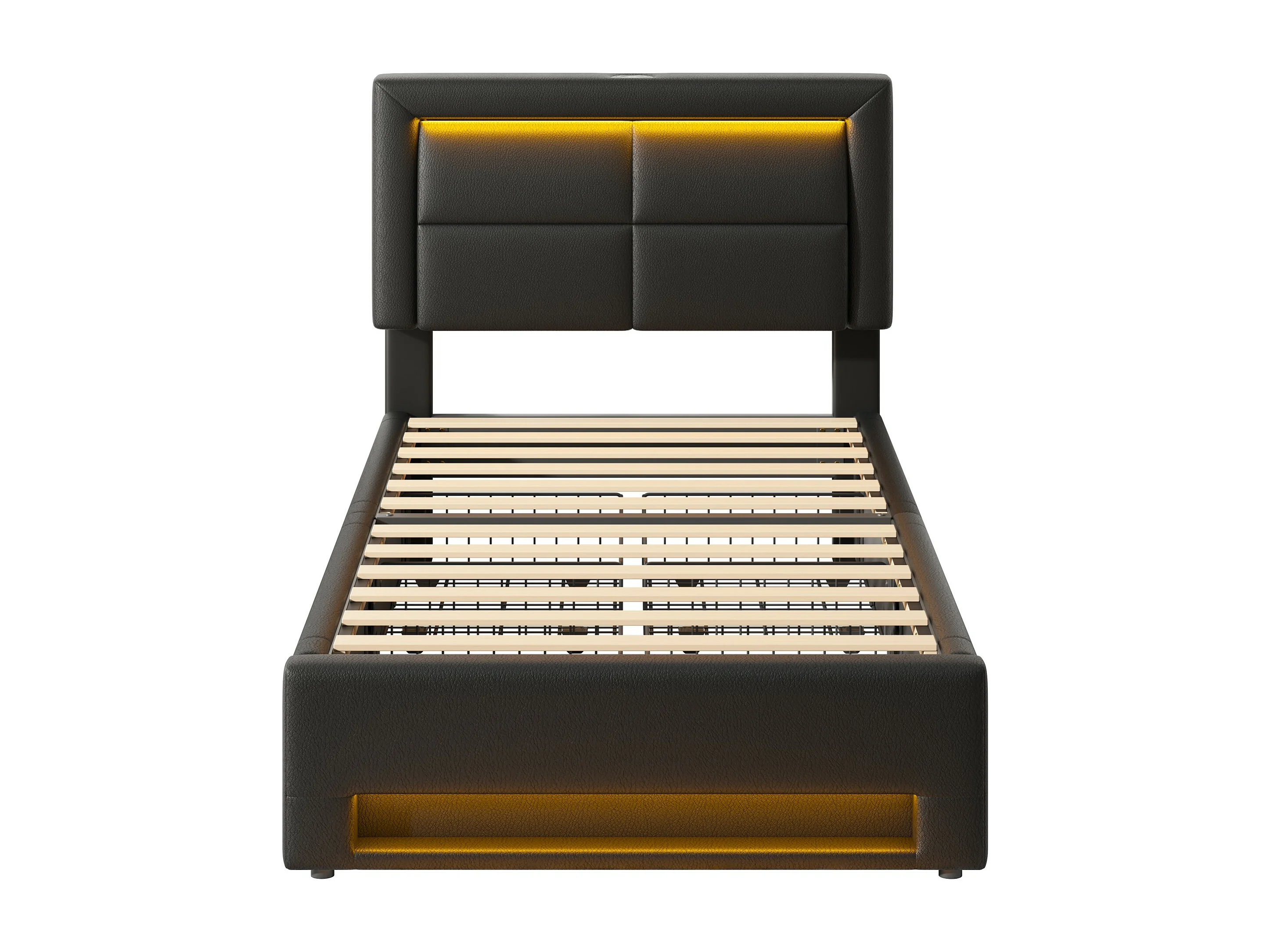 Lit coffre adulte 90x190 cm noir avec LED + 4 tiroirs de rangement, interface USB (sans fil et filaire), sans matelas, PU