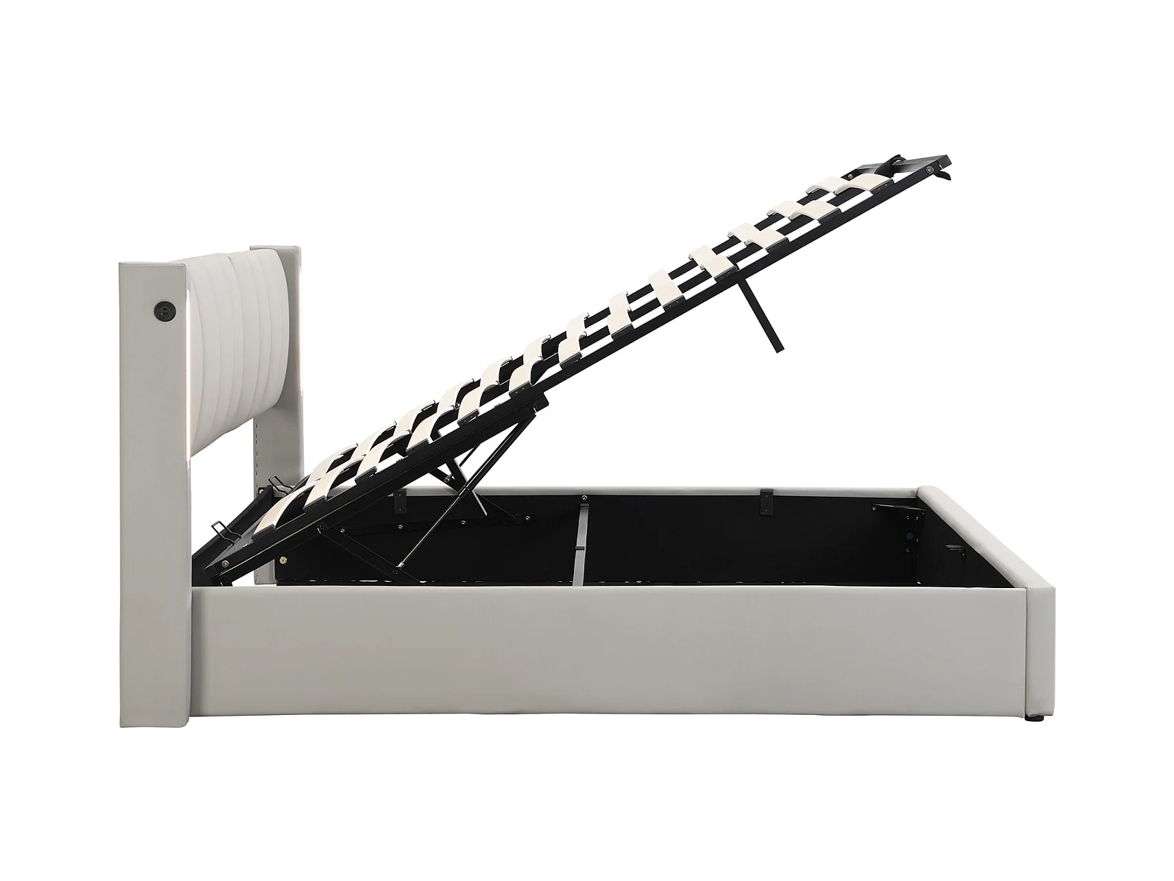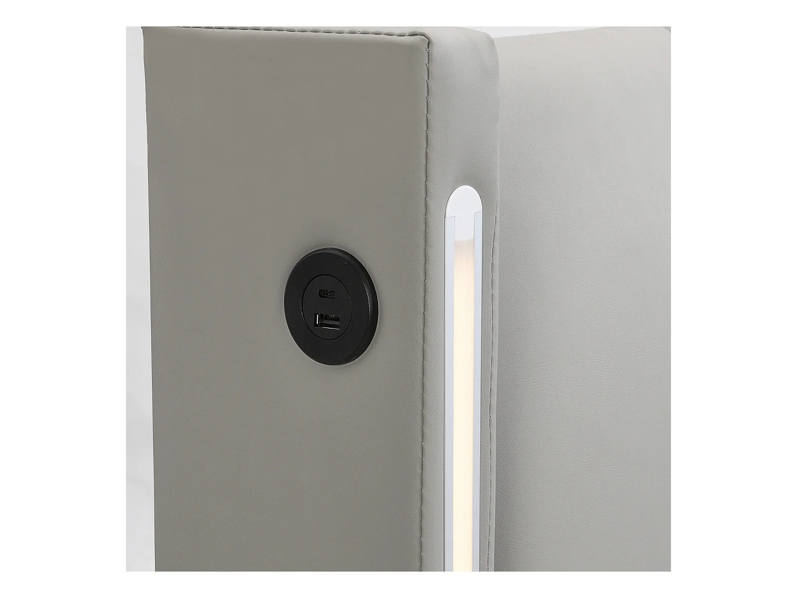 Lit coffre avec binaural, lit rembourré en PU, avec sommier à lattes, et tête de lit réglable LED et Port USB, Gris 140x200cm