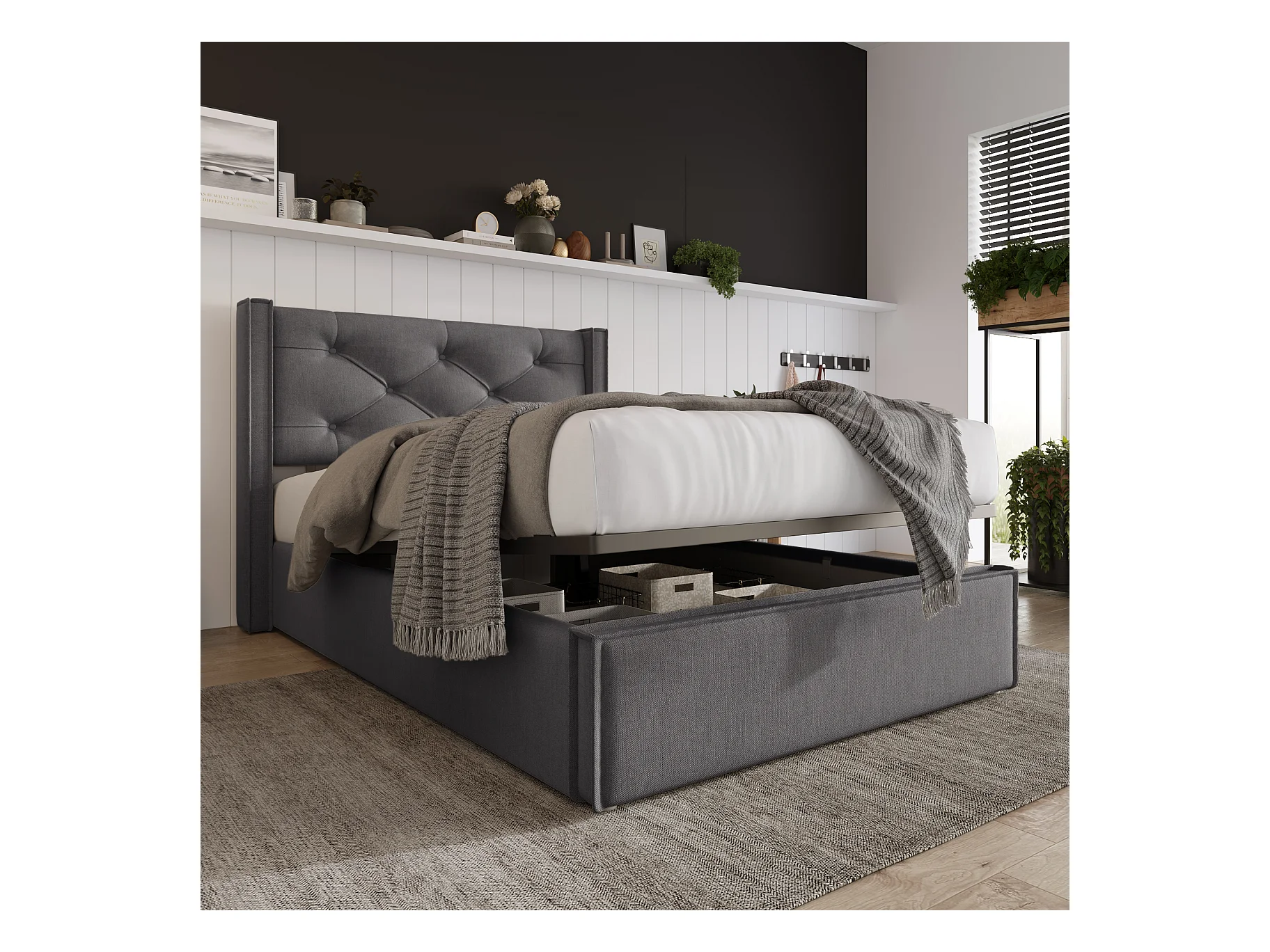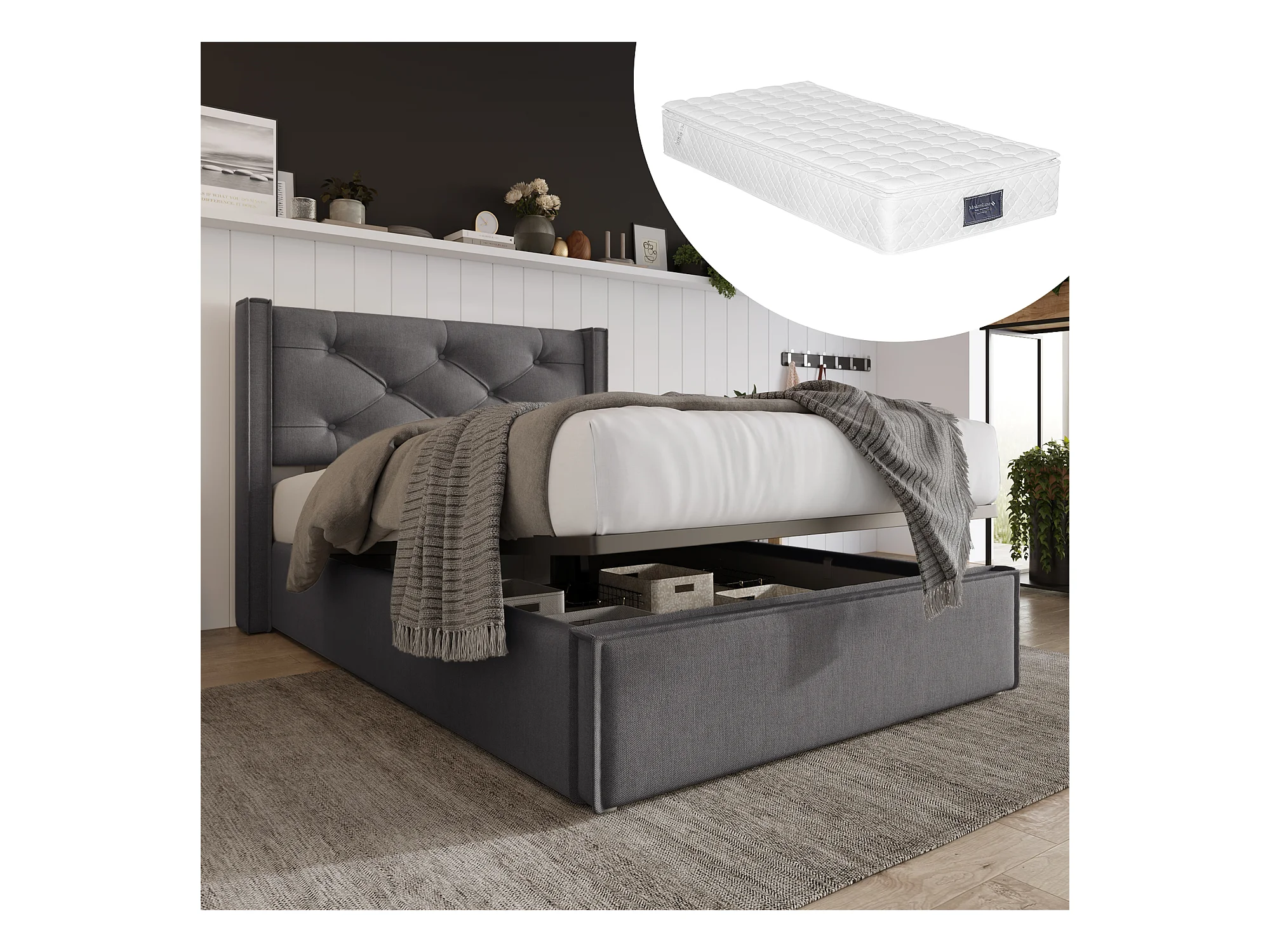 Lit coffre - avec espace de rangement - gris 90x200 cm avec matelas - Sweiko
