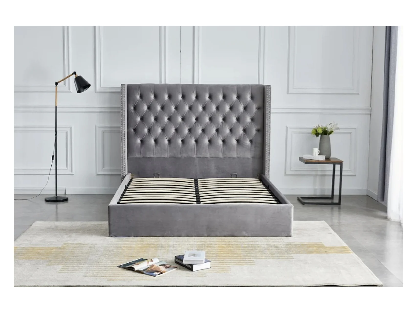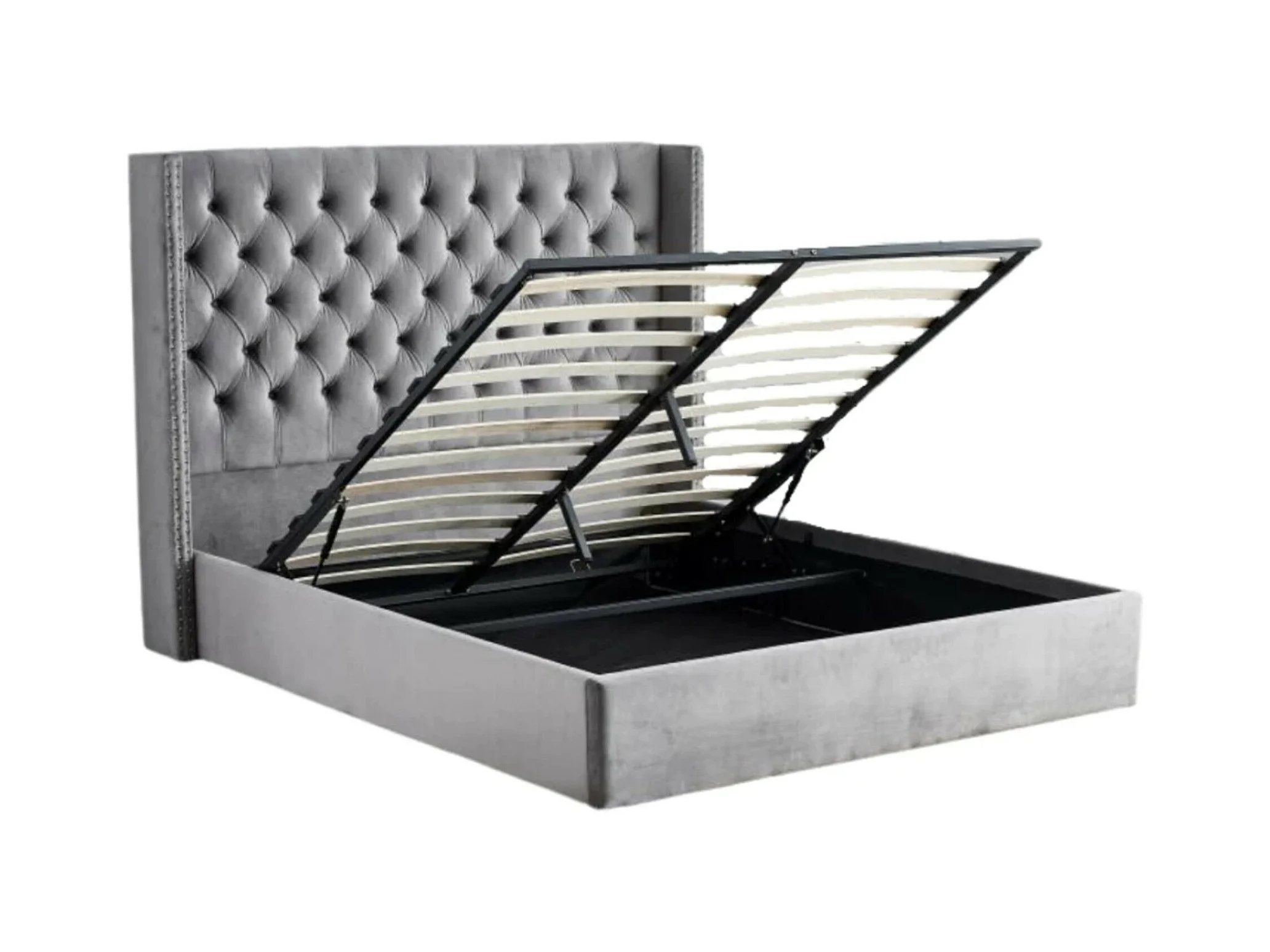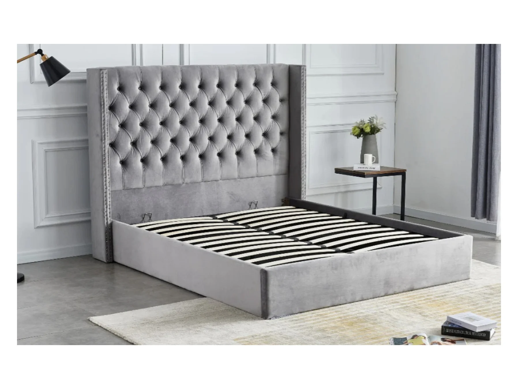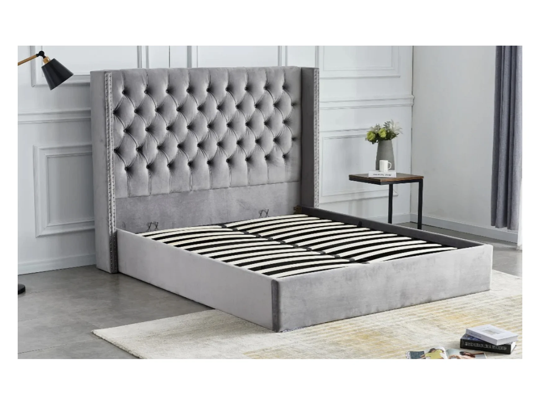 Lit coffre avec grande tête de lit capitonnée velours Loumea-Couleur Gris clair-160x200