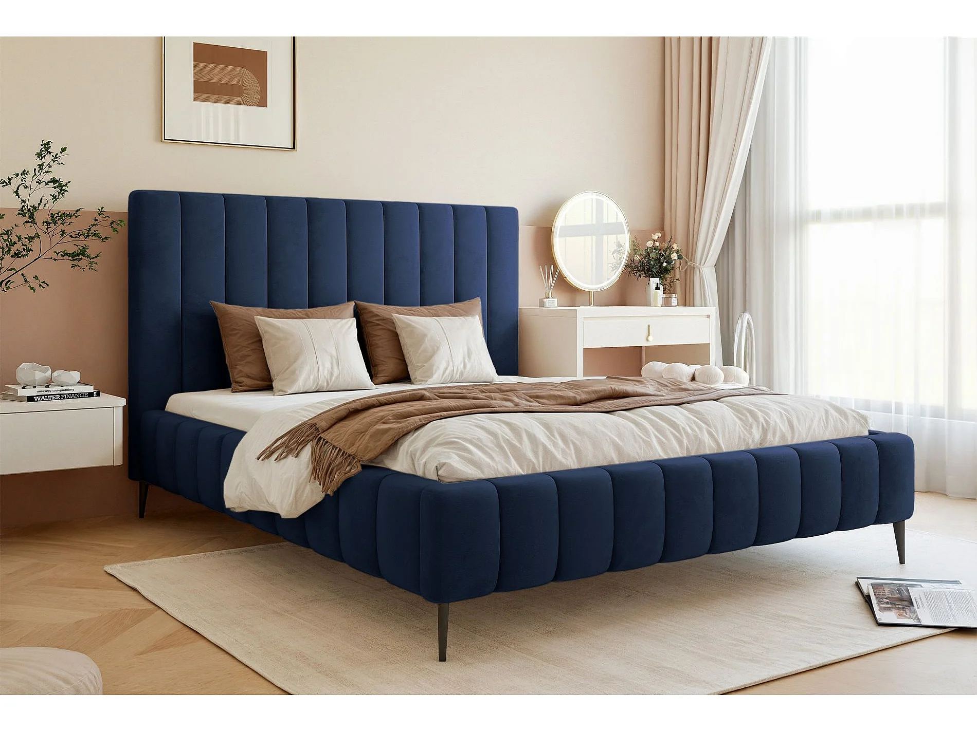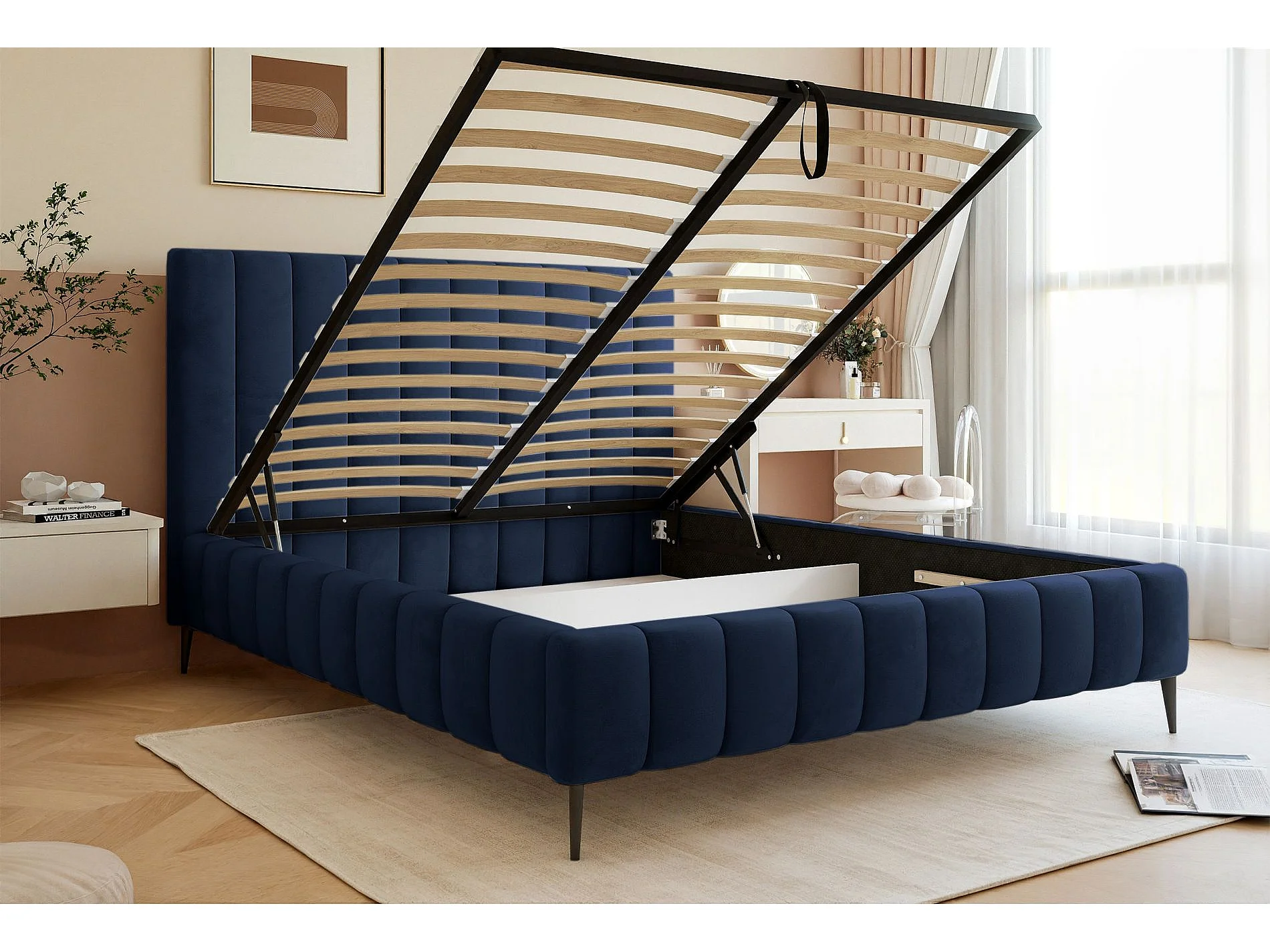 Lit coffre avec pieds - 140x200 cm - en tissu velours marine - FIARRO