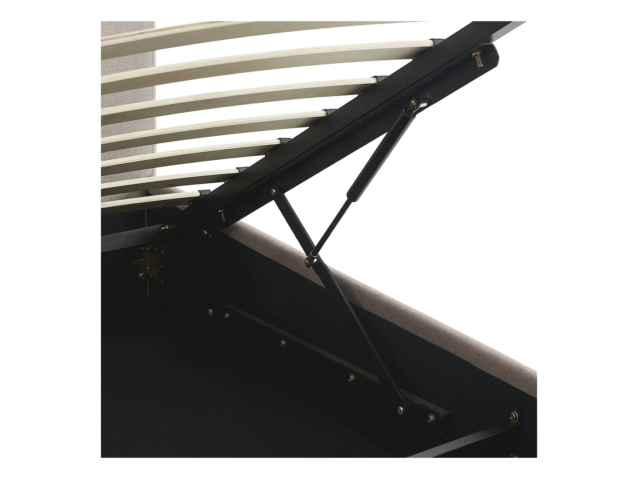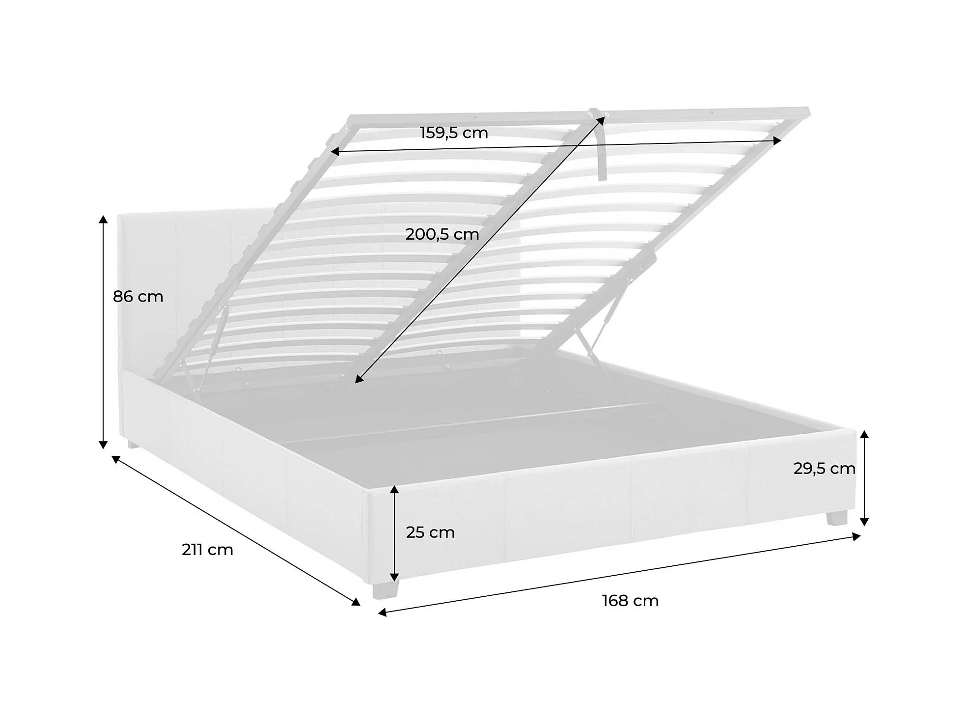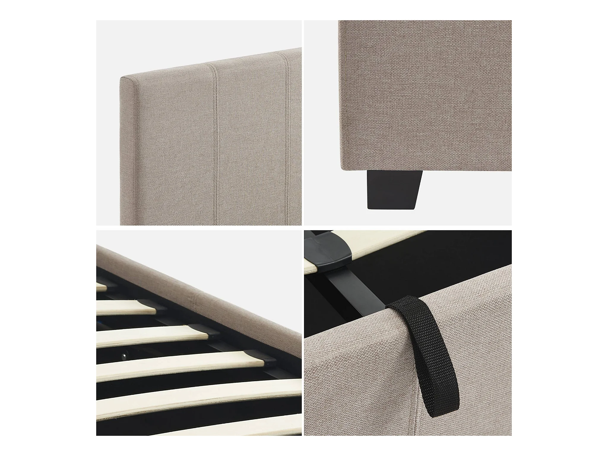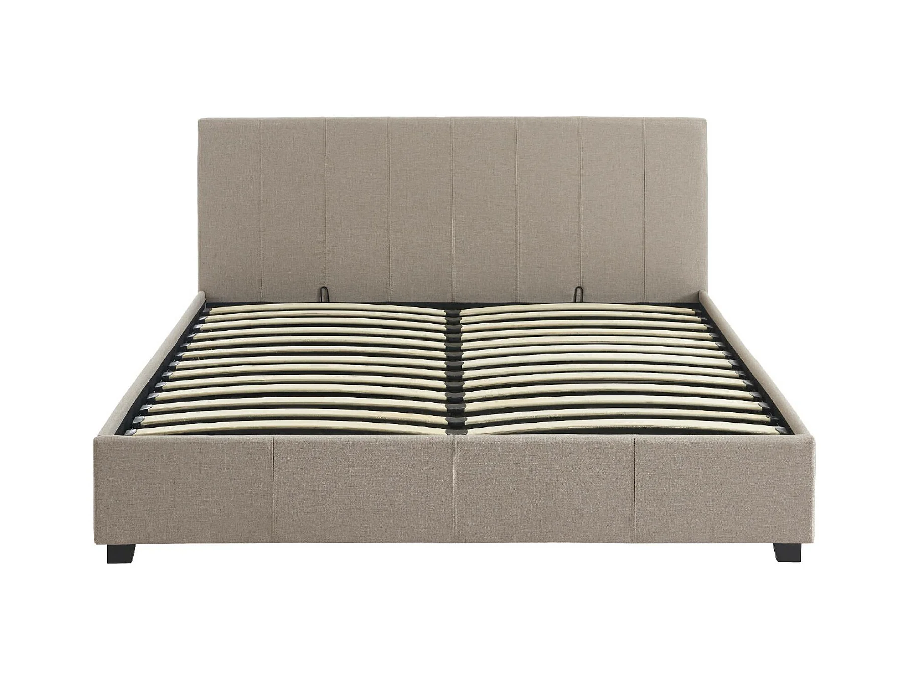 Lit coffre avec sommier à lattes et tête de lit. finition tissu beige. L211 x P168 x H86cm