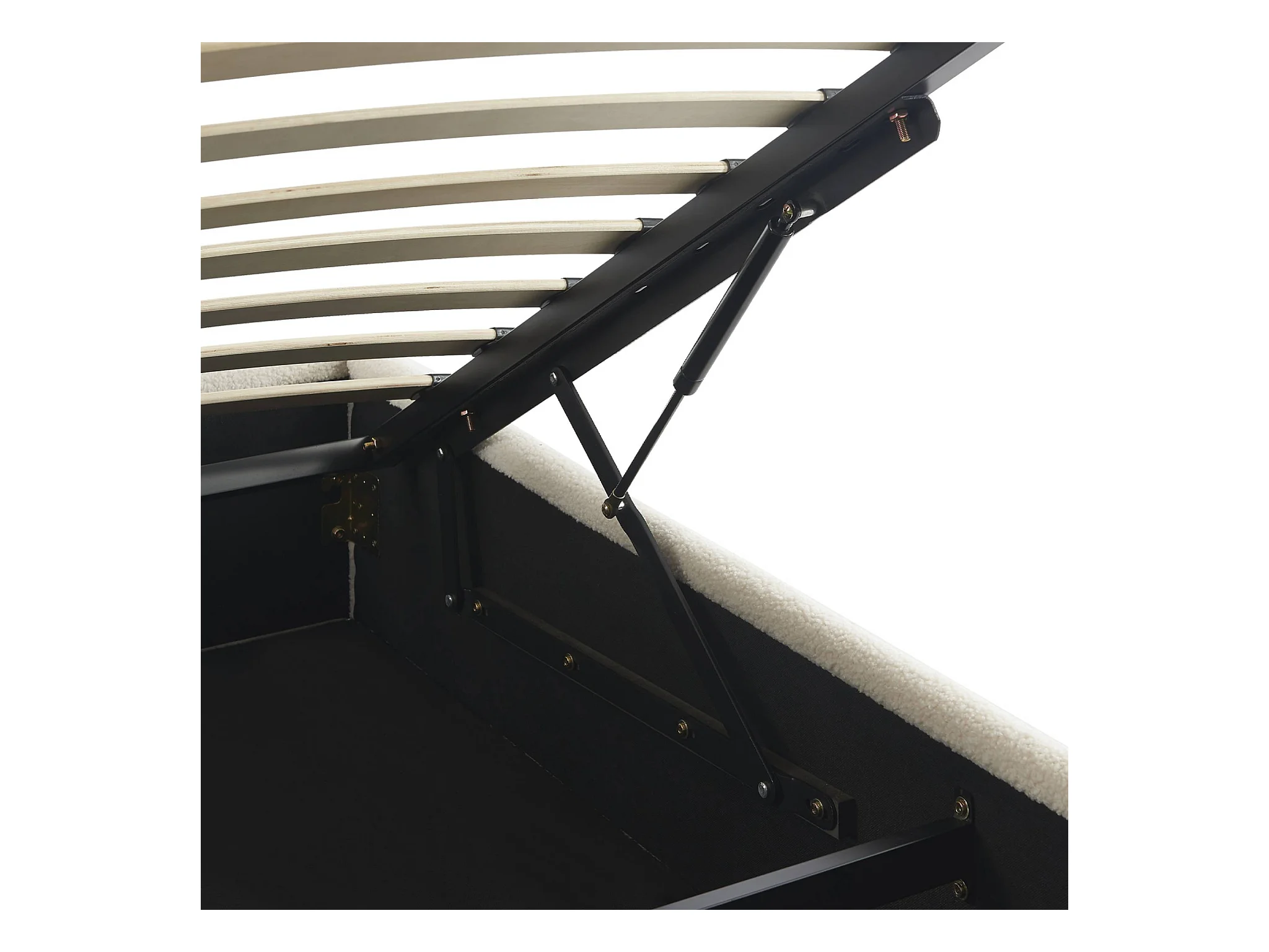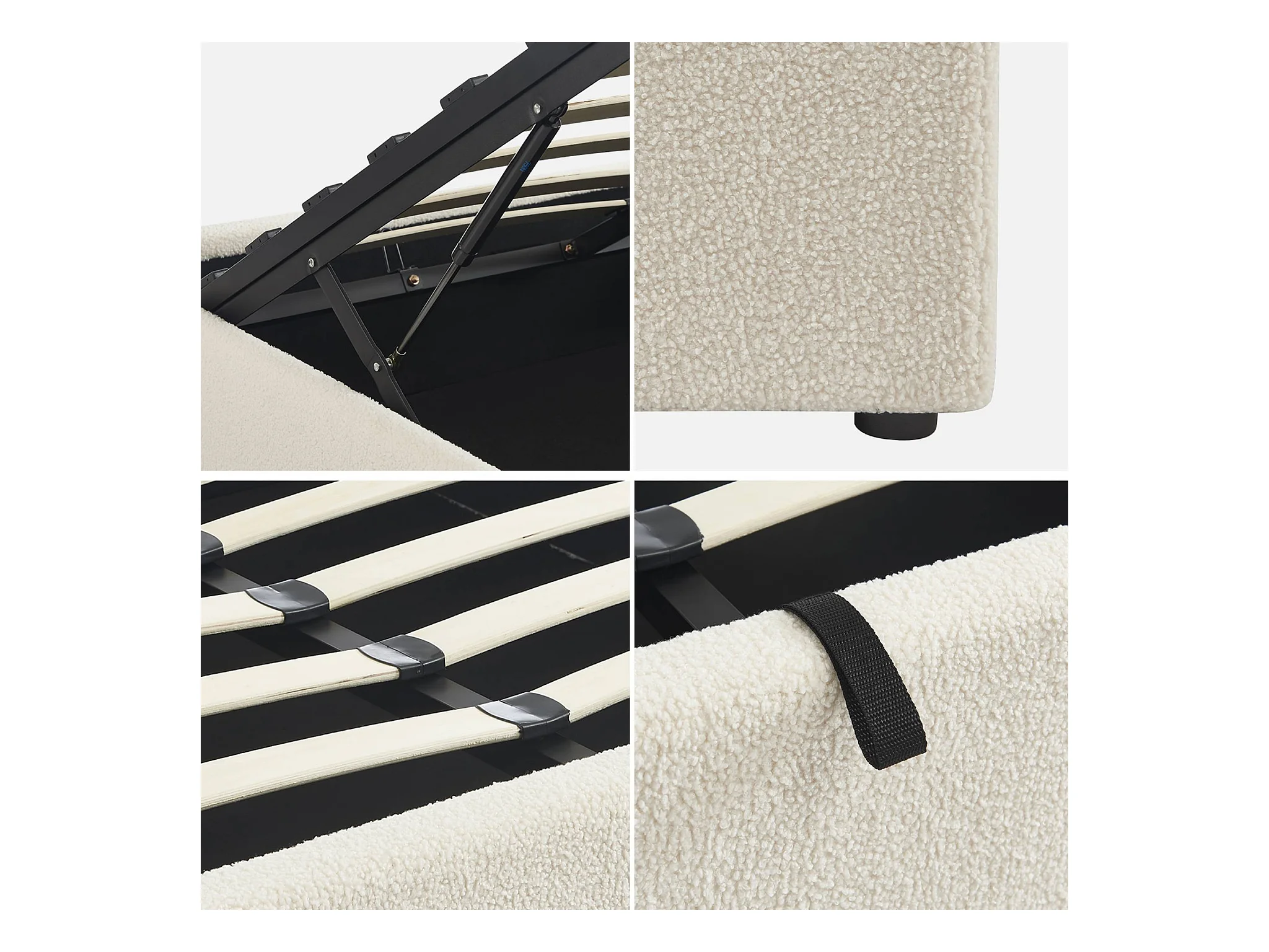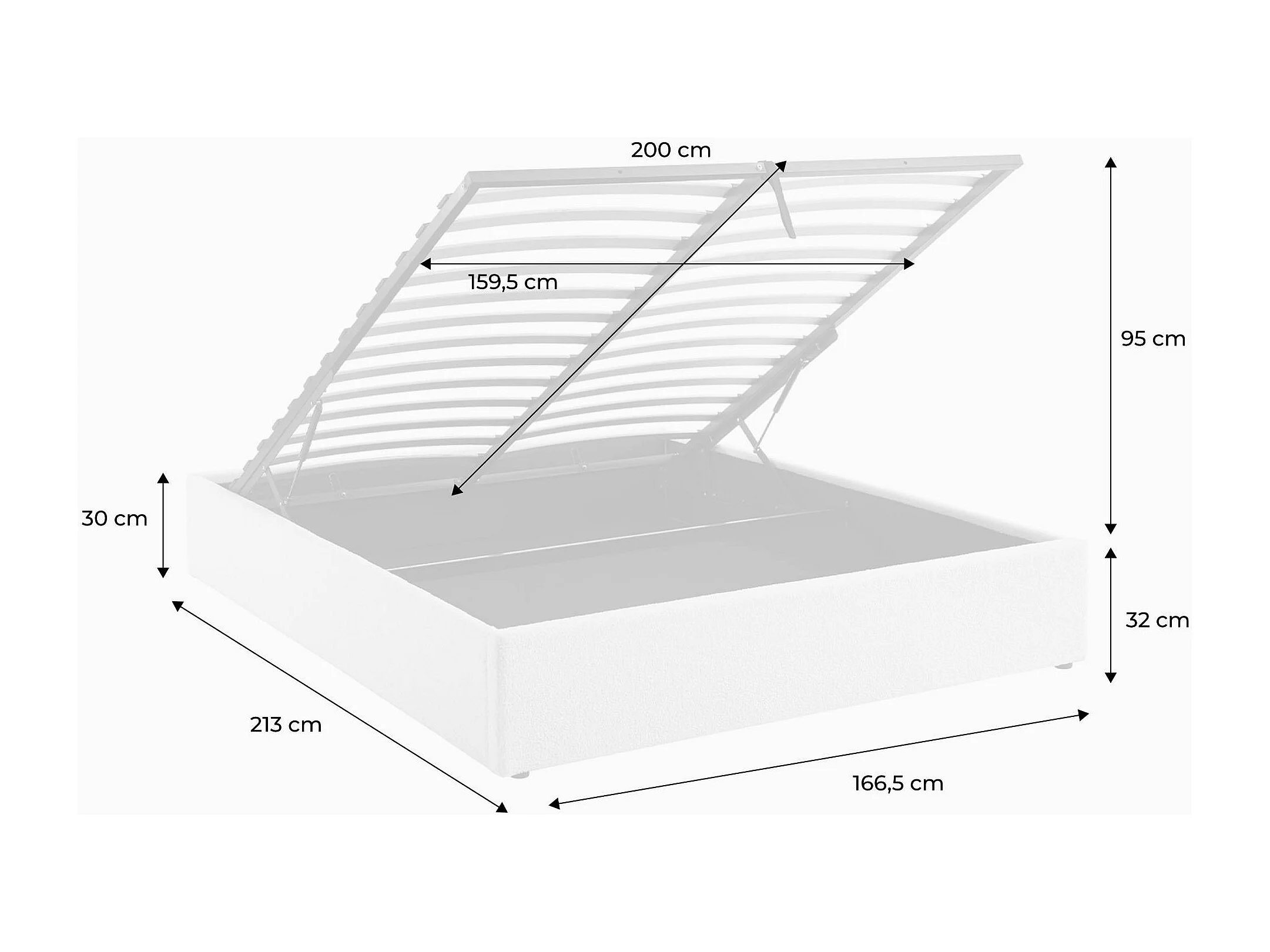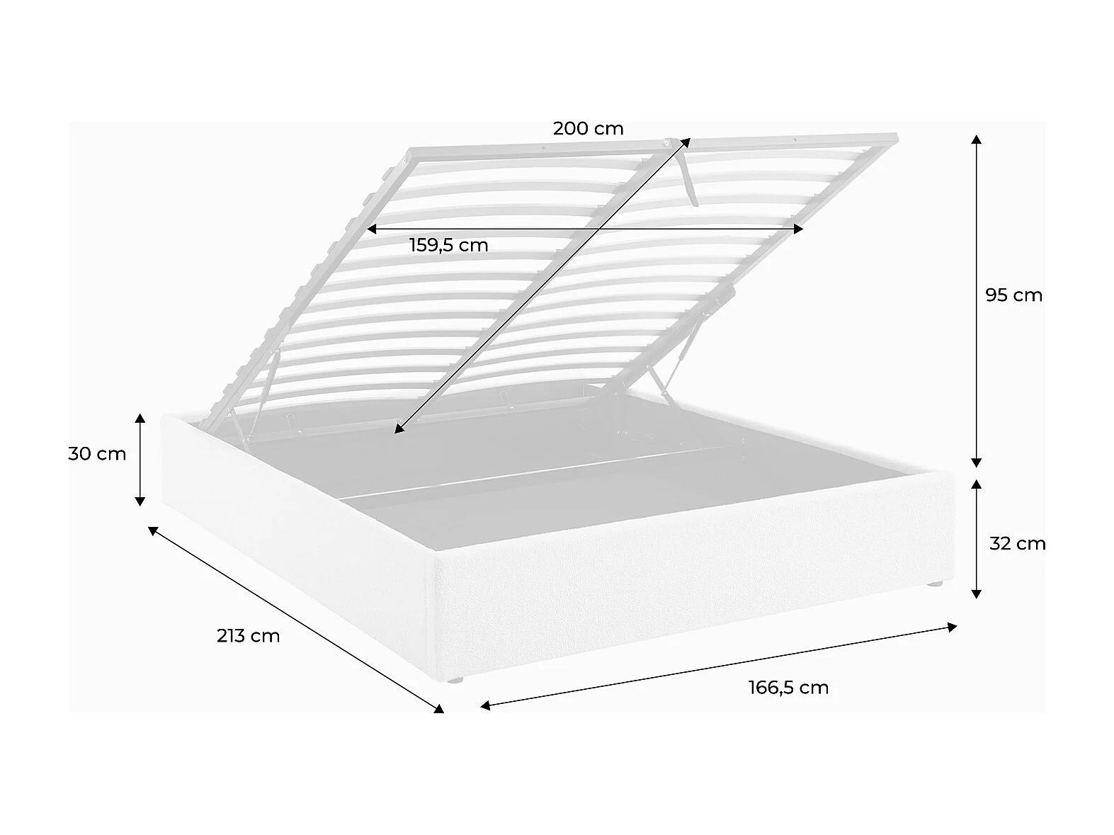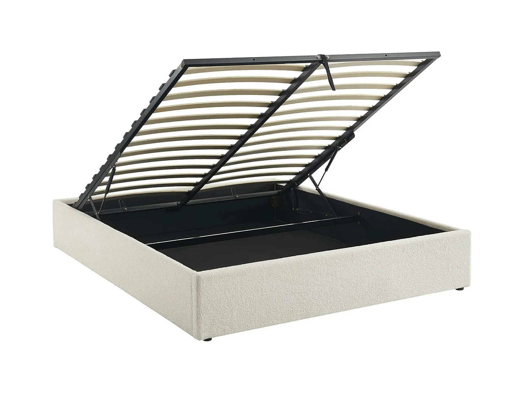 Lit coffre avec sommier à lattes. finition bouclette. blanc. L 213 x P 166.5 x H 32cm