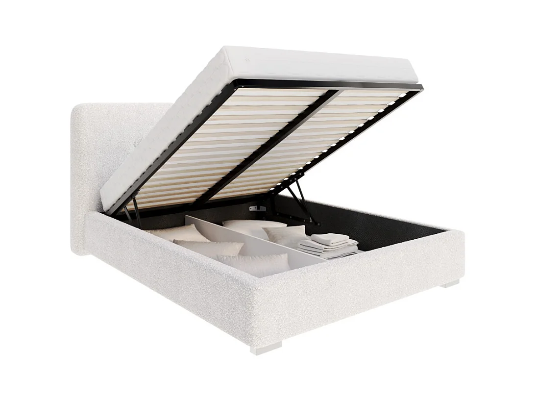 Lit Coffre Bedretto 140 x 190 cm - Tissu bouclette - avec sommier à lattes relevable Blanc