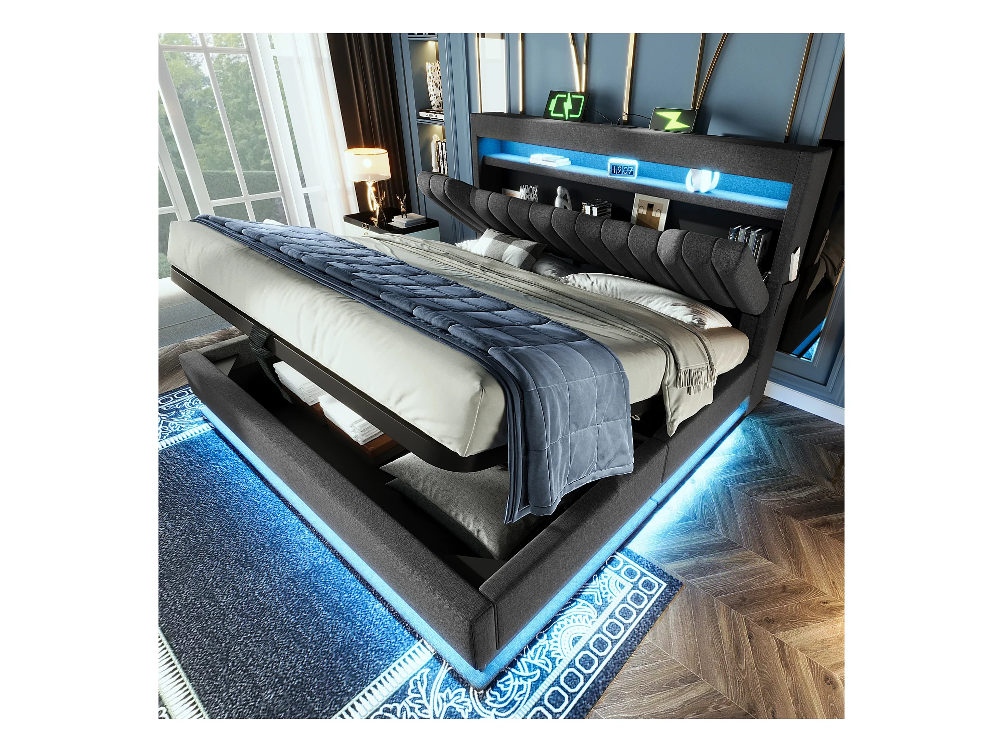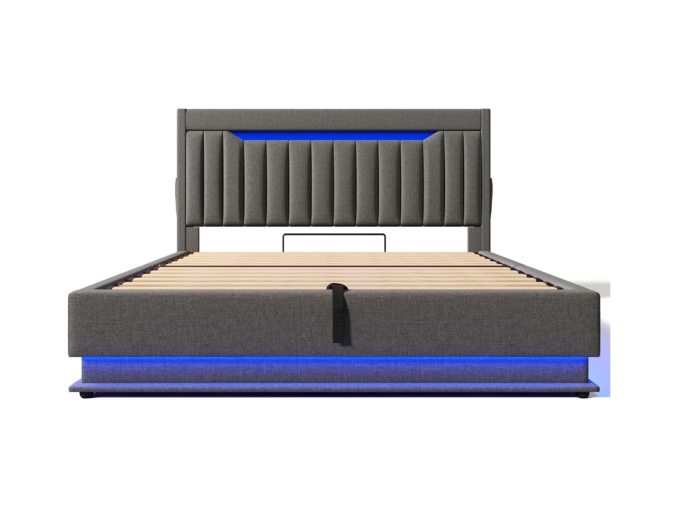 Lit coffre capitonné 160x200cm - avec LED - avec ports USB et Type-C - tissu en Lin - tête de lit avec espace de rangement - Gris