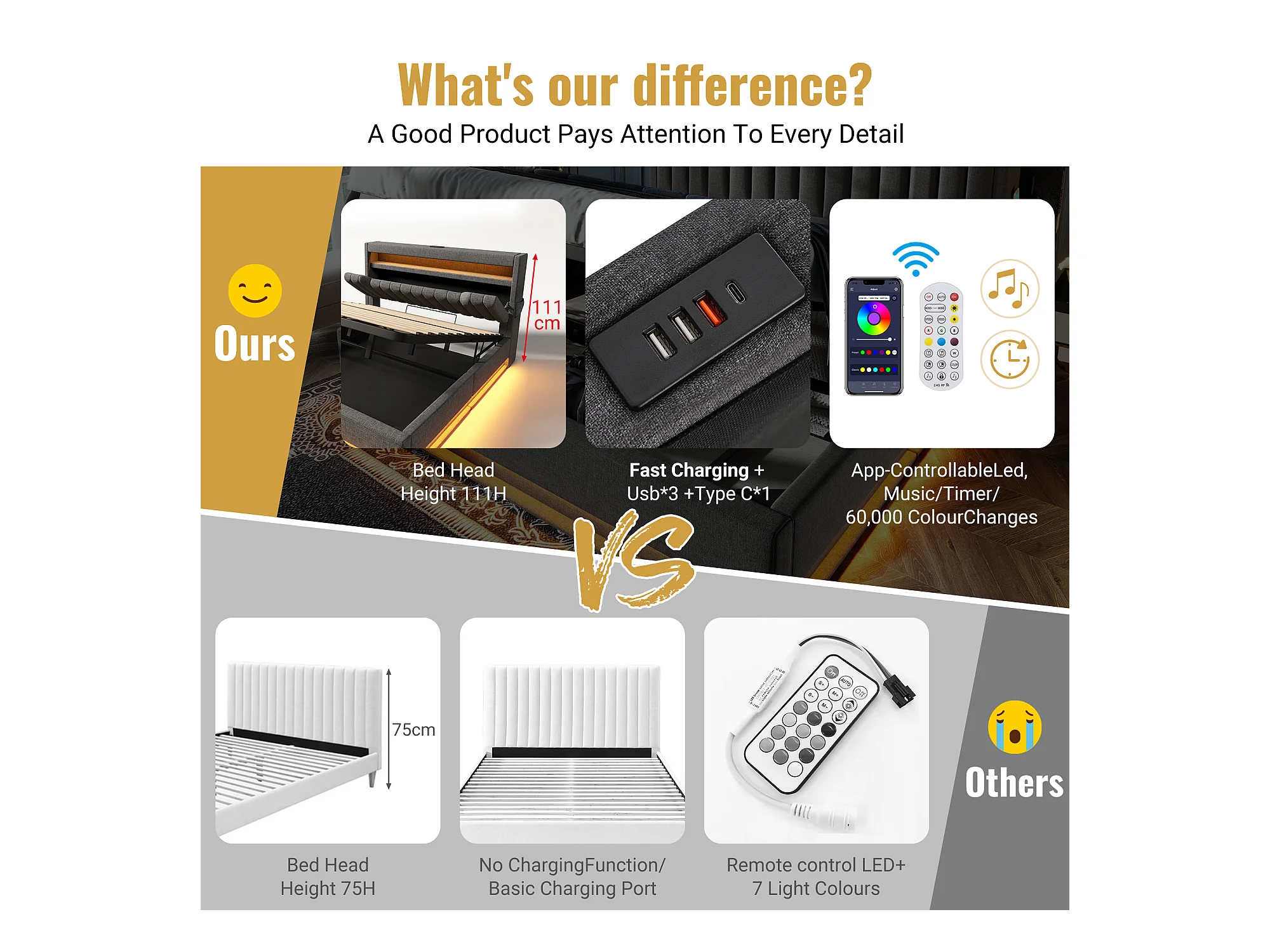 Lit coffre capitonné 180x200cm - avec LED - avec ports USB et Type-C - tissu en Lin - tête de lit avec espace de rangement - Gris