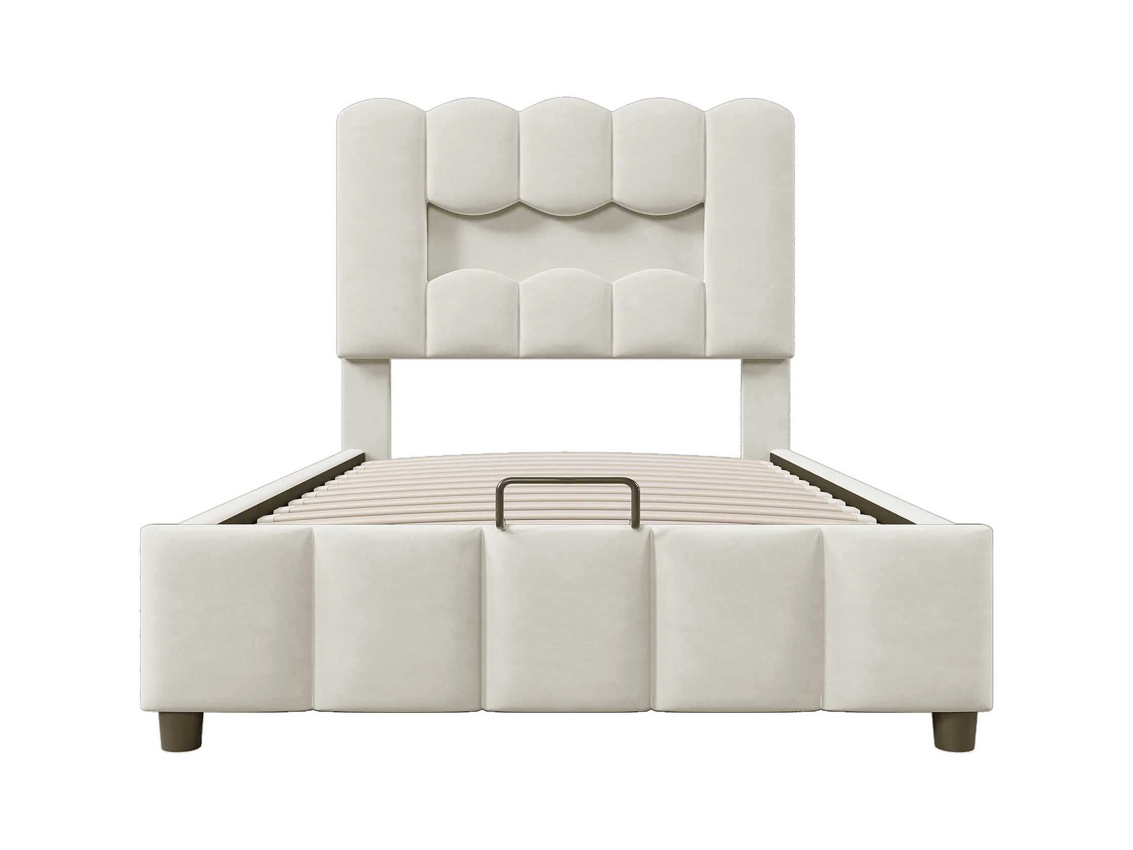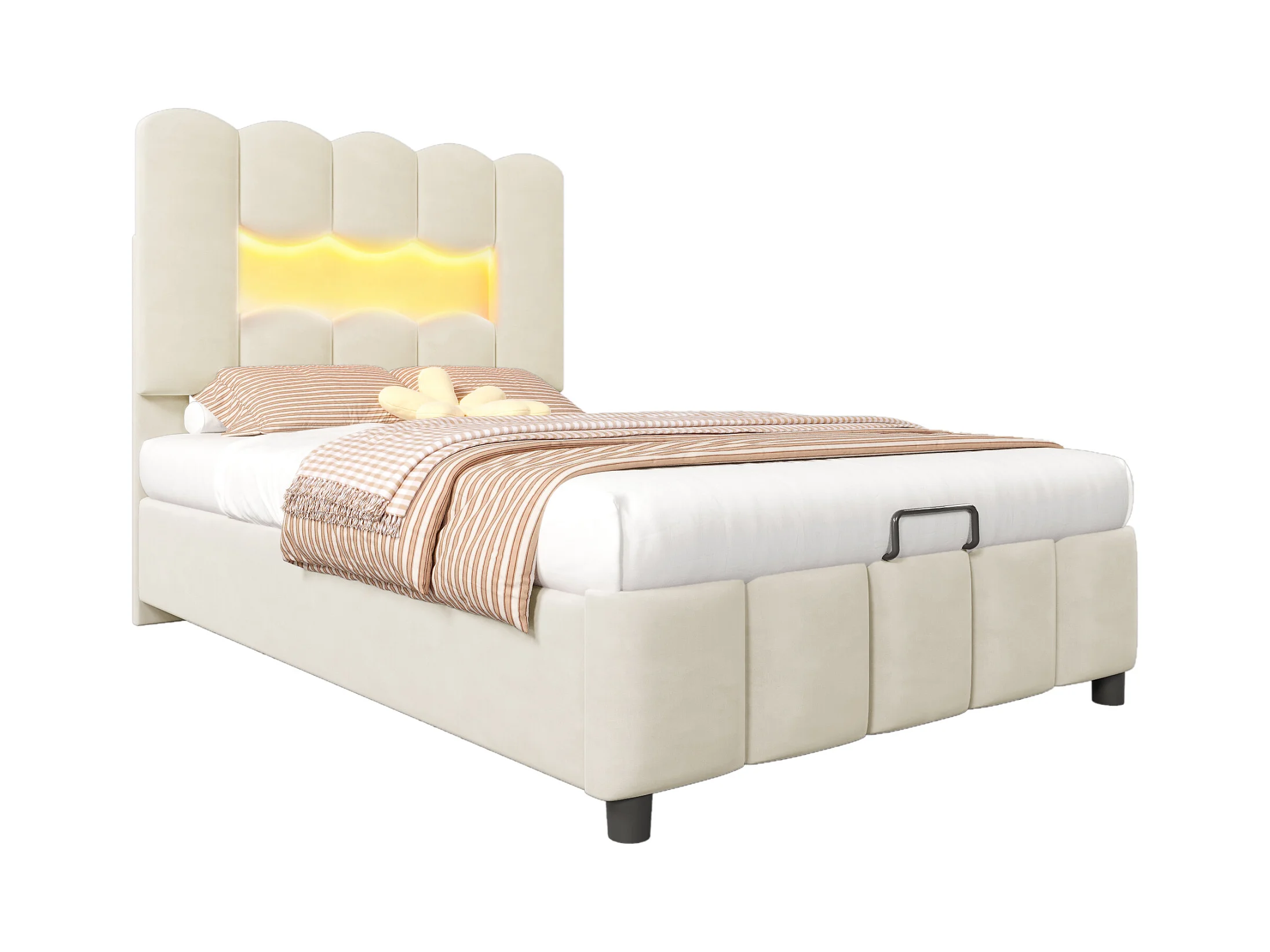 Lit coffre capitonné 90 x 200 cm - avec éclairage LED - tête de lit réglable - velours - beige (matelas non inclus)